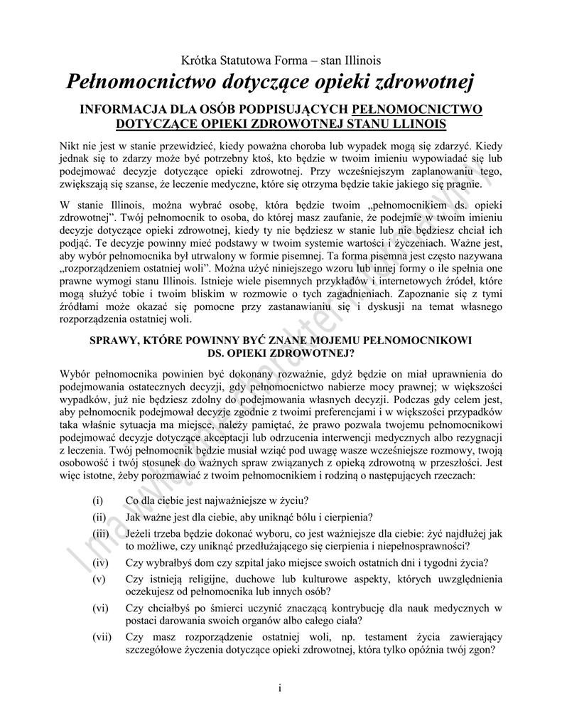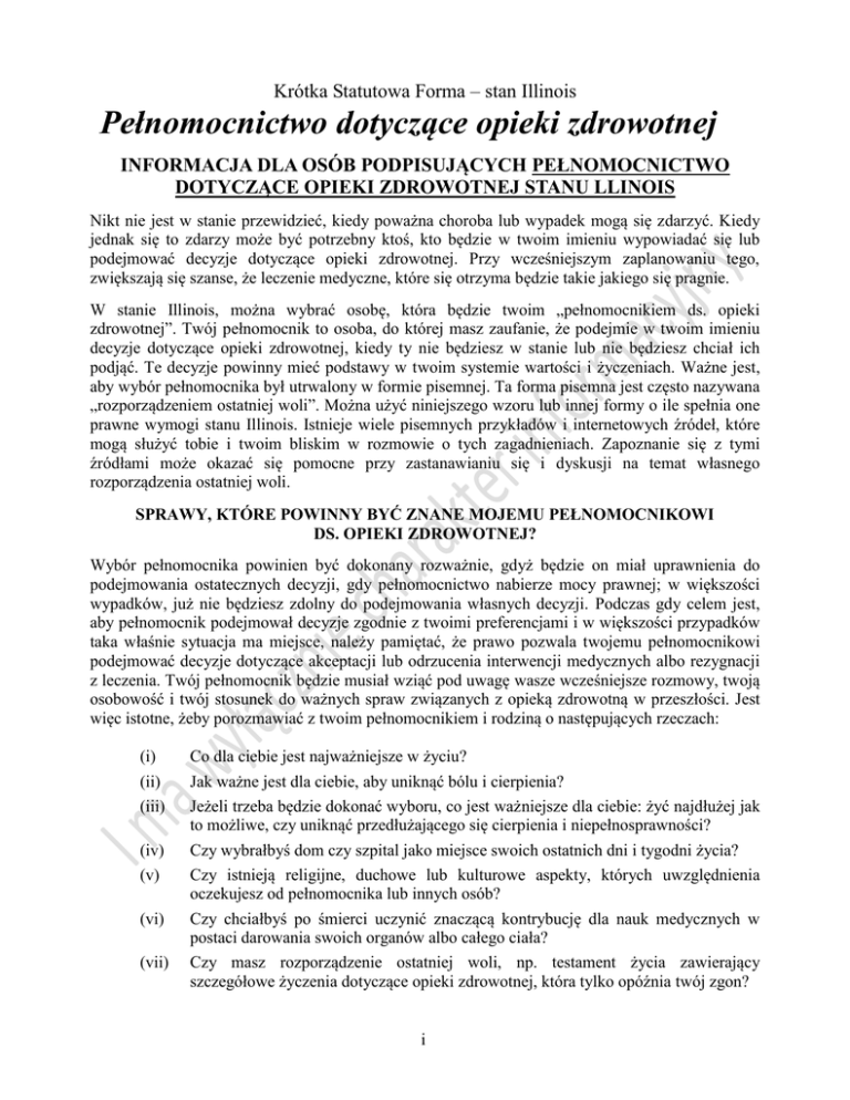 Krótka Statutowa Forma – stan Illinois Pełnomocnictwo dotyczące opieki zdrowotnej INFORMACJA DLA OSÓB PODPISUJĄCYCH PEŁNOMOCNICTWO DOTYCZĄCE OPIEKI ZDROWOTNEJ STANU LLINOIS Nikt nie jest w stanie przewidzieć, kiedy poważna choroba lub wypadek mogą się zdarzyć. Kiedy jednak się to zdarzy może być potrzebny ktoś, kto będzie w twoim imieniu wypowiadać się lub podejmować decyzje dotyczące opieki zdrowotnej. Przy wcześniejszym zaplanowaniu tego, zwiększają się szanse, że leczenie medyczne, które się otrzyma będzie takie jakiego się pragnie. W stanie Illinois, można wybrać osobę, która będzie twoim „pełnomocnikiem ds. opieki zdrowotnej”. Twój pełnomocnik to osoba, do której masz zaufanie, że podejmie w twoim imieniu decyzje dotyczące opieki zdrowotnej, kiedy ty nie będziesz w stanie lub nie będziesz chciał ich podjąć. Te decyzje powinny mieć podstawy w twoim systemie wartości i życzeniach. Ważne jest, aby wybór pełnomocnika był utrwalony w formie pisemnej. Ta forma pisemna jest często nazywana „rozporządzeniem ostatniej woli”. Można użyć niniejszego wzoru lub innej formy o ile spełnia one prawne wymogi stanu Illinois. Istnieje wiele pisemnych przykładów i internetowych źródeł, które mogą służyć tobie i twoim bliskim w rozmowie o tych zagadnieniach. Zapoznanie się z tymi źródłami może okazać się pomocne przy zastanawianiu się i dyskusji na temat własnego rozporządzenia ostatniej woli. SPRAWY, KTÓRE POWINNY BYĆ ZNANE MOJEMU PEŁNOMOCNIKOWI DS. OPIEKI ZDROWOTNEJ? Wybór pełnomocnika powinien być dokonany rozważnie, gdyż będzie on miał uprawnienia do podejmowania ostatecznych decyzji, gdy pełnomocnictwo nabierze mocy prawnej; w większości wypadków, już nie będziesz zdolny do podejmowania własnych decyzji. Podczas gdy celem jest, aby pełnomocnik podejmował decyzje zgodnie z twoimi preferencjami i w większości przypadków taka właśnie sytuacja ma miejsce, należy pamiętać, że prawo pozwala twojemu pełnomocnikowi podejmować decyzje dotyczące akceptacji lub odrzucenia interwencji medycznych albo rezygnacji z leczenia. Twój pełnomocnik będzie musiał wziąć pod uwagę wasze wcześniejsze rozmowy, twoją osobowość i twój stosunek do ważnych spraw związanych z opieką zdrowotną w przeszłości. Jest więc istotne, żeby porozmawiać z twoim pełnomocnikiem i rodziną o następujących rzeczach: (i) (ii) (iii) (iv) (v) (vi) (vii) Co dla ciebie jest najważniejsze w życiu? Jak ważne jest dla ciebie, aby uniknąć bólu i cierpienia? Jeżeli trzeba będzie dokonać wyboru, co jest ważniejsze dla ciebie: żyć najdłużej jak to możliwe, czy uniknąć przedłużającego się cierpienia i niepełnosprawności? Czy wybrałbyś dom czy szpital jako miejsce swoich ostatnich dni i tygodni życia? Czy istnieją religijne, duchowe lub kulturowe aspekty, których uwzględnienia oczekujesz od pełnomocnika lub innych osób? Czy chciałbyś po śmierci uczynić znaczącą kontrybucję dla nauk medycznych w postaci darowania swoich organów albo całego ciała? Czy masz rozporządzenie ostatniej woli, np. testament życia zawierający szczegółowe życzenia dotyczące opieki zdrowotnej, która tylko opóźnia twój zgon? i Jeżeli masz inne rozporządzenie ostatniej woli, upewnij się, że omówisz je z pełnomocnikiem, podobnie jak zawarte w nich decyzje dotyczące leczenia z uwzględnieniem własnych preferencji. Należy się upewnić, że twój pełnomocnik zgadza się przestrzegać twoich życzeń wyrażonych w rozporządzeniu ostatniej woli. JAKIEGO RODZAJU DECYZJE MOŻE PODEJMOWAĆ MÓJ PEŁNOMOCNIK? Jeżeli kiedykolwiek mogłaby zaistnieć sytuacja, w której twój lekarz miałby orzec, że nie jest możliwe, abyś sam podejmował decyzje dotyczące własnej opieki zdrowotnej lub, gdy ty nie będziesz chciał podejmować takich decyzji, twój pełnomocnik będzie mógł: (i) (ii) (iii) (iv) (v) (vi) (vii) (viii) prowadzić rozmowy z lekarzem i innymi pracownikami służby zdrowia o twoim stanie zdrowia; poznać dokumenty medyczne i upoważnić inne osoby do poznania ich; zezwolić na badania medyczne, przyjmowanie lekarstw, operacje lub podjęcie innych rodzajów leczenia; wybrać miejsce opieki oraz lekarza i pozostałych pracowników służby zdrowia; zdecydować jakie metody leczenia przyjąć, z których zrezygnować lub jakie leczenie mające utrzymać ciebie przy życiu odrzucić, jeżeli będziesz w stanie bliskim zgonu lub z małym prawdopodobieństwem powrotu do zdrowia. Istnieje możliwość włączenia przez ciebie wytycznych i/lub restrykcji dotyczących uprawnień twojego pełnomocnika; wyrazić zgodę lub nie wyrazić zgody na ofiarowanie twoich organów lub całego ciała, jeżeli sam uprzednio nie podjąłeś odpowiedniej decyzji. To może obejmować zgodę na transplantację, badania i/lub cele edukacyjne. Należy poinformować pełnomocnika czy jesteś zarejestrowany jako dawca w rejestrze First Person Consent prowadzonym przez Illinois Secretary of State lub czy zgodziłeś się podarować swoje ciało w całości na badania medyczne lub na cele edukacyjne; zdecydować co zrobić z twoim ciałem po zgonie, jeżeli nie będzie wcześniejszych ustaleń; rozmawiać z innymi bliskimi osobami w celu podjęcia najlepszej decyzji (ale do pełnomocnika należy ostatnie słowo). Twój pełnomocnik nie jest automatycznie odpowiedzialny za koszty twojej opieki zdrowotnej. KOGO POWINIENEM WYBRAĆ NA SWOJEGO PEŁNOMOCNIKA W SPRAWACH OPIEKI ZDROWOTNEJ? Możesz, ale nie musisz, wybrać członka rodziny. Twój pełnomocnik będzie odpowiedzialny za podejmowanie decyzji dotyczących leczenia medycznego, nawet jeżeli inne bliskie ci osoby będą nakłaniać cię do innej decyzji. Wybór pełnomocnika powinien być dokonany ostrożnie, ponieważ osoba ta będzie miała ostatecznie uprawnienia do podjęcia decyzji dotyczących twojego leczenia w sytuacji gdy nie będziesz już w stan