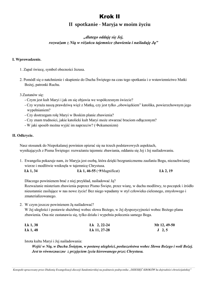 Krok II II spotkanie - Maryja w moim życiu „dlatego oddaję się Jej, rozważam z Nią w różańcu tajemnice zbawienia i naśladuję Ją” I. Wprowadzenie. 1. Zapal świecę, symbol obecności Jezusa. 2. Pomódl się o natchnienie i skupienie do Ducha Świętego na czas tego spotkania i o wstawiennictwo Matki Bożej, patronki Ruchu. 3.Zastanów się: - Czym jest kult Maryi i jak on się objawia we współczesnym świecie? - Czy wyraża naszą prawdziwą więź z Matką, czy jest tylko „obowiązkiem” katolika, powierzchownym jego wypełnianiem? - Czy dostrzegam rolę Maryi w Boskim planie zbawienia? - Czy znam trudności, jakie katolicki kult Maryi może stwarzać braciom odłączonym? - W jaki sposób można wyjść im naprzeciw? (ekumenizm) II. Odkrycie. Nasz stosunek do Niepokalanej powinien opierać się na trzech podstawowych aspektach, wynikających z Pisma Świętego: rozważaniu tajemnic zbawiania, oddaniu się Jej i Jej naśladowaniu. 1. Ewangelia pokazuje nam, że Maryja jest osobą, która dzięki bezgranicznemu zaufaniu Bogu, niezachwianej wierze i modlitwie wniknęła w tajemnicę Chrystusa. Łk 1, 46-55 (Magnificat) Łk 1, 34 Łk 2, 19 Dlaczego powinienem brać z niej przykład, naśladować Ją? Rozważanie misterium zbawienia poprzez Pismo Święte, przez wiarę, w duchu modlitwy, to początek i źródło nieustannie zasilające w nas nowe życie! Bez niego wpadamy w styl człowieka cielesnego, zmysłowego i zmaterializowanego. 2. W czym jeszcze powinienem Ją naśladować? W Jej uległości i postawie służebnej wobec słowa Bożego, w Jej dyspozycyjności wobec Bożego planu zbawienia. Ona nie zastanawia się, tylko działa i wypełnia polecenia samego Boga. Łk 1, 38 Łk 1, 48 Łk 2, 22-24 Łk 11, 27-28 Mt 12, 49-50 J 2, 5 Istota kultu Maryi i Jej naśladowania: Wejść w Nią, w Duchu Świętym, w postawę uległości, posłuszeństwa wobec Słowa Bożego i woli Bożej. Jest to równoznaczne z przyjęciem życia kierowanego przez Chrystusa. Konspekt opracowany przez Diakonię Ewangelizacji diecezji Sandomierskiej na podstawie podręcznika „DZIESIĘĆ KROKÓW ku dojrzałości chrześcijańskiej” 3. Czy w Piśmie Świętym możesz odnaleźć postawę dla postulatu oddania się Maryi? To oddanie stanowi bardzo silny akcent w katolickim kulcie maryjnym (Św. Maksymilian Maria Kolbe, akt jasnogórski), który wzbudza u niektórych, zwłaszcza wśród braci odłączonych, opory. Jak więc można to uzasadnić? Słowo „oddanie się” określa postawę osoby wobec osoby. Tylko w postawie oddania się można przyjąć oddanie się drugiej osoby. Z drugiej strony, tylko temu możemy się oddać, kto nam się oddaje przez to, że nas miłuje. Co Pismo Święte mówi o przyjęciu Maryi? Znajdź i przeczytaj fragmenty: Mt 1, 20 Łk 1, 40-45 J 19, 25-27 Czy to „przyjęcie” mogło się dokonać w inny sposób niż w kategoriach relacji międzyosobowych, a więc w postawie oddania się Maryi, czyli w postawie osobowej miłości? Zwróć uwagę na relacje pomiędzy Maryją a Jej synem Jezusem, zwłaszcza w momencie, gdy Maryja stała z Nim zespolona przez miłość pod krzyżem. Czy możesz sobie wyobrazić i przeżywać osobistą relację z Maryją na podobieństwo tych relacji ukazanych w Piśmie Świętym? III. Zrozumienie. Łączenie się z Maryją w tajemnicy zbawienia pomaga nam realizować modlitwa różańcowa, szczególnie ta z dopowiedzeniami. Ona pomaga nam zrozumieć i zgłębiać tą niepojęta tajemnicę. a. Czy kiedy patrzysz na Maryję, dostrzegasz Jej postawę służby względem Słowa Bożego? To właśnie ta cecha stanowi istotę kultu Maryjnego głoszonego przez świętego Maksymiliana Kolbego. Stworzył on pewna formułę: w=W. choć wygląda trochę tajemniczo, jest prosta w przekazie. Nasza wola powinna zrównać się z wolą Niepokalanej, gdyż Jej wola jest doskonale zjednoczona z wolą Chrystusa. b. W pierwszym kroku była mowa o postawie Chrystocentryzmu. Oddanie się Niepokalanej nie stanowi dla niego żadnego zagrożenia, jak mogłoby się na pierwszy rzut oka wydawać. Można wręcz powiedzieć, że jest jego kontynuacją. Miłość jest bowiem „przechodnia”, jeżeli miłuję kogoś, muszę też miłować tego, kogo on miłuje. Działa to na zasadzie: miłując Chrystusa - miłuję Boga Ojca, a miłując Niepokalaną (czyli oddając się Jej) – miłuję Chrystusa. c. Wniosek: Oddać się Niepokalanej, znaczy tyle, co oddać się Chrystusowi w zjednoczeniu z Jej oddaniem się Chrystusowi. IV. Zastosowanie. 1. Poprzez postawę miłości Maryi stojącej pod krzyżem, zagłęb się w tajemnicę śmierci Jezusa. Uczyń to poprzez odmówienie dziesiątki różańca z dopowiedzeniami. 2. Zastanów się, w jakim stopniu Maryja uczestniczy w Twoim życiu. Czy zawsze pamiętasz, ze jest Ona Twoja Matką i że możesz się do Niej zawsze zwrócić? Konspekt opracowany przez Diakonię Ewangelizacji diecezji Sandomierskiej na podstawie podręcznika „DZIESIĘĆ KROKÓW ku dojrzałości chrześcijańskiej”