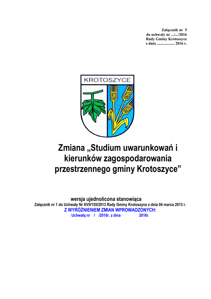 Załącznik nr 5 do uchwały nr .../.../2016 Rady Gminy Krotoszyce z dnia .................. 2016 r. Zmiana „Studium uwarunkowań i kierunków zagospodarowania przestrzennego gminy Krotoszyce” wersja ujednolicona stanowiąca Załącznik nr 1 do Uchwały Nr XVII/155/2013 Rady Gminy Krotoszyce z dnia 04 marca 2013 r. Z WYRÓŻNIENIEM ZMIAN WPROWADZONYCH: Uchwałą nr / /2016r. z dnia 2016r. Zmiana Studium uwarunkowań i kierunków zagospodarowania przestrzennego gminy Krotoszyce SPIS TREŚCI 1. Źródła i materiały wyjściowe 1.1. 1.2. 1.3. 1.4. 1.5. 1.6. 2. Studia, analizy, programy stanowiące podstawę opracowania Plany, studia, analizy, programy polityki przestrzennej i plan zagospodarowania przestrzennego województwa dolnośląskiego Studium uwarunkowań i kierunków zagospodarowania przestrzennego gminy Miejscowe plany zagospodarowania przestrzennego gminy Krotoszyce Opracowania statystyczne Analizy własne Uwarunkowania 2.1. 2.1.1. 2.2. 2.2.1. 2.2.2. 2.2.3. 2.2.4. 2.3. 2.3.1. 2.3.2. 2.3.3. 2.3.4. 2.3.5. 2.3.6. 2.3.7. 2.4. 2.4.1. 2.4.2. 2.4.3. 2.4.4. 2.5. 2.5.1. 2.5.1.1. 2.5.2. 2.5.3. 2.5.4. 2.5.5. 2.5.6. 2.5.7. 2.5.8. 2.6. 2.6.1. 2.6.2. 2.6.3. 2.7. 2.8. Dotychczasowe przeznaczenie, zagospodarowanie i uzbrojenie terenu Tereny specjalne Stan ładu przestrzennego i wymogi jego ochrony Zgodność zagospodarowania terenu gminy z uwarunkowaniami przyrodniczymi Zgodność zagospodarowania terenu gminy z uwarunkowaniami kulturowymi Zgodność zagospodarowania terenu gminy z uwarunkowaniami społecznogospodarczymi Wizerunek gminy Stan środowiska, w tym rolniczej i leśnej przestrzeni produkcyjnej, wielkości i jakości zasobów wodnych oraz wymogów ochrony środowiska, przyrody i krajobrazu kulturowego Rolnicza przestrzeń produkcyjna Leśna przestrzeń produkcyjna Wielkość i jakość zasobów wodnych Powietrze atmosferyczne Odpady Hałas Promieniowanie elektromagnetyczne Stan dziedzictwa kulturowego i zabytków oraz dóbr kultury współczesnej Obszary i obiekty objęte ochroną konserwatorską Opis obiektów i elementów zagospodarowania przestrzennego przedstawiających wartość kulturową w gminie Krotoszyce Dobra kultury współczesnej Ochrona krajobrazu kulturowego Warunki i jakość życia mieszkańców, w tym ochrona ich zdrowia Potencjał i rozwój demograficzny Prognozy demograficzne i społeczne na potrzeby zmiany studium „B” Warunki mieszkaniowe Opieka medyczna Oświata i wychowanie Zróżnicowanie i dostępność usług Sport i rekreacja Zatrudnienie i źródła utrzymania Bezrobocie Zagrożenia bezpieczeństwa ludności i jej mienia Zagrożenie powodziowe Zagrożenie osuwaniem się mas ziemnych Zagrożenie bezpieczeństwa publicznego Stan prawny gruntów Występowanie obiektów i terenów chronionych na podstawie przepisów odrębnych str. 9 9 13 17 19 19 24 31 34 37 38 41 41 44 45 47 47 53 56 59 64 65 68 72 74 96 100 100 110 110 117 119 121 124 125 127 129 134 135 135 137 137 139 141 5 Zmiana Studium 2.8.1. 2.8.2. 2.8.3. uwarunkowań i kierunków zagospodarowania przestrzennego gminy Krotoszyce Pomniki przyrody ożywionej System Natura 2000 (europejska sieć ekologiczna) System Econet-Polska (ekologiczny system obszarów chronionych) Występowanie obszarów naturalnych zagrożeń geologicznych Występowanie udokumentowanych złóż kopalin oraz zasobów wód podziemnych Udokumentowane złoża kopalin Główne Zbiorniki Wód Podziemnych Występowanie terenów górniczych wyznaczonych na podstawie przepisów odrębnych Stan systemów komunikacji i infrastruktury technicznej, w tym stopnia uporządkowania gospodarki wodno-ściekowej, energetycznej oraz gospodarki odpadami Komunikacja drogowa Komunikacja kolejowa Komunikacja wodna Komunikacja lotnicza Zaopatrzenie w wodę Gospodarka ściekowa Zaopatrzenie w gaz ziemny Zaopatrzenie w ciepło Elektroenergetyka Telekomunikacja Gospodarka odpadami Odnawialne źródła energii Zadania służące realizacji ponadlokalnych celów publicznych Bilans terenów przeznaczonych pod zabudowę na potrzeby zmiany studium „B” Zapotrzebowanie na nową zabudowę – zmiana studium „B” 141 142 142 145 145 3. Kierunki zagospodarowania przestrzennego 179 3.1. Kierunki zmian w strukturze przestrzenno-funkcjonalnej gminy oraz w przeznaczeniu terenów Podział gminy Krotoszyce na obszary Kierunki i wskaźniki dotyczące zagospodarowania oraz użytkowania terenów, w tym tereny wyłączone spod zabudowy Mieszkalnictwo Usługi Tereny produkcji rolnej i tereny aktywności gospodarczej Zieleń Wody Tereny specjalne Tereny wyłączone spod zabudowy Obszary oraz zasady ochrony środowiska i jego zasobów, ochrony przyrody, krajobrazu kulturowego i uzdrowisk Ochrona powietrza Ochrona przed hałasem i promieniowaniem elektromagnetycznym niejonizującym Ochrona wód podziemnych i powierzchniowych Ochrona powierzchni ziemi (gleb i kopalin) Ochrona przyrody i krajobrazu Obszary i zasady ochrony dziedzictwa kulturowego i zabytków oraz dóbr kultury współczesnej Obszary objęte ochrona konserwatorską Obiekty objęte ochroną konserwatorską Parki kulturowe 183 2.9. 2.10. 2.10.1. 2.10.2. 2.11. 2.12. 2.12.1. 2.12.2. 2.12.3. 2.12.4. 2.12.5. 2.12.6. 2.12.7. 2.12.8. 2.12.9. 2.12.10. 2.12.11. 2.12.12. 2.13. 2.14. 2.14.1. 3.1.1. 3.2. 3.2.1. 3.2.2. 3.2.3. 3.2.4. 3.2.5. 3.2.6. 3.2.7. 3.3. 3.3.1. 3.3.2. 3.3.3. 3.3.4. 3.3.5. 3.4. 3.4.1. 3.4.2. 3.4.3. 6 145 146 149 150 150 155 155 156 156 158 159 160 160 162 163 164 168 172 177 184 202 202 205 206 206 208 208 209 210 211 212 213 216 218 251 252 256 256 Zmiana Studium uwarunkowań i kierunków zagospodarowania przestrzennego gminy Krotoszyce 3.4.4. 3.5. 3.5.1. 3.5.2. 3.5.3. 3.5.4. 3.5.5. 3.5.6. 3.5.7. 3.5.8. 3.5.9. 3.5.10. 3.5.11. 3.5.12. 3.6. 3.7. 3.8. 3.8.1. 3.8.2. 3.8.3. 3.8.4. 3.9. 3.9.1. 3.9.2. 3.9.3. 3.9.4. 3.9.5. 3.10. 3.10.1. 3.10.2. 3.11. 3.11.1. 3.11.2. 3.12. 3.13. 3.14. 3.15. Dobra kultury współczesnej Kierunki rozwoju systemów komunikacji i infrastruktury technicznej Komunikacja drogowa K