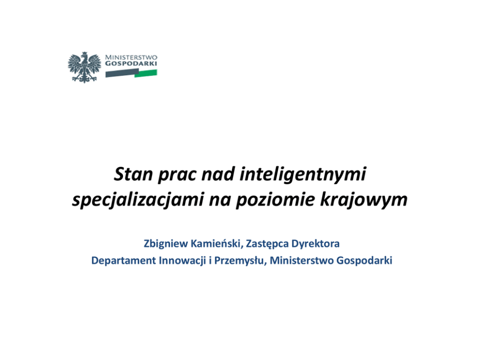 Warszawa, 28 czerwca 2013 r. Stan prac nad inteligentnymi specjalizacjami na poziomie krajowym Zbigniew Kamieński, Zastępca Dyrektora Departament Innowacji i Przemysłu, Ministerstwo Gospodarki Koncepcja inteligentnych specjalizacji UE Strategia 2020 – Strategia na rzecz inteligentnego i zrównoważonego rozwoju sprzyjającego włączeniu społecznemu (poziom UE) cel: osiągnięcie wzrostu gospodarczego, który będzie inteligentny, zrównoważony i sprzyjający włączeniu społecznemu Opracowanie przez Państwa Członkowskie UE i ich regiony ram strategicznych na rzecz inteligentnej specjalizacji, wskazujących preferencje w udzielaniu wsparcia rozwoju B+R+I w ramach nowej perspektywy finansowej 2014-2020 Wskazanie inteligentnych specjalizacji zostało wskazane przez KE jako warunek ex ante warunkujący wsparcie w nowych programach operacyjnych Koncepcja inteligentnych specjalizacji UE Efektem opracowania ram strategicznych na rzecz inteligentnej specjalizacji będzie wskazanie obszarów specjalizacji wraz z mechanizmem weryfikacji i aktualizacji tego wyboru w trakcie realizacji strategii. koncentracja na priorytetowych obszarach, w których państwo lub region dysponują przewagą/zdolnościami lub posiadają potencjał rozwojowy transformacja społecznogospodarcza kraju lub regionu poprawa stopnia wdrożenia innowacyjnych rozwiązań w przedsiębiorstwach bardziej efektywne stymulowanie nakładów prywatnych na B+R Ramy strategiczne krajowych inteligentnych specjalizacji Ramy strategiczne dla krajowych inteligentnych specjalizacji określa Strategia Innowacyjności i Efektywności Gospodarki (SIiEG), natomiast szczegółowe zapisy w tym zakresie oraz lista zidentyfikowanych krajowych inteligentnych specjalizacji, będą ujęte w Programie Rozwoju Przedsiębiorstw Strategia Innowacyjności i Efektywności Gospodarki (SIiEG) Program Rozwoju Przedsiębiorstw (PRP) krajowe ramy strategiczne na rzecz inteligentnych specjalizacji dokument strategiczny Ministerstwa Gospodarki w zakresie rozwoju przedsiębiorczości i innowacyjności polskiej gospodarki dokument wykonawczy do SIiEG Popytowe podejście do innowacyjności – od rynku do pomysłu identyfikacja obszarów inteligentnej specjalizacji w odpowiedzi na popyt rynkowy i innowacje gotowe do zastosowania przez biznes w celu podnoszenia konkurencyjności i innowacyjności polskiej gospodarki dostosowanie prac naukowo-badawczych do obszarów zainteresowań przedsiębiorców i wyzwań społecznych Efekt: -przekroczenie innowacyjnej „doliny śmierci” poprzez komercjalizację wyników B+R i wdrożenie innowacji (wzrost konkurencyjności polskich firm) -zwiększenie roli przedsiębiorców w tworzeniu polityki innowacyjności kraju w oparciu o istniejący potencjał rynkowy i potrzeby społeczno-gospodarcze Proces identyfikacji krajowych inteligentnych specjalizacji Foresight technologiczny przemysłu – InSight2030 Projekt określający obszary i technologie przemysłowe, których rozwój do 2030 r. stanie się siłą napędową polskiej gospodarki Przebieg prac analitycznych: metoda desk research, burza mózgów, analiza SWOT, PEST, krzyżowa analiza wpływów, panele eksperckie, badania metodą Delphi, mapy drogowe, atlasy technologiczne, budowa scenariuszy Konsultacje społeczne (I-II kwartał 2012 r.) oraz spotkania z przedstawicielami branż przemysłowych (III-IV kwartał 2012 r.) w celu weryfikacji listy technologii oraz obszarów przemysłowych zidentyfikowanych w ramach projektu Proces identyfikacji krajowych inteligentnych specjalizacji Krajowy Program Badań Dokument wskazujący strategiczne kierunki badań naukowych i prac rozwojowych, określające cele i założenia długoterminowej polityki naukowotechnicznej i innowacyjnej państwa Przy określaniu kierunków badań naukowych i prac rozwojowych uwzględniono m.in. globalne wyzwania społeczne, globalne trendy rozwojowe, wyniki Narodowego Programu Foresight „Polska 2020”, analizę zapotrzebowania na wsparcie naukowe przeprowadzoną przez NCBiR w 2009r. wśród wiodących gałęzi przemysłu w Poslce oraz wyniki ewaluacji Krajowego Programu Badań Naukowych i Prac Rozwojowych ustanowionego w 2008 r. Proces identyfikacji krajowych inteligentnych specjalizacji Foresight technologiczny przemysłu – InSight2030 Krajowy Program Badań 1. Biotechnologie przemysłowe 2. Nanotechnologie 3. Zaawansowane systemy wytwarzania i materiały 4. Technologie informacyjne i telekomunikacyjne 5. Mikroelektronika 6. Fotonika 7. Kogeneracja i racjonalizacja gospodarowania energią 8. Surowce naturalne 9. Zdrowe społeczeństwo 10. Zielona gospodarka 1.Nowe technologie w zakresie energetyki 2. Choroby cywilizacyjne, nowe leki oraz medycyna regeneracyjna 3. Zaawansowane technologie informacyjne, telekomunikacyjne i mechatroniczne 4. Nowoczesne technologie materiałowe 5. Środowisko naturalne, rolnictwo i leśnictwo 6. Społeczny i gospodarczy rozwój Polski w warunkach globalizujących się rynków 7. Bezpieczeństwo i obronność państwa Punkt wyjścia do dalszych analiz identyfikujących inteligentne specjalizacje Krajowe inteligentne specjalizacje logika i ścieżka dojścia /1 Proces połączenia podejścia gospodarczego (Foresight technologiczny przemysłu – InSight2030) oraz naukowego (Krajowy Program Badań) nie jest czystą syntezą obszarów B+R+I, ale punktem wyjścia do pogłębionych analiz zmierzających do identyfikacji krajowych inteligentnych specjalizacji Krajowe inteligentne specjalizacje logika i ścieżka dojścia /2 Proces identyfikacji krajowych inteligentnych specjalizacji będzie uwzględniał następujące analizy: 1) Analiza krzyżowa Foresightu technologicznego przemysłu – InSight 2030 oraz Krajowego Programu Badań 2) Syntetyczna ocena endogenicznego potencjału gospodarki kraju 3) Dodatkowe analizy do wykonania Krajowe inteligentne specjalizacje logika i ścieżka dojścia /3 Foresight technologiczny przemysłu – InSight2030 Krajowy Program Badań a