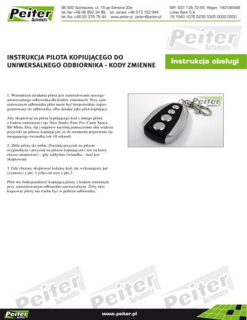 96-500 Sochaczew, ul. 15-go Sierpnia 33a tel./fax +48 46 862 34 88, tel. serwis +48 513 153 944 tel./fax +48 22 379 79 44 www.peiter.pl, [email protected] INSTRUKCJA PILOTA KOPIUJĄCEGO DO UNIWERSALNEGO ODBIORNIKA - KODY ZMIENNE 1. Warunkiem działania pilota jest zainstalowanie naszego uniwersalnego odbiornika dla kodów zmiennych. Przy zainstalowanym odbiorniku pilot może być bezpośrednio zaprogramowany do odbiornika, albo działać jako pilot kopiujący. Aby skopiować na pilota kopiującego kod z innego pilota z kodem zmiennym ( np. Nice Smilo, Faac Fix, Came Space, Bft Mitto, Dea, itp.) najpierw naciśnij jednocześnie oba większe przyciski na pilocie kopiującym, aż do momentu pojawienia się mrugającego światełka (ok 10 sekund) 2. Zbliż piloty do siebie. Naciśnij przycisk na pilocie oryginalnym i przycisk na pilocie kopiującym ( ten na który chcesz skopiować) – gdy zabłyśnie światełko – kod jest skopiowany 3. Gdy chcemy skopiować kolejny kod, nie wykonujemy już czynności z pkt. 1 tylko od razu z pkt.2. Pilot ma funkcjonalność kopiującą piloty z kodem zmiennym przy zainstalowanym odbiorniku uniwersalnym. Żeby móc kopiować piloty nie trzeba być w pobliżu odbiornika. www.peiter.pl NIP: 837-135-72-55, Regon: 140146548 Lukas Bank S.A. 19 1940 1076 5239 5305 0000 0000 Instrukcja obsługi