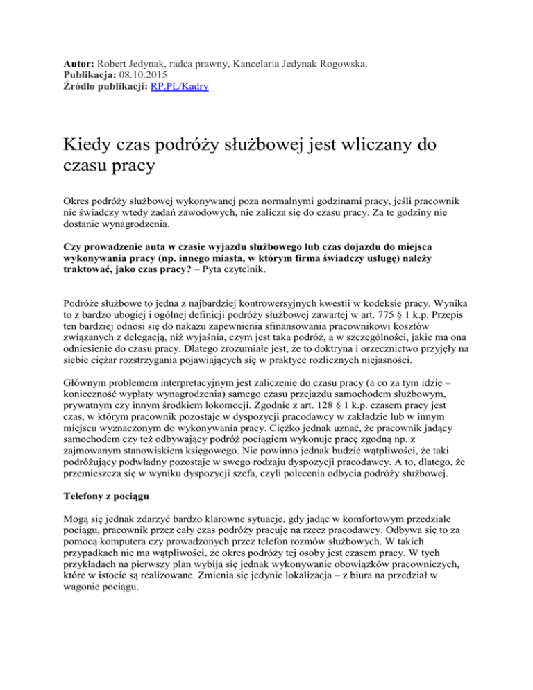 Autor: Robert Jedynak, radca prawny, Kancelaria Jedynak Rogowska. Publikacja: 08.10.2015 Źródło publikacji: RP.PL/Kadry Kiedy czas podróży służbowej jest wliczany do czasu pracy Okres podróży służbowej wykonywanej poza normalnymi godzinami pracy, jeśli pracownik nie świadczy wtedy zadań zawodowych, nie zalicza się do czasu pracy. Za te godziny nie dostanie wynagrodzenia. Czy prowadzenie auta w czasie wyjazdu służbowego lub czas dojazdu do miejsca wykonywania pracy (np. innego miasta, w którym firma świadczy usługę) należy traktować, jako czas pracy? – Pyta czytelnik. Podróże służbowe to jedna z najbardziej kontrowersyjnych kwestii w kodeksie pracy. Wynika to z bardzo ubogiej i ogólnej definicji podróży służbowej zawartej w art. 775 § 1 k.p. Przepis ten bardziej odnosi się do nakazu zapewnienia sfinansowania pracownikowi kosztów związanych z delegacją, niż wyjaśnia, czym jest taka podróż, a w szczególności, jakie ma ona odniesienie do czasu pracy. Dlatego zrozumiałe jest, że to doktryna i orzecznictwo przyjęły na siebie ciężar rozstrzygania pojawiających się w praktyce rozlicznych niejasności. Głównym problemem interpretacyjnym jest zaliczenie do czasu pracy (a co za tym idzie – konieczność wypłaty wynagrodzenia) samego czasu przejazdu samochodem służbowym, prywatnym czy innym środkiem lokomocji. Zgodnie z art. 128 § 1 k.p. czasem pracy jest czas, w którym pracownik pozostaje w dyspozycji pracodawcy w zakładzie lub w innym miejscu wyznaczonym do wykonywania pracy. Ciężko jednak uznać, że pracownik jadący samochodem czy też odbywający podróż pociągiem wykonuje pracę zgodną np. z zajmowanym stanowiskiem księgowego. Nie powinno jednak budzić wątpliwości, że taki podróżujący podwładny pozostaje w swego rodzaju dyspozycji pracodawcy. A to, dlatego, że przemieszcza się w wyniku dyspozycji szefa, czyli polecenia odbycia podróży służbowej. Telefony z pociągu Mogą się jednak zdarzyć bardzo klarowne sytuacje, gdy jadąc w komfortowym przedziale pociągu, pracownik przez cały czas podróży pracuje na rzecz pracodawcy. Odbywa się to za pomocą komputera czy prowadzonych przez telefon rozmów służbowych. W takich przypadkach nie ma wątpliwości, że okres podróży tej osoby jest czasem pracy. W tych przykładach na pierwszy plan wybija się jednak wykonywanie obowiązków pracowniczych, które w istocie są realizowane. Zmienia się jedynie lokalizacja – z biura na przedział w wagonie pociągu. Jako pasażer Zgoła odmienną jest sytuacja, gdy pracownik wsiada do pociągu np. o godz. 8 i cały czas podróży do 11.30 poświęca na czynności niezwiązane z jakimikolwiek obowiązkami służbowymi. Tu wątpliwości wzbudzała ocena, czy godziny jego przemieszczania należy zaliczać do czasu pracy. Podobna wątpliwość pojawiała się, gdy pracownik podróżował samochodem służbowym, jako pasażer lub kierowca (przy założeniu, że nie jest zawodowym szoferem i nie pracuje na takim stanowisku). Zazwyczaj do zadań służbowych pracownika zatrudnionego np. jako konsultant, handlowiec czy serwisant nie należy prowadzenie aut służbowych. Przy tych przykładach orzecznictwo oraz doktryna uznały, że czas takiej podróży należy zaliczyć do czasu wykonywania pracy. Z jednym zastrzeżeniem. Zwraca się uwagę, że sama podróż nie stanowi wykonywania pracy, ale jeśli przemieszczanie odbywa się w czasie, który jest dla pracownika normalnym czasem pracy, to powinien on być zaliczany do godzin pracy, za który etatowcowi przysługuje wynagrodzenie. A contrario – odbywanie podróży służbowej poza czasem pracy nie rodzi obowiązku wypłaty pracownikowi dodatkowego wynagrodzenia, jeżeli przepis szczególny tego nie przewiduje. Tak uznał Sąd Najwyższy w wyroku z 27 października 1981 r. (I PR 85/81). Różne interesy i oceny Ta utrwalona linia orzecznictwa chroni interesy pracodawcy. Z jednej strony można się zgodzić z opinią, że przyznanie wynagrodzenia za cały czas podróży obciążałoby nadmiernie pracodawców. Mogłoby to też prowadzić do wielu nadużyć związanych z udowadnianiem rzeczywistego czasu przemieszczania się. Z drugiej jednak strony przyjęcie, że czasem pracy w delegacji jest jedynie ten, który jest normalnym czasem pracy etatowca, też ma liczne grono krytyków. Należy wziąć pod uwagę choćby treść art. 128 k.p. Według niego uznanie za czas pracy nie wymaga faktycznego wykonywania pracy, lecz jedynie pozostawania w dyspozycji pracodawcy. Uwzględniając tę ustawową definicję czasu pracy, niektórzy komentatorzy i praktycy nie mogą się zgodzić z twierdzeniem, że np. w czasie 12-godzinnej podróży autem wykonywanej na bezpośrednie polecenie szefa pracownik, objęty ośmiogodzinną dzienną normą czasu pracy, przez osiem godzin jest w pracy, a przez pozostałe cztery godziny podróżuje jako osoba prywatna. Oceny tej sytuacji nie zmienia oczywiście wymaganie, aby pracodawca pokrył w całości koszty tej podróży, bez względu na to, czy zostały one poniesione w normalnym czasie pracy, czy już poza nim. Zdaniem autora Robert Jedynak, radca prawny, Kancelaria Jedynak Rogowska Zupełnie inna ocena przedstawionych przykładów dotyczy stanowisk, na których przemieszczanie się autem służbowym należy do głównych zadań, np. konwojenta czy pracownika patrolu firmy ochrony osób i mienia. Jazda samochodem poza normalnym czasem pracy jest wtedy uznana za pracę w godzinach nadliczbowych. Stanowi ona, bowiem dalsze wykonywanie typowych zadań pracowniczych. Problematyka podróży służbowych powinna się doczekać bardziej kompleksowej, a za razem szczegółowej regulacji. Pozwoli to stosować przepisy prawa pracy bez zbędnych kontrowersji. Niestety, na razie nawet nie słychać o propozycjach zmian tych regulacji.