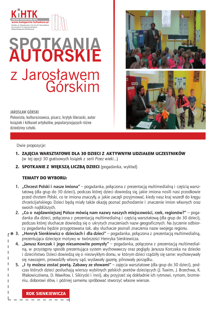 Księgarnia i HURTOWNIA TANIEJ KSIĄŻKI www.ksiegarnia-tuliszkow.pl Żychlin, ul. Tuliszkowska 14 d, 62-571 Stare Miasto tel. 63 240 77 77, faks 63 220 44 67 [email protected] SPOTKANIA AUTORSKIE z Jarosławem Górskim JAROSŁAW GÓRSKI Polonista, kulturoznawca, pisarz, krytyk literacki, autor książek i kilkuset artykułów, popularyzujących różne dziedziny sztuki. Dwie propozycje: 1. ZAJĘCIA WARSZTATOWE DLA 30 DZIECI Z AKTYWNYM UDZIAŁEM UCZESTNIKÓW (w tej opcji 30 gratisowych książek z serii Przez wieki…) 2. SPOTKANIE Z WIĘKSZĄ LICZBĄ DZIECI (pogadanka, wykład) TEMATY DO WYBORU: 1. „Chrzest Polski i nasze imiona” – pogadanka, połączona z prezentacją multimedialną i częścią warsztatową (dla grup do 30 dzieci), podczas której dzieci dowiedzą się, jakie imiona nosili nasi przodkowie przed chrztem Polski, co te imiona znaczyły, a jakie zaczęli przyjmować, kiedy nasz kraj wszedł do kręgu chrześcijańskiego. Dzieci będą miały także okazję poznać pochodzenie i znaczenie imion własnych oraz swoich najbliższych. 2. „Co o najdawniejszej Polsce mówią nam nazwy naszych miejscowości, rzek, regionów?” – pogadanka dla dzieci, połączona z prezentacją multimedialną i częścią warsztatową (dla grup do 30 dzieci), podczas której słuchacze dowiedzą się o ukrytych znaczeniach nazw geograficznych. Na życzenie odbiorcy pogadanka będzie przygotowana tak, aby słuchacze poznali znaczenia nazw swojego regionu. 3. „Henryk Sienkiewicz o dzieciach i dla dzieci” – pogadanka, połączona z prezentacją multimedialną, prezentująca dziecięce motywy w twórczości Henryka Sienkiewicza. 4. „Janusz Korczak i jego niesamowite pomysły” – pogadanka, połączona z prezentacją multimedialną, w przystępny sposób prezentująca system wychowawczy oraz poglądy Janusza Korczaka na dziecko i dzieciństwo. Dzieci dowiedzą się o niezwykłym domu, w którym dzieci rządziły się same: wychowywały się nawzajem, prowadziły własny sąd, wydawały gazetę, pilnowały porządku. 5. „I ty możesz zostać poetą. Zabawy ze słowami” – zajęcia warsztatowe (dla grup do 30 dzieci), podczas których dzieci posłuchają wierszy wybitnych polskich poetów dziecięcych (J. Tuwim, J. Brzechwa, K. Iłłakowiczówna, D. Wawiłow, I. Sikirycki i inni), aby przyjrzeć się dokładnie ich rytmowi, rymom, brzmieniu, doborowi słów, i później samemu spróbować stworzyć własne wiersze. ROK SIENKIEWICZA CENA: 600 ZŁ BRUTTO Cena zawiera: • 30 egz. książek – prezent dla każdego uczestnika, • zaświadczenie dla placówki o zorganizowaniu wydarzenia czytelniczego Proponujemy dostarczenie i odbiór atrakcyjnych książek, aby można było w szkole równolegle zorganizować kiermasz jako kolejne wydarzenie promujące czytelnictwo. Kiermasz rozliczamy specjalnym rabatem! KSIĄŻKI NASZYCH MARZEŃ Rozporządzenie Rady Ministrów z dn. 26.05.2015 r. w sprawie realizacji rządowego programu Książki naszych marzeń: § 2. punkt 3 Organ prowadzący szkołę, który uzyskał wsparcie finansowe, jest obowiązany zapewnić: zorganizowanie co najmniej 2 wydarzeń promujących czytelnictwo z udziałem uczniów. Narodowy Program Rozwoju Czytelnictwa Rozporządzenie Rady Ministrów z dn. 6.10.2015 r. w sprawie realizacji priorytetu 3 Narodowego Programu Rozwoju Czytelnictwa: § 3. punkt 1 Organ prowadzący szkołę, który uzyskał wsparcie finansowe, jest obowiązany zapewnić, aby szkoły, w odniesieniu do których uzyskał wsparcie finansowe: zorganizowały w ciągu roku szkolnego co najmniej jedno wydarzenie, promujące czytelnictwo z udziałem uczniów.