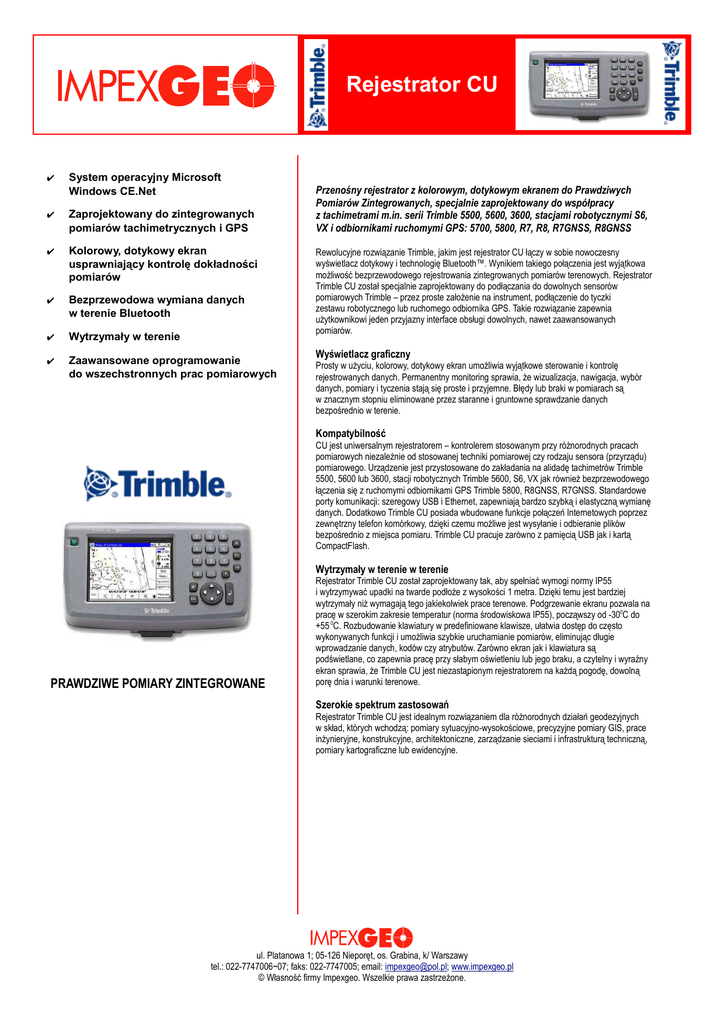 Rejestrator CU ✔ System operacyjny Microsoft Windows CE.Net ✔ Zaprojektowany do zintegrowanych pomiarów tachimetrycznych i GPS ✔ Kolorowy, dotykowy ekran usprawniający kontrolę dokładności pomiarów ✔ Bezprzewodowa wymiana danych w terenie Bluetooth ✔ Wytrzymały w terenie ✔ Zaawansowane oprogramowanie do wszechstronnych prac pomiarowych Przenośny rejestrator z kolorowym, dotykowym ekranem do Prawdziwych Pomiarów Zintegrowanych, specjalnie zaprojektowany do współpracy z tachimetrami m.in. serii Trimble 5500, 5600, 3600, stacjami robotycznymi S6, VX i odbiornikami ruchomymi GPS: 5700, 5800, R7, R8, R7GNSS, R8GNSS Rewolucyjne rozwiązanie Trimble, jakim jest rejestrator CU łączy w sobie nowoczesny wyświetlacz dotykowy i technologię Bluetooth™. Wynikiem takiego połączenia jest wyjątkowa moŜliwość bezprzewodowego rejestrowania zintegrowanych pomiarów terenowych. Rejestrator Trimble CU został specjalnie zaprojektowany do podłączania do dowolnych sensorów pomiarowych Trimble – przez proste załoŜenie na instrument, podłączenie do tyczki zestawu robotycznego lub ruchomego odbiornika GPS. Takie rozwiązanie zapewnia uŜytkownikowi jeden przyjazny interface obsługi dowolnych, nawet zaawansowanych pomiarów. Wyświetlacz graficzny Prosty w uŜyciu, kolorowy, dotykowy ekran umoŜliwia wyjątkowe sterowanie i kontrolę rejestrowanych danych. Permanentny monitoring sprawia, Ŝe wizualizacja, nawigacja, wybór danych, pomiary i tyczenia stają się proste i przyjemne. Błędy lub braki w pomiarach są w znacznym stopniu eliminowane przez staranne i gruntowne sprawdzanie danych bezpośrednio w terenie. Kompatybilność CU jest uniwersalnym rejestratorem – kontrolerem stosowanym przy róŜnorodnych pracach pomiarowych niezaleŜnie od stosowanej techniki pomiarowej czy rodzaju sensora (przyrządu) pomiarowego. Urządzenie jest przystosowane do zakładania na alidadę tachimetrów Trimble 5500, 5600 lub 3600, stacji robotycznych Trimble 5600, S6, VX jak równieŜ bezprzewodowego łączenia się z ruchomymi odbiornikami GPS Trimble 5800, R8GNSS, R7GNSS. Standardowe porty komunikacji: szeregowy USB i Ethernet, zapewniają bardzo szybką i elastyczną wymianę danych. Dodatkowo Trimble CU posiada wbudowane funkcje połączeń Internetowych poprzez zewnętrzny telefon komórkowy, dzięki czemu moŜliwe jest wysyłanie i odbieranie plików bezpośrednio z miejsca pomiaru. Trimble CU pracuje zarówno z pamięcią USB jak i kartą CompactFlash. Wytrzymały w terenie w terenie PRAWDZIWE POMIARY ZINTEGROWANE Rejestrator Trimble CU został zaprojektowany tak, aby spełniać wymogi normy IP55 i wytrzymywać upadki na twarde podłoŜe z wysokości 1 metra. Dzięki temu jest bardziej wytrzymały niŜ wymagają tego jakiekolwiek prace terenowe. Podgrzewanie ekranu pozwala na pracę w szerokim zakresie temperatur (norma środowiskowa IP55), począwszy od -300C do +55 0C. Rozbudowanie klawiatury w predefiniowane klawisze, ułatwia dostęp do często wykonywanych funkcji i umoŜliwia szybkie uruchamianie pomiarów, eliminując długie wprowadzanie danych, kodów czy atrybutów. Zarówno ekran jak i klawiatura są podświetlane, co zapewnia pracę przy słabym oświetleniu lub jego braku, a czytelny i wyraźny ekran sprawia, Ŝe Trimble CU jest niezastąpionym rejestratorem na kaŜdą pogodę, dowolną porę dnia i warunki terenowe. Szerokie spektrum zastosowań Rejestrator Trimble CU jest idealnym rozwiązaniem dla róŜnorodnych działań geodezyjnych w skład, których wchodzą: pomiary sytuacyjno-wysokościowe, precyzyjne pomiary GIS, prace inŜynieryjne, konstrukcyjne, architektoniczne, zarządzanie sieciami i infrastrukturą techniczną, pomiary kartograficzne lub ewidencyjne. ul. Platanowa 1; 05-126 Nieporęt, os. Grabina, k/ Warszawy tel.: 022-7747006~07; faks: 022-7747005; email: [email protected]; www.impexgeo.pl © Własność firmy Impexgeo. Wszelkie prawa zastrzeŜone. Parametr Trimble CU Parametry techniczne Software Microsoft Windows Explorer Pocket Internet Explorer Inbox e-mail client Microsoft WordPad Transcriber Microsoft Windows Media Player Microsoft ActiveSync Connect to Desctop File Transfer (Remote) File viewers for Microsoft Image and Word Trimble Survey Controller System Operacyjny Microsoft Windows CE.Net Procesor 400MHz Intel Wymiary 196 mm x 110 mm, wysokość 30 mm Waga 400 g Zasilanie Zewnętrzne zasilanie z instrumentu lub zasilanie z uchwytu do mocowania na tyczce Zasilanie wewnętrzne – wykorzystywane w trybie uśpienia Temperatura pracy / przechowywania od -30 do +55 0C / od -40 do +70 0C Parametry środowiskowe Spełnia normy MIL-STD-810E dot. temperatury, MIL-STD-810F wilgotności, zanurzenia w wodzie, pyłoszczelności, upadków, udarów mechanicznych, wibracji i testów wysokościowych Norma środowiskowa IP55 CE, FCC, C-tick Komunikacja USB, port RS-232, Bluetooth Pamięć 64 MB SDRAM, 256 MB nieulotnej pamięci Flash Pamięć zewnętrzna USB, CompactFlash Klawiatura 19 klawiszy alfanumerycznych + 4 klawisze nawigacyjne Audio Wbudowany zintegrowany głośnik dla komunikatów głosowych Wyświetlacz Kolorowy, odblaskowy LCD TFT o rozdzielczości 320 x 240 pikseli (QVGA), podświetlany, dostarczający wyraźny i czytelny obrazie w pełnym oświetleniu słonecznym Klawiatura Trimble CU – Parametry techniczne Certyfikaty ul. Platanowa 1; 05-126 Nieporęt, os. Grabina, k/ Warszawy tel.: 022-7747006~07; faks: 022-7747005; email: [email protected]; www.impexgeo.pl © Własność firmy Impexgeo. Wszelkie prawa zastrzeŜone.
