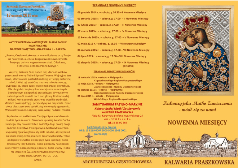 TERMINARZ NOWENNY MIESIĘCY 06 grudnia 2014 r. – sobota, g.16.30 – I Nowenna Miesięcy 03 stycznia 2015 r. – sobota, g. 17.00 – II Nowenna Miesięcy 07 lutego 2015 r. – sobota, g. 17.00 – III Nowenna Miesięcy 07 marca 2015 r. – sobota, g. 17.00 – IV Nowenna Miesięcy 11 kwietnia 2015 r. – sobota, g. 17.00 – V Nowenna Miesięcy AKT ZAWIERZENIA NAJŚWIĘTSZEJ MARYI PANNIE KALWARYJSKIEJ NA WZÓR ŚWIĘTEGO JANA PAWŁA II – PAPIEŻA 02 maja 2015 r. – sobota, g. 16.30 – VI Nowenna Miesięcy ,,Przeto, Orędowniczko nasza, one miłosierne oczy Twoje na nas zwród, a Jezusa, błogosławiony owoc żywota Twojego, po tym wygnaniu nam okaż. O łaskawa, o litościwa, o słodka Panno Maryjo!”. 04 lipca 2015 r. – sobota, g. 17.00 – VIII Nowenna Miesięcy Wejrzyj, łaskawa Pani, na ten lud, który od wieków pozostawał wierny Tobie i Synowi Twemu. Wejrzyj na ten naród, który zawsze pokładał nadzieję w Twojej matczynej miłości. Wejrzyj, zwród na nas swe miłosierne oczy, wypraszaj to, czego dzieci Twoje najbardziej potrzebują. Dla ubogich i cierpiących otwieraj serca zamożnych. Bezrobotnym daj spotkad pracodawcę. Wyrzucanym na bruk pomóż znaleźd dach nad głową. Rodzinom daj miłośd, która pozwala przetrwad wszelkie trudności. Młodym pokazuj drogę i perspektywy na przyszłośd. Dzieci otocz płaszczem swej opieki, aby nie ulegały zgorszeniu. Wspólnoty zakonne ożywiaj łaską wiary, nadziei i miłości. Kapłanów ucz naśladowad Twojego Syna w oddawaniu co dnia życia za owce. Biskupom upraszaj światło Ducha świętego, aby prowadzili ten Kościół jedną i prostą drogą do bram Królestwa Twojego Syna. Matko Miłosierdzia, wypraszaj Ojcu Świętemu siły ciała i ducha, aby wypełnił do kooca misję, którą mu zlecił Zmartwychwstały. Tobie oddajemy wszystkie owoce jego życia i posługi; Tobie zawierzamy losy Kościoła; Tobie polecamy nasz naród; zawierzamy: naszą diecezję i parafię. Tobie ufamy i Tobie raz jeszcze za Św. Janem Pawłem II wyznajemy: TOTUS TUUS. MARIA! TOTUS TUUS. Amen. 06 czerwca 2015 r. – sobota, g. 17.00 – VII Nowenna Miesięcy 01 sierpnia 2015 r. – sobota, g. 17.00 – IX Nowenna Miesięcy (ostatnia) TERMINARZ PIELGRZYMEK REGIONÓW 18 kwietnia 2015 r. – sobota – Pielgrzymka Częstochowskiego Regionu Duszpasterskiego 16 maja 2015 r. – sobota – Pielgrzymka Zawierciaoskiego Regionu Duszpasterskiego 06 czerwca 2015 r. – sobota – Pielgrzymka Radomszczaoskiego Regionu Duszpasterskiego 04 lipca 2015 r. – sobota – Pielgrzymka Wieluoskiego Regionu Duszpasterskiego SANKTUARIUM PASYJNO-MARYJNE Kalwaryjskiej Matki Zawierzenia KALWARIA PRASZKOWSKA Aleja Ks. Kardynała Stefana Wyszyoskiego 24 46 - 320 Praszka tel. 34 35 90 869 Bank Spółdzielczy Praszka NRB: 19 8269 0007 2000 0000 1948 0001 (koronacja) Kalwaryjska Matko Zawierzenia - módl się za nami NOWENNA MIESIĘCY