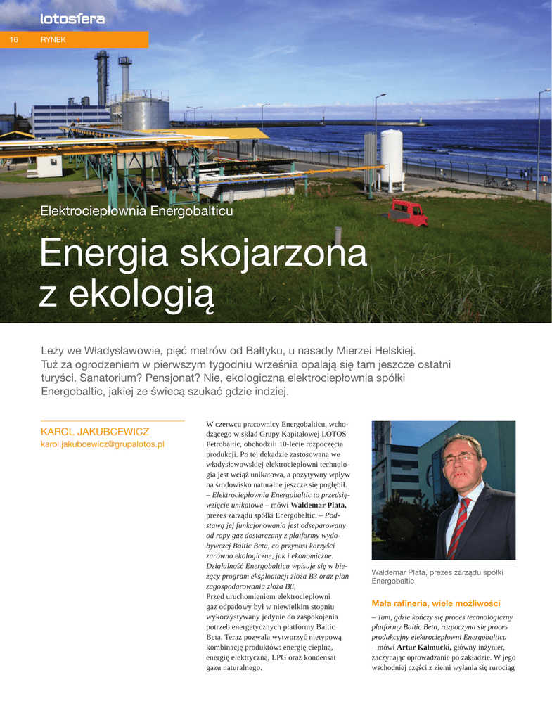 16 RYNEK Podpis podpis Elektrociepłownia Energobalticu Energia skojarzona z ekologią Leży we Władysławowie, pięć metrów od Bałtyku, u nasady Mierzei Helskiej. Tuż za ogrodzeniem w pierwszym tygodniu września opalają się tam jeszcze ostatni turyści. Sanatorium? Pensjonat? Nie, ekologiczna elektrociepłownia spółki Energobaltic, jakiej ze świecą szukać gdzie indziej. Karol Jakubcewicz [email protected] W czerwcu pracownicy Energobalticu, wchodzącego w skład Grupy Kapitałowej LOTOS Petrobaltic, obchodzili 10-lecie rozpoczęcia produkcji. Po tej dekadzie zastosowana we władysławowskiej elektrociepłowni technologia jest wciąż unikatowa, a pozytywny wpływ na środowisko naturalne jeszcze się pogłębił. – Elektrociepłownia Energobaltic to przedsięwzięcie unikatowe – mówi Waldemar Plata, prezes zarządu spółki Energobaltic. – Podstawą jej funkcjonowania jest odseparowany od ropy gaz dostarczany z platformy wydobywczej Baltic Beta, co przynosi korzyści zarówno ekologiczne, jak i ekonomiczne. Działalność Energobalticu wpisuje się w bieżący program eksploatacji złoża B3 oraz plan zagospodarowania złoża B8, Przed uruchomieniem elektrociepłowni gaz odpadowy był w niewielkim stopniu wykorzystywany jedynie do zaspokojenia potrzeb energetycznych platformy Baltic Beta. Teraz pozwala wytworzyć nietypową kombinację produktów: energię cieplną, energię elektryczną, LPG oraz kondensat gazu naturalnego. Waldemar Plata, prezes zarządu spółki Energobaltic Mała rafineria, wiele możliwości – Tam, gdzie kończy się proces technologiczny platformy Baltic Beta, rozpoczyna się proces produkcyjny elektrociepłowni Energobalticu – mówi Artur Kałmucki, główny inżynier, zaczynając oprowadzanie po zakładzie. W jego wschodniej części z ziemi wyłania się rurociąg RYNEK podobne do tych, które unoszą odrzutowce – dodaje nasz rozmówca. Po czym wracamy do omawiania procesu technologicznego: – Ciepło produkowane jest w dwóch kotłach o mocy 8,85 MW. Są one ogrzewane gorącymi spalinami z turbin gazowych. Dodatkowo gaz opałowy wykorzystywany jest do produkcji energii cieplnej w trzech kotłach pomocniczo-szczytowych, o mocy 5 MW. W razie potrzeby można je zasilać również sieciowym gazem ziemnym lub lekkim olejem opałowym. Artur Kałmucki, główny inżynier o średnicy dużego kubka. Tą wąską, ale bardzo długą, 82-kilometrową rurą, zakopaną na dnie Bałtyku, do Władysławowa przesyłany jest gaz odpadowy pod ciśnieniem 130 atmosfer. – Informacje o przepływie gazu zatłoczonego w stacji sprężania na platformie przekazują nam wcześniej pracownicy LOTOS Petrobalticu – dodaje A. Kałmucki. – Kontakt z platformą utrzymujemy dzięki łączu satelitarnemu. Z rurociągu gaz trafia do stacji separacji – To taka mała rafineria – tłumaczy inżynier, wskazując na kilkumetrowe kolumny. Po czym podkreśla: – Tu nie ma żadnych odczynników chemicznych. Separacja gazu odpadowego na trzy produkty przebiega z wykorzystaniem wyłącznie procesów fizycznych. Z tej nietypowej mieszanki węglowodorów wyodrębniany jest LPG (czyli propan i butan), kondensat gazu naturalnego (KNG) oraz tzw. gaz opałowy, czyli mieszanina metanu i etanu, zasilająca turbiny elektrociepłowni. LPG i kondensat przekazywane są do magazynów paliw płynnych. To 4 duże zbiorniki przykryte grubą warstwą ziemi. – Dwa zbiorniki LPG mają po 400 m3, a te na kondensat – po 80 m3 – mówi Artur Kałmucki. A prezes Plata dodaje: – Produkty te trafiają do naszych klientów poprzez sieć logistyczną spółek z Grupy Kapitałowej LOTOS. LPG jest odbierany przez cysterny spółki LOTOS Paliwa, natomiast odbiorcą kondensatu jest Grupa LOTOS, która wykorzystuje go w procesie technologicznym w rafinerii. Gaz opałowy jest przesyłany do elektrociepłowni. – Jest paliwem służącym do zasilania dwóch turbin gazowych o mocy 5,5 MW każda – wyjaśnia Sławomir Mach, szef Zespołu ds. Eksploatacyjnych. Producentem urządzeń zainstalowanych we władysławowskiej EC jest amerykańska firma Rolls-Royce. – Są Cały proces (oprócz tankowania LPG i KNG) sterowany jest z nastawni głównej, znajdującej się na piętrze hali elektrociepłowni. To tutaj monitorowane są wszystkie parametry związane z produkcją i bezpieczeństwem instalacji. Obsługą EC podczas każdej z czterech zmian zajmują się 3 osoby 146 kominów mniej Nietypowa technologia idzie w parze z wyjątkowym efektem ekologicznym. Samo pozwolenie na budowę zakładu w otulinie Nadmorskiego Parku Krajobrazowego, chronionego w ramach programu Natura 2000, świadczy o tym, jak neutralny jest on dla środowiska. W porównaniu do tradycyjnych elektrociepłowni, opalanych węglem kamiennym, ich gazowe odpowiedniki charakteryzuje znacznie niższa emisyjność i wyższa sprawność. Co więcej, badania wskazują, że elektrociepłownia Energobalticu przyczyniła się do poprawy czystości powietrza. – Dzięki elektrociepłowni w regionie przestało dymić już 146 kominów – mówi z dumą A. Kałmucki. Chodzi o kominy małych kotłowni osiedlowych oraz domów jednorodzinnych. Wydobywające się z nich dwutlenek węgla oraz inne szkodliwe gazy i pyły tworzą zjawisko tzw. niskiej emisji. W tym miejscu rurociąg dociera do elektrociepłowni Elementem rozpoczętej w 2002 r. inwestycji było powstanie we Władysławowie Miejskiej Sieci Ciepłowniczej – długiej wówczas na 10 km i liczącej ponad 105 węzłów ciepłowniczych. Z czasem ciepło wytwarzane dzięki gazowi odpadowemu z platformy zaczęło trafiać do coraz większej ilości budynków. Obecnie elektrociepłownia ogrzewa około dwa tysiące gospodarstw domowych i instytucji w gminie Władysławowo. Jej klienci cenią sobie przede wszystkim wygodę i schludność takiego rozwiązania. To, że elektrociepłownia Energobalticu nie jest uciążliwym sąsiadem, potwierdzają także władze Władysławowa. – Z energii c