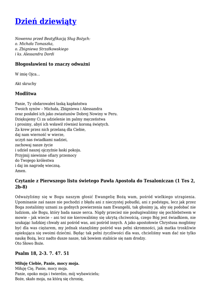 Dzień dziewiąty Nowenna przed Beatyfikacją Sług Bożych: o. Michała Tomaszka, o. Zbigniewa Strzałkowskiego i ks. Alessandra Dordi Błogosławieni to znaczy odważni W imię Ojca… Akt skruchy Modlitwa Panie, Ty obdarowałeś łaską kapłaństwa Twoich synów – Michała, Zbigniewa i Alessandra oraz posłałeś ich jako zwiastunów Dobrej Nowiny w Peru. Dziękujemy Ci za udzielenie im palmy męczeństwa i prosimy, abyś ich wsławił również koroną świętych. Za krew przez nich przelaną dla Ciebie, daj nam wierność w wierze, uczyń nas świadkami nadziei, zachowaj nasze życie i udziel naszej ojczyźnie łaski pokoju. Przyjmij niewinne ofiary przemocy do Twojego królestwa i daj im nagrodę wieczną. Amen. Czytanie z Pierwszego listu świetego Pawła Apostoła do Tesaloniczan (1 Tes 2, 2b-8) Odważyliśmy się w Bogu naszym głosić Ewangelię Bożą wam, pośród wielkiego utrapienia. Upominanie zaś nasze nie pochodzi z błędu ani z nieczystej pobudki, ani z podstępu, lecz jak przez Boga zostaliśmy uznani za godnych powierzenia nam Ewangelii, tak głosimy ją, aby się podobać nie ludziom, ale Bogu, który bada nasze serca. Nigdy przecież nie posługiwaliśmy się pochlebstwem w mowie – jak wiecie – ani też nie kierowaliśmy się ukrytą chciwością, czego Bóg jest świadkiem, nie szukając ludzkiej chwały ani pośród was, ani pośród innych. A jako apostołowie Chrystusa mogliśmy być dla was ciężarem, my jednak stanęliśmy pośród was pełni skromności, jak matka troskliwie opiekująca się swoimi dziećmi. Będąc tak pełni życzliwości dla was, chcieliśmy wam dać nie tylko naukę Bożą, lecz nadto dusze nasze, tak bowiem staliście się nam drodzy. Oto Słowo Boże. Psalm 18, 2-3. 7. 47. 51 Miłuję Ciebie, Panie, mocy moja. Miłuję Cię, Panie, mocy moja. Panie, opoko moja i twierdzo, mój wybawicielu; Boże, skało moja, na którą się chronię, tarczo moja, mocy zbawienia mego i moja obrono. Miłuję Ciebie, Panie, mocy moja. Wzywałem Pana w moim utrapieniu, wołałem do mojego Boga; i głos mój usłyszał ze swojej Świątyni, dotarł mój krzyk do Jego uszu. Miłuję Ciebie, Panie, mocy moja. Niech żyje Pan, niech będzie błogosławiona moja opoka, niech będzie wywyższony mój Bóg i Zbawca. Ty dajesz wielkie zwycięstwo królowi i okazujesz łaskę dla Twego pomazańca. Miłuję Ciebie, Panie, mocy moja. Słowa Ewangelii według świętego Jana (J 16, 20-22. 33) Zaprawdę, zaprawdę, powiadam wam: Wy będziecie płakać i zawodzić, a świat się będzie weselił. Wy będziecie się smucić, ale smutek wasz zamieni się w radość. Kobieta, gdy rodzi, doznaje smutku, bo przyszła jej godzina. Gdy jednak urodzi dziecię, już nie pamięta o bólu z powodu radości, że się człowiek narodził na świat. Także i wy teraz doznajecie smutku. Znowu jednak was zobaczę, i rozraduje się serce wasze, a radości waszej nikt wam nie zdoła odebrać. To wam powiedziałem, abyście pokój we Mnie mieli. Na świecie doznacie ucisku, ale miejcie odwagę: Jam zwyciężył świat. Oto Słowo Pańskie. Rozważanie Błogosławieni to znaczy odważni Każdy wierzący, chcąc być wiernym Ewangelii, może zostać wezwany do „najwyższego świadectwa męczeństwa” (VS 89), a nierzadko to misjonarz staje przed koniecznością oddania życia dla Jezusa. On to, przynaglany miłością Chrystusa, żyje w Jego bliskości i dla Niego cierpi, znosząc krzyż po to, by inni Go pokochali. Często poprzez cierpienie będzie mówił innym o Bogu, gdyż przepowiadanemu słowu może towarzyszyć nawet konieczność oddania życia, aby uwiarygodnić głoszone orędzie.1 I właśnie w ten sposób jego męczeństwo może stać się „uroczystym przepowiadaniem i posługą misyjną” (VS 93). Już Nowy Testament misję i męczeństwo wiąże nierozerwalnym węzłem. Misja Jezusa, choć prowadzi do zmartwychwstania, wiedzie przecież przez Kalwarię. Szczepan, trwający aż do śmierci w swych przekonaniach, zostaje ukamienowany. Czerwony kolor szat liturgicznych w święta apostołów wyraźnie wskazuje, jaki był koniec ich życia.2 Jak widać zatem już od pierwszych wieków istnienia chrześcijaństwa głoszenie Dobrej Nowiny wymagało ofiary życia świadków Chrystusa. Dzieło misyjne zostało użyźnione krwią naśladowców Jezusa, którzy do dzisiaj są wymownym przykładem jak być odważnym i czerpać siłę z wiary w Zmartwychwstałego Pana.3 W nieodległej historii Ameryki Łacińskiej współuczestnictwo w życiu tych, którzy cierpią i są ofiarami przemocy, bywało okupione prześladowaniami, a nawet torturami i śmiercią. Godni szacunku są ci, którzy chcąc wiernie odpowiedzieć w duchu błogosławieństw na wezwania ewangelizacji, stali się ofiarami przemocy bądź też stanowczo trwali przy powierzonych sobie wiernych, by w chwilach naznaczonych niesprawiedliwością wzbudzać w nich, pomimo wszystko, nadzieję.4 Godni uznania są ci misjonarze, którzy byli „oczerniani, zastraszani, a nawet mordowani za to, że w imię Ewangelii bronią ubogich”.5 A godności wyniesienia na ołtarze, jako pierwsi błogosławieni męczennicy Kościoła peruwiańskiego, dostąpili nasi misjonarze: Zbyszek, Michał i Alessandro. Jakąż oni musieli mieć odwagę, chyba heroiczną, by mówić innym o Bogu własną śmiercią? Nie wiemy, czy jak na św. Franciszka i św. Antoniego, tak i na nich wywarł jakiś wpływ urok możliwego męczeństwa,6 lecz z pewnością możemy odczytać zdania, jakie jeszcze w Polsce wypowiedzieli jako swoiste proroctwo dotyczące ich samych. O. Zbigniew, pracując jeszcze w Legnicy, poinformowany o niebezpiecznej sytuacji kraju, do którego się wybierał, miał odpowiedzieć: „Gdy się jedzie na misje, trzeba być gotowym na wszystko”. 7 Natomiast o. Michał po Eucharystii celebrowanej na pożegnanie go przez parafian z Pieńska, tuż „przed wyjazdem na misje, odważnie powiedział, że jeśli trzeba będzie dla