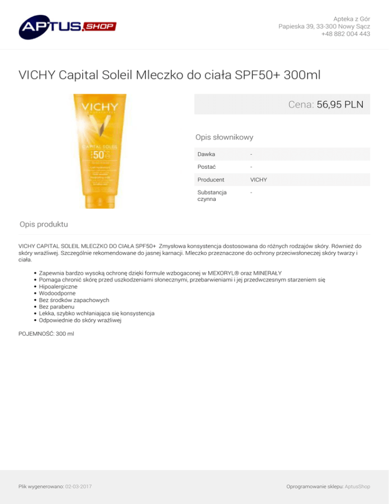 Apteka z Gór Papieska 39, 33-300 Nowy Sącz +48 882 004 443 VICHY Capital Soleil Mleczko do ciała SPF50+ 300ml Cena: 56,95 PLN Opis słownikowy Dawka - Postać - Producent VICHY Substancja czynna - Opis produktu VICHY CAPITAL SOLEIL MLECZKO DO CIAŁA SPF50+ Zmysłowa konsystencja dostosowana do różnych rodzajów skóry. Również do skóry wrażliwej. Szczególnie rekomendowane do jasnej karnacji. Mleczko przeznaczone do ochrony przeciwsłoneczej skóry twarzy i ciała. Zapewnia bardzo wysoką ochronę dzięki formule wzbogaconej w MEXORYL® oraz MINERAŁY Pomaga chronić skórę przed uszkodzeniami słonecznymi, przebarwieniami i jej przedwczesnym starzeniem się Hipoalergiczne Wodoodporne Bez środków zapachowych Bez parabenu Lekka, szybko wchłaniająca się konsystencja Odpowiednie do skóry wrażliwej POJEMNOŚĆ: 300 ml Plik wygenerowano: 02-03-2017 Powered by TCPDF (www.tcpdf.org) Oprogramowanie sklepu: AptusShop