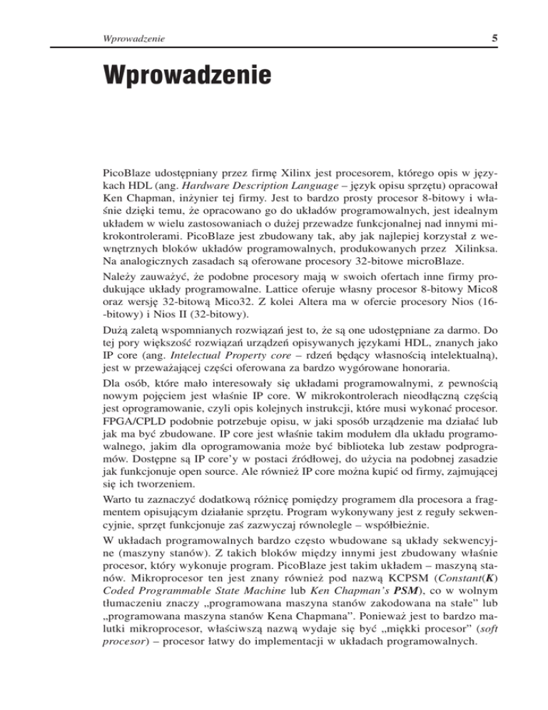 Wprowadzenie 5 Wprowadzenie PicoBlaze udostępniany przez firmę Xilinx jest procesorem, którego opis w językach HDL (ang. Hardware Description Language – język opisu sprzętu) opracował Ken Chapman, inżynier tej firmy. Jest to bardzo prosty procesor 8-bitowy i właśnie dzięki temu, że opracowano go do układów programowalnych, jest idealnym układem w wielu zastosowaniach o dużej przewadze funkcjonalnej nad innymi mikrokontrolerami. PicoBlaze jest zbudowany tak, aby jak najlepiej korzystał z wewnętrznych bloków układów programowalnych, produkowanych przez Xilinksa. Na analogicznych zasadach są oferowane procesory 32-bitowe microBlaze. Należy zauważyć, że podobne procesory mają w swoich ofertach inne firmy produkujące układy programowalne. Lattice oferuje własny procesor 8-bitowy Mico8 oraz wersję 32-bitową Mico32. Z kolei Altera ma w ofercie procesory Nios (16-bitowy) i Nios II (32-bitowy). Dużą zaletą wspomnianych rozwiązań jest to, że są one udostępniane za darmo. Do tej pory większość rozwiązań urządzeń opisywanych językami HDL, znanych jako IP core (ang. Intelectual Property core – rdzeń będący własnością intelektualną), jest w przeważającej części oferowana za bardzo wygórowane honoraria. Dla osób, które mało interesowały się układami programowalnymi, z pewnością nowym pojęciem jest właśnie IP core. W mikrokontrolerach nieodłączną częścią jest oprogramowanie, czyli opis kolejnych instrukcji, które musi wykonać procesor. FPGA/CPLD podobnie potrzebuje opisu, w jaki sposób urządzenie ma działać lub jak ma być zbudowane. IP core jest właśnie takim modułem dla układu programowalnego, jakim dla oprogramowania może być biblioteka lub zestaw podprogramów. Dostępne są IP core’y w postaci źródłowej, do użycia na podobnej zasadzie jak funkcjonuje open source. Ale również IP core można kupić od firmy, zajmującej się ich tworzeniem. Warto tu zaznaczyć dodatkową różnicę pomiędzy programem dla procesora a fragmentem opisującym działanie sprzętu. Program wykonywany jest z reguły sekwencyjnie, sprzęt funkcjonuje zaś zazwyczaj równolegle – współbieżnie. W układach programowalnych bardzo często wbudowane są układy sekwencyjne (maszyny stanów). Z takich bloków między innymi jest zbudowany właśnie procesor, który wykonuje program. PicoBlaze jest takim układem – maszyną stanów. Mikroprocesor ten jest znany również pod nazwą KCPSM (Constant(K) Coded Programmable State Machine lub Ken Chapman’s PSM), co w wolnym tłumaczeniu znaczy „programowana maszyna stanów zakodowana na stałe” lub „programowana maszyna stanów Kena Chapmana”. Ponieważ jest to bardzo malutki mikroprocesor, właściwszą nazwą wydaje się być „miękki procesor” (soft procesor) – procesor łatwy do implementacji w układach programowalnych. 6 Wprowadzenie Podstawową przewagą mikrokontrolerów implementowanych bezpośrednio w strukturach FGPA/CPLD nad innymi sprzętowymi realizacjami jest możliwość ich dowolnego kształtowania i dokonywania zmian bloków funkcjonalnych zgodnie z potrzebami. Porównajmy możliwości standardowych mikrokontrolerów z tym, co oferuje procesor w FPGA – tabela poniżej. Porównujemy tylko rozwiązania 8-bitowe, chociaż w przypadku FPGA istnieją projekty mikrokontrolerów 32-bitowych i są one z powodzeniem stosowane. Zestawienie cech wybranych mikrokontrolerów Opis\Mikrokontroler Pamięć RAM Rejestry Szerokość rejestru Pamięć programu (liczba słów) Szerokość instrukcji Liczba taktów zegara potrzebnych na wykonanie jednej instrukcji Licznik/timer Układ przerwań Porty zewnętrzne 8051 256 B 32 8 bitów 4k 8 bitów AVR ATTiny13 64 B 32 8 bitów 1k 8 bitów ST6215 64 B 5 8 bitów 2k 8 bitów PicoBlaze 64 B 16 8 bitów 1k 18 bitów 1 1 1 2 2 jest 4 1 jest 6 IO 2 jest 20 IO Oscylator wewnętrzny jest jest pomocniczy I2C – jest – – – jest – – – * jedno przerwanie * do 256 zależnie od użytego układu programowalnego * * * Kontroler Kontroler UART Kontroler SPI * – w zależności od implementacji HDL dana część mikrokontrolera może być dowolnie rozbudowana Powyższe zestawienie nie jest pełne, gdyż na rynku dostępnych jest wiele mikrokontrolerów z pamięciami RAM i Flash o różnej pojemności, liczbie linii IO i przeróżnymi układami peryferyjnymi. Ilustruje jednak dwie najważniejsze rzeczy: 1) Mikrokontroler PicoBlaze jest funkcjonalnie takim samym mikrokontrolerem jak większość 8-bitowych układów. 2) W układzie programowalnym możemy go skonfigurować z dowolną liczbą peryferii, ograniczoną zasobami układu FPGA/CPLD. Konfiguracje mikroprocesorowe Z punktu widzenia współdziałania mikroprocesorów i układów programowalnych można rozróżnić cztery główne konfiguracje mikroprocesorowe (rysunek z następnej strony). 1. Mikroprocesor. Połączenie mikroprocesora z układami peryferyjnymi w jeden układ scalony lub też jako kilka układów. Jest to jedna z najpopularniejszych obecnie konfiguracji. 2. Mikroprocesor/mikrokontroler plus układ programowalny. Wprowadzenie 7 Sposób implementowania kompletnego mikrokontrolera w układzie FPGA Obecnie najpopularniejsze zastosowanie układów FPGA/CPLD. Rozwiązanie sprawdza się znakomicie przy rozszerzaniu dobrych systemów procesorowych o kolejne możliwości, jakie dają układy programowalne. 3. Układy programowalne z wbudowanym procesorem (lub też odwrotnie: mikrokontroler z wbudowaną częścią FPGA w jednym układzie scalonym). Konfiguracja ta już jakiś czas temu była wprowadzona przez większość producentów układów programowalnych. Na przykład Xilinx wprowadził rodzinę układów FPGA Virtex II z wbudowanym co najmniej jednym procesorem PowerPC, Altera zaś rodzinę układów Excalibur, z wbudowanym procesorem ARM922T. Jednakże (prawdopodobnie ze względu na cenę takich układów) nie przyjęły się one na rynku. 4. Układy pr