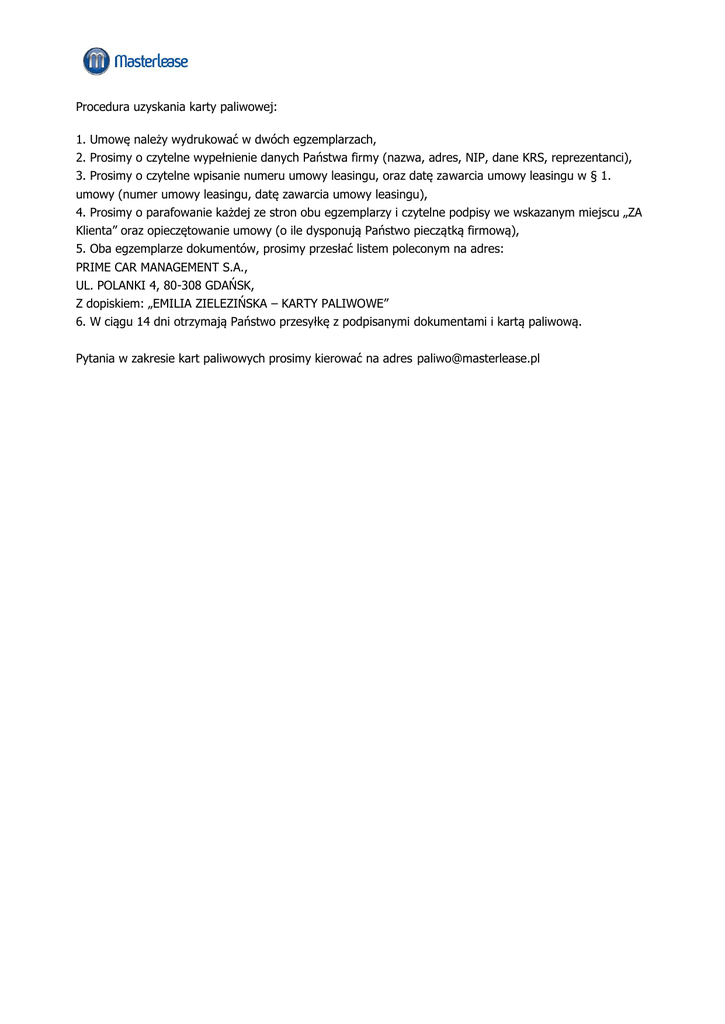 Procedura uzyskania karty paliwowej: 1. Umowę należy wydrukować w dwóch egzemplarzach, 2. Prosimy o czytelne wypełnienie danych Państwa firmy (nazwa, adres, NIP, dane KRS, reprezentanci), 3. Prosimy o czytelne wpisanie numeru umowy leasingu, oraz datę zawarcia umowy leasingu w § 1. umowy (numer umowy leasingu, datę zawarcia umowy leasingu), 4. Prosimy o parafowanie każdej ze stron obu egzemplarzy i czytelne podpisy we wskazanym miejscu „ZA Klienta” oraz opieczętowanie umowy (o ile dysponują Państwo pieczątką firmową), 5. Oba egzemplarze dokumentów, prosimy przesłać listem poleconym na adres: PRIME CAR MANAGEMENT S.A., UL. POLANKI 4, 80-308 GDAŃSK, Z dopiskiem: „EMILIA ZIELEZIŃSKA – KARTY PALIWOWE” 6. W ciągu 14 dni otrzymają Państwo przesyłkę z podpisanymi dokumentami i kartą paliwową. Pytania w zakresie kart paliwowych prosimy kierować na adres [email protected] UMOWA SPRZEDAŻY PALIW W SYSTEMIE BEZGOTÓWKOWYM PRZY UŻYCIU KART FLOTOWYCH zawarta w Gdańsku w dniu ……………………………..r., pomiędzy: „PRIME CAR MANAGEMENT” Spółka Akcyjna z siedzibą w Gdańsku 80-308, przy ul. Polanki 4, NIP: 9570753221, wpisaną do Krajowego Rejestru Sądowego prowadzonego przez Sąd Rejonowy w Gdańsku pod nr 0000013870 , zwaną dalej „PCM”, reprezentowaną przez: 1. JURAND FILIPCZYK – PEŁNOMOCNIK a …………………………………………………………………………………………. z siedzibą w ……………………………………………………………………, NIP:………………………………….. wpisaną do Krajowego Rejestru Sądowego prowadzonego przez Sąd Rejonowy ........................................... Wydział Gospodarczy pod numerem ..........................., zwaną dalej „Klientem” , reprezentowaną przez: 1. 2. ………………………………………………………………….. ………………………………………………………………….. określanymi dalej łącznie „Stronami”. Użyte w niniejszej umowie poniższe pojęcia oznaczają: a) Klient – podmiot będący stroną niniejszej umowy, będący Korzystającym na podstawie umowy leasingu, b) PCM – podmiot będący stroną niniejszej umowy, będący Finansującym na podstawie umowy leasingu tj. Prime Car Management S.A. z siedzibą w Gdańsku, c) Partner Handlowy- dostawca i sprzedający PCM w systemie bezgotówkowym paliwa ciekłe i gazowe za pośrednictwem stacji paliw, dostarczający karty flotowe, użytkowane przez Klienta. d) Stacje paliw- punkty sprzedaży paliw położone na terenie Polski i za granicami Polski, honorujące Karty Flotowe, uczestniczące w międzynarodowym systemie obsługi kart płatniczych, e) Karta Flotowa – karta paliwowa, będąca własnością Partnera Handlowego, wystawiona na PCM, upoważniająca Klienta do nabywania, na wybranych stacjach paliw, w systemie bezgotówkowym, paliw ciekłych i gazowych oraz innego, oferowanego przez stacje paliw, asortymentu i usług, których dostępność określona jest odrębnie dla każdej karty paliwowej do pojazdów używanych przez Klienta na podstawie umowy leasingu oraz innego, oferowanego przez stacje paliw, asortymentu, którego dostępność określona jest odrębnie dla każdej karty paliwowej. Zakres asortymentu i usług karty flotowej określona jest w Załączniku nr 2 stanowiącym integralną część niniejszej umowy. f) Kierowca – osoba, którą Klient wskazał PCM jako uprawnioną do używania karty flotowej, czynności takiej osoby związane z używaniem karty flotowej uważane są za czynności Klienta, g) Transakcje Bezgotówkowe – zakupy przez Klienta paliw na stacji paliw poprzez użycie Kart Flotowych, po których następuje uregulowanie należności przez Klienta na podstawie zbiorczej Faktury Vat za dany okres rozliczeniowy. § 1. 1. Przedmiotem niniejszej umowy jest określenie zasad i trybu współpracy między Stronami w zakresie zakupu do pojazdów używanych , na podstawie umowy leasingu z dnia ……………………. nr …………………………………….paliw ciekłych i gazowych tj. wszystkich rodzajów benzyny, oleju napędowego, auto –gazu oraz innego, oferowanego przez stacje paliw, asortymentu, którego dostępność określona jest odrębnie dla każdej karty paliwowej, na stacjach paliw honorujących Karty Flotowe, uczestniczących w międzynarodowym systemie obsługi kart płatniczych. Niniejsza umowa określa zasady wydawania i używania przez Klienta Kart Flotowych, a także zasady rozliczeń za dokonane Transakcje Bezgotówkowe dokonywane przez Klienta przy użyciu Kart Flotowych w sieci stacji paliw honorujących Karty Flotowe. 2. Sprzedaż o której mowa w ust.1 będzie dokonywana poprzez Transakcje Bezgotówkowe przy użyciu Kart Flotowych. § 2. 1. Klient ponosi pełną odpowiedzialność oraz wszelkie konsekwencje wynikające z użycia Karty Flotowej przez osoby nie upoważnione. 2. Zasady korzystania z Kart Flotowych określone będą każdorazowo dla danego rodzaju Kart Flotowych w Załączniku nr1 do niniejszej umowy. § 3. 1. Ustala się następujące okresy rozliczeniowe dla Transakcji Bezgotówkowych: Okres rozliczeniowy pomiędzy PCM a Klientem od 1 do ostatniego dnia miesiąca kalendarzowego. Za datę sprzedaży uznaje się ostatni dzień danego okresu rozliczeniowego. Zbiorcza Faktura Vat wraz z raportem z dokonanych Transakcji Bezgotówkowych za dany okres rozliczeniowy będzie wystawiana do 10 – ego dnia miesiąca następującego po okresie rozliczeniowym. 2. Płatności należności z tytułu Transakcji Bezgotówkowych dokonywane będą przez Klienta przelewem w terminie 14 dni od dnia wystawienia faktury Vat. Za datę zapłaty uznaje się datę wpływu należności na rachunek bankowy PCM. 3. Płatności należności z tytułu Transakcji Bezgotówkowych będą przez PCM księgowane na tym samym rachunku, na którym księgowane są opłaty wynikaj