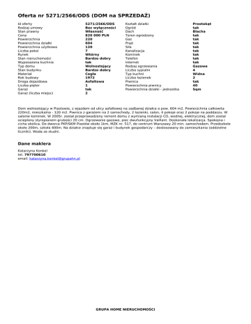 Oferta nr 5271/2566/ODS (DOM na SPRZEDAŻ) Id oferty Rodzaj umowy Stan prawny Cena Powierzchnia Powierzchnia działki Powierzchnia użytkowa Liczba pokoi Rynek Stan nieruchomości Wyposażona kuchnia Typ domu Stan budynku Materiał Rok budowy Droga dojazdowa Liczba pięter Garaż Garaż (liczba miejsc) 5271/2566/ODS Bez wyłączności Własność 820 000 PLN 220 604 120 7 Wtórny Bardzo dobry tak Wolnostojący Bardzo dobry Cegła 1972 Asfaltowa 1 tak 2 Kształt działki Ogród Dach Teren ogrodzony Gaz Prąd Siła Kanalizacja Kominek Telefon Internet Rodzaj ogrzewania Liczba sypialni Typ kuchni Liczba łazienek Piwnica Powierzchnia piwnicy Powierzchnia działki - jednostka Prostokąt tak Blacha tak tak tak tak tak tak tak tak Gazowe 4 Widna 2 tak 40 Sqm Dom wolnostojący w Piastowie, z wjazdem od ulicy asfaltowej na zadbanej działce o pow. 604 m2. Powierzchnia całkowita 220m2, mieszkalna - 120 m2. Piwnica z garażem na 2 samochody, 2 łazienki, salon, 4 pokoje oraz 2 pokoje na poddaszu. W salonie kominek. W 2005r. został przeprowadzony remont domu z wymianą instalacji CO, wodnej, elektrycznej, dom został ocieplony styropianem grubości 20 cm. Ogrzewanie gazowe, piec dwufunkcyjny Vaillant. Doskonała lokalizacja. Spokojna i cicha okolica. Do dworca PKP/SKM Piastów około 1km, MZK nr. 517, do centrum Warszawy 20 min. samochodem. Przedszkole około 200m, szkoła 400m. Na działce znajduje się garaż i budynek gospodarczy – dostosowany do zamieszkania (oddzielne liczniki). Woda ze studni. Dane maklera Katarzyna Konkel tel. 797700610 email: [email protected] GRUPA HOME NIERUCHOMOŚCI Powered by TCPDF (www.tcpdf.org)