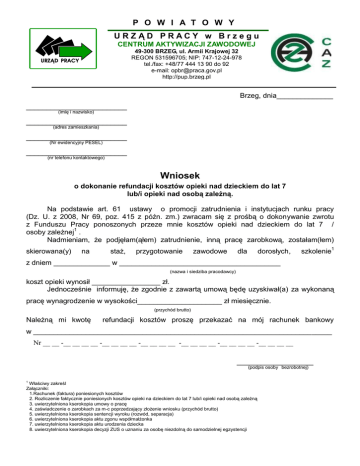 P O W I A T O W Y URZ ĄD PRACY w Brz egu CENTRUM AKTYWIZACJI ZAWODOWEJ 49-300 BRZEG, ul. Armii Krajowej 32 REGON 531596705; NIP: 747-12-24-978 tel./fax: +48/77 444 13 90 do 92 e-mail: [email protected] http://pup.brzeg.pl Brzeg, dnia______________ _________________________ (imię i nazwisko) _________________________ (adres zamieszkania) _________________________ (Nr ewidencyjny PESEL) _________________________ (nr telefonu kontaktowego) Wniosek o dokonanie refundacji kosztów opieki nad dzieckiem do lat 7 lub/i opieki nad osobą zależną. Na podstawie art. 61 ustawy o promocji zatrudnienia i instytucjach runku pracy (Dz. U. z 2008, Nr 69, poz. 415 z późn. zm.) zwracam się z prośbą o dokonywanie zwrotu z Funduszu Pracy ponoszonych przeze mnie kosztów opieki nad dzieckiem do lat 7 / osoby zależnej1 . Nadmieniam, że podjęłam(ąłem) zatrudnienie, inną pracę zarobkową, zostałam(łem) skierowana(y) na staż, przygotowanie zawodowe dla dorosłych, szkolenie1 z dniem ______________ w ________________________________________ (nazwa i siedziba pracodawcy) koszt opieki wynosił _________________ zł. Jednocześnie informuję, że zgodnie z zawartą umową będę uzyskiwał(a) za wykonaną pracę wynagrodzenie w wysokości_____________________ zł miesięcznie. (przychód brutto) Należną mi kwotę refundacji kosztów proszę przekazać na mój rachunek bankowy w __________________________________________________________________________ Nr __ __ -__ __ __ __ -__ __ __ __ -__ __ __ __ -__ __ __ __ -__ __ __ __ -__ __ __ __ ___________________ (podpis osoby bezrobotnej) 1 Właściwy zakreśl Załączniki: 1.Rachunek (faktura) poniesionych kosztów 2. Rozliczenie faktycznie poniesionych kosztów opieki na dzieckiem do lat 7 lub/i opieki nad osobą zależną 3. uwierzytelniona kserokopia umowy o pracę 4. zaświadczenie o zarobkach za m-c poprzedzający złożenie wniosku (przychód brutto) 5. uwierzytelniona kserokopia sentencji wyroku (rozwód, separacja) 6. uwierzytelniona kserokopia aktu zgonu współmałżonka 7. uwierzytelniona kserokopia aktu urodzenia dziecka 8. uwierzytelniona kserokopia decyzji ZUS o uznaniu za osobę niezdolną do samodzielnej egzystencji _________________________________ (imię i nazwisko) _________________________________ (adres zamieszkania) _________________________________ (PESEL) _________________________________ (nr telefonu kontaktowego) ROZLICZENIE FAKTYCZNIE PONIESIONYCH KOSZTÓW OPIEKI NAD DZIECKIEM DO LAT 7 - OPIEKI NAD OSOBĄ ZALEŻNĄ W miesiącu _________________ 2010 r. z tytułu opieki nad dzieckiem w wieku do lat 7 / osoby zależnej poniosłem/am/ koszty w wysokości: 1)__________________________data ur. __________ poniesiony koszt _______zł (imię i nazwisko dziecka/osoby zależnej) 2)__________________________data ur. __________poniesiony koszt ________zł (imię i nazwisko dziecka/osoby zależnej) 3___________________________data ur. __________poniesiony koszt ________zł (imię i nazwisko dziecka/osoby zależnej) Razem _______________________zł Jednocześnie oświadczam pod odpowiedzialnością karną, że:*) za rozliczony miesiąc uzyskałem /am/ wynagrodzenie w wysokości_________ zł nadal odbywam staż / szkolenie / przygotowanie zawodowe dla dorosłych. nadal jestem osobą samotnie wychowującą co najmniej jedno dziecko w wieku do lat 7 / opiekuję się osobą zależną**. _________________________ (podpis osoby bezrobotnej) _______________________________ * - zaznaczyć odpowiednio (zaznaczyć X) ** - niepotrzebne skreślić ADNOTACJE URZĘDOWE: Przyznano zwrot opieki nad ________ dzieckiem/dzieci/dziećmi** za ____________________ w wysokości:_____________ zł. słownie: ____________________________________________________________ ________________________ (podpis pracownika PUP) miesiąc