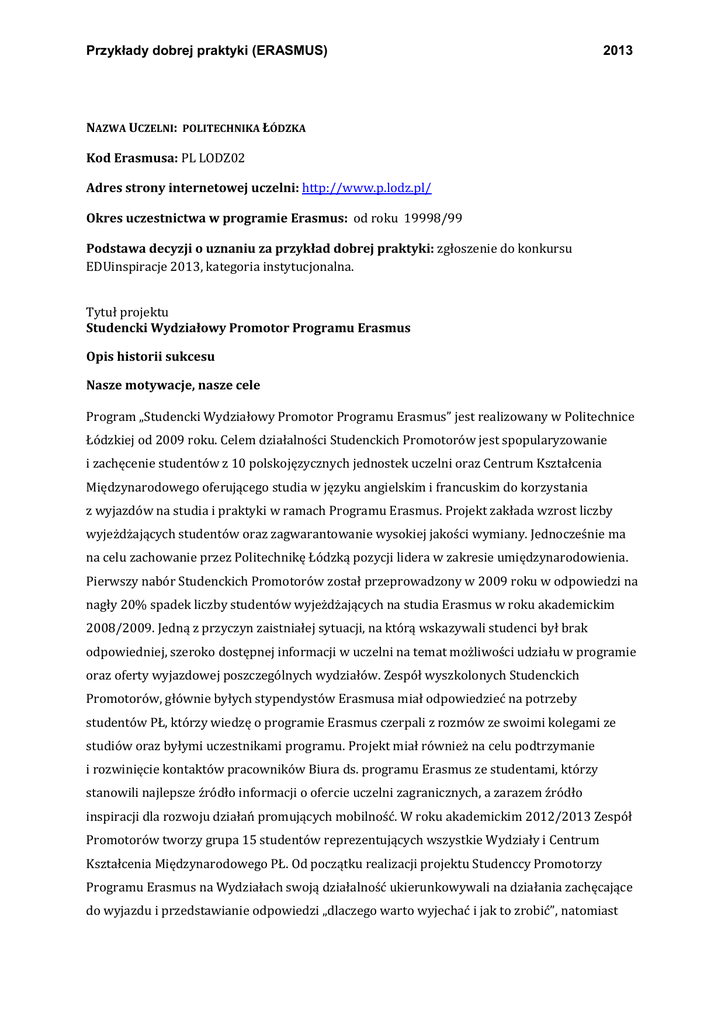 Przykłady dobrej praktyki (ERASMUS) 2013 NAZWA UCZELNI: POLITECHNIKA ŁÓDZKA Kod Erasmusa: PL LODZ02 Adres strony internetowej uczelni: http://www.p.lodz.pl/ Okres uczestnictwa w programie Erasmus: od roku 19998/99 Podstawa decyzji o uznaniu za przykład dobrej praktyki: zgłoszenie do konkursu EDUinspiracje 2013, kategoria instytucjonalna. Tytuł projektu Studencki Wydziałowy Promotor Programu Erasmus Opis historii sukcesu Nasze motywacje, nasze cele Program „Studencki Wydziałowy Promotor Programu Erasmus” jest realizowany w Politechnice Łódzkiej od 2009 roku. Celem działalności Studenckich Promotorów jest spopularyzowanie i zachęcenie studentów z 10 polskojęzycznych jednostek uczelni oraz Centrum Kształcenia Międzynarodowego oferującego studia w języku angielskim i francuskim do korzystania z wyjazdów na studia i praktyki w ramach Programu Erasmus. Projekt zakłada wzrost liczby wyjeżdżających studentów oraz zagwarantowanie wysokiej jakości wymiany. Jednocześnie ma na celu zachowanie przez Politechnikę Łódzką pozycji lidera w zakresie umiędzynarodowienia. Pierwszy nabór Studenckich Promotorów został przeprowadzony w 2009 roku w odpowiedzi na nagły 20% spadek liczby studentów wyjeżdżających na studia Erasmus w roku akademickim 2008/2009. Jedną z przyczyn zaistniałej sytuacji, na którą wskazywali studenci był brak odpowiedniej, szeroko dostępnej informacji w uczelni na temat możliwości udziału w programie oraz oferty wyjazdowej poszczególnych wydziałów. Zespół wyszkolonych Studenckich Promotorów, głównie byłych stypendystów Erasmusa miał odpowiedzieć na potrzeby studentów PŁ, którzy wiedzę o programie Erasmus czerpali z rozmów ze swoimi kolegami ze studiów oraz byłymi uczestnikami programu. Projekt miał również na celu podtrzymanie i rozwinięcie kontaktów pracowników Biura ds. programu Erasmus ze studentami, którzy stanowili najlepsze źródło informacji o ofercie uczelni zagranicznych, a zarazem źródło inspiracji dla rozwoju działań promujących mobilność. W roku akademickim 2012/2013 Zespół Promotorów tworzy grupa 15 studentów reprezentujących wszystkie Wydziały i Centrum Kształcenia Międzynarodowego PŁ. Od początku realizacji projektu Studenccy Promotorzy Programu Erasmus na Wydziałach swoją działalność ukierunkowywali na działania zachęcające do wyjazdu i przedstawianie odpowiedzi „dlaczego warto wyjechać i jak to zrobić”, natomiast Przykłady dobrej praktyki (ERASMUS) 2013 Promotorzy z CKM PŁ, którzy wyjazd mają wpisany w program studiów koncentrowali się na odpowiedziach „do jakiej uczelni warto wyjechać i na jaki program studiów”. Największe emocje towarzyszą organizatorom projektu przy kolejnych naborach Studenckich Promotorów i ich działalności. Organizatorzy zadają sobie pytanie, czy znajdą się chętni, którzy wolontarystycznie przez okres jednego roku akademickiego będą wspierać Biuro ds. programu Erasmus i Stowarzyszenie ESN-EYE w promocji mobilności w Politechnice Łódzkiej. Kolejne lata realizacji projektu pokazują jednak wyraźnie, że zmotywowanych studentów nie brakuje, a program doczekał się powołania grupy Promotorów Seniorów – obecnie absolwentów PŁ, którzy służą radą i wsparciem nowym członkom projektu. Wyzwania Do osiągnięcia sukcesu potrzebna była bardzo dobra współpraca osób zajmujących się w PŁ realizacją programu Erasmus: pracowników Biura ds. programu Erasmus, koordynatorów wydziałowych, pracowników Dziekanatów oraz studentów ze Stowarzyszenia ESN-EYE przy akceptacji władz PŁ. Ważnym czynnikiem w osiągnięciu sukcesu było zaangażowanie i wiara w powodzenie projektu osoby koordynującej projekt oraz przede wszystkim zaangażowanie samych Studenckich Promotorów – wolontariuszy, którzy dzięki własnym pomysłom i działaniom wpływali na decyzje kolejnych studentów o wyjeździe, pomagając im w przygotowaniach i realizacji pobytu za granicą. Nakład pracy przy realizacji projektu jest znaczący zarówno po stronie koordynatora projektu, jak i kandydatów na Studenckich Promotorów, a następnie członków zespołu. Pierwszym krokiem podejmowanym przez koordynatora jest promocja naboru na Studenckich Promotorów i przeprowadzenie kwalifikacji. W kwalifikacji studentów jest brana pod uwagę motywacja do pełnienia funkcji Promotora, komunikatywna znajomość języka obcego oraz doświadczenie związane z wymianą zagraniczną. Kandydaci przystępujący do kwalifikacji przedstawiają cele, które chcą zrealizować na wydziale w następnym roku akademickim i przygotowują „Przewodnik z wyjazdu na stypendium Erasmus”. Z każdym kandydatem przeprowadzona jest rozmowa, w której określane są oczekiwania obydwu stron dotyczące przyszłej współpracy. Wartość projektu polega na ciągłym kontakcie ze studentami oraz uznawaniu przez pracowników Biura rozwiązań proponowanych przez studentów na rzecz promocji mobilności. Studenci nie otrzymują materialnych profitów, ale zdobywają doświadczenie i kompetencje wykraczające poza ich kierunek kształcenia. Po roku działalności otrzymują również referencje od Uczelnianego Koordynatora Programu Erasmus i Prorektora właściwego za realizację programu Erasmus w PŁ. Pełnienie funkcji Studenckiego Promotora jest również odnotowane w Suplemencie do Dyplomu jako dodatkowe osiągnięcie. Najlepsze doświadczenia z projektu to opracowanie i realizacja kampanii promocyjnej „Erasmus to proste, Erasmus is easy”, współpraca przy organizacji imprez w tym Przykłady dobrej praktyki (ERASMUS) 2013 Mobility Week, opracowanie broszury informacyjnej dla studentów wyjeżdżających na studia oraz założenie i administrowanie profilem Erasmus Politechnika Łódzka na portalu społecznościowym Facebook. Największą satysfakcją jest powstanie społeczności Erasmusa w Politechnice Łódzkiej - grupy ludzi korzystającej z różnych form