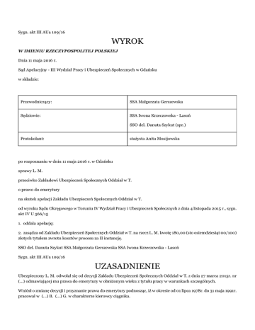 Sygn. akt III AUa 109/16 WYROK W IMIENIU RZECZYPOSPOLITEJ POLSKIEJ Dnia 11 maja 2016 r. Sąd Apelacyjny - III Wydział Pracy i Ubezpieczeń Społecznych w Gdańsku w składzie: Przewodniczący: SSA Małgorzata Gerszewska Sędziowie: SSA Iwona Krzeczowska - Lasoń SSO del. Danuta Szykut (spr.) Protokolant: stażysta Anita Musijowska po rozpoznaniu w dniu 11 maja 2016 r. w Gdańsku sprawy L. M. przeciwko Zakładowi Ubezpieczeń Społecznych Oddział w T. o prawo do emerytury na skutek apelacji Zakładu Ubezpieczeń Społecznych Oddział w T. od wyroku Sądu Okręgowego w Toruniu IV Wydział Pracy i Ubezpieczeń Społecznych z dnia 4 listopada 2015 r., sygn. akt IV U 566/15 1. oddala apelację; 2. zasądza od Zakładu Ubezpieczeń Społecznych Oddział w T. na rzecz L. M. kwotę 180,00 (sto osiemdziesiąt 00/100) złotych tytułem zwrotu kosztów procesu za II instancję. SSO del. Danuta Szykut SSA Małgorzata Gerszewska SSA Iwona Krzeczowska - Lasoń Sygn. akt III AUa 109/16 UZASADNIENIE Ubezpieczony L. M. odwołał się od decyzji Zakładu Ubezpieczeń Społecznych Oddział w T. z dnia 27 marca 2015r. nr (...) odmawiającej mu prawa do emerytury w obniżonym wieku z tytułu pracy w warunkach szczególnych. Wniósł o zmianę decyzji i przyznanie prawa do emerytury podnosząc, iż w okresie od 01 lipca 1978r. do 31 maja 1991r. pracował w (...) B. (...) G. w charakterze kierowcy ciągnika. Pozwany organ rentowy – Zakład Ubezpieczeń Społecznych Oddział w T. wniósł o oddalenie odwołania . Pozwany podniósł, iż ubezpieczony według stanu na dzień 01 stycznia 1999r. wykazał 25 lat okresów składkowych i uzupełniających, w tym 5 lat, 5 miesięcy i 13 dni okresów wykonywania pracy w szczególnych warunkach. Pozwany wyjaśnił, iż nie uwzględnił spornego okresu do stażu pracy w warunkach szczególnych wobec braku świadectwa wykonywania pracy w warunkach szczególnych. Sąd Okręgowy w Toruniu IV Wydział Pracy i Ubezpieczeń Społecznych wyrokiem z dnia 4 listopada 2015 roku, sygn. akt IV U 566/15 zmienił zaskarżoną decyzję w ten sposób, że przyznał ubezpieczonemu L. M. prawo do emerytury od dnia (...) roku (pkt I wyroku) oraz nie stwierdził odpowiedzialności organu rentowego za nieustalenie ostatniej okoliczności niezbędnej do wydania decyzji (pkt II wyroku). Powyższe rozstrzygnięcie Sąd Okręgowy oparł na następujących ustaleniach i rozważaniach. L. M. urodził się (...), z zawodu jest traktorzystą. W chwili ukończenia 60 roku życia ubezpieczony pozostawał w stosunku pracy ( do 31 marca 2015 roku), nie był chory. W dniu 16 lutego 2015 r. L. M. wystąpił z wnioskiem o przyznanie prawa do emerytury. W chwili złożenia wniosku i wydania decyzji nie był członkiem otwartego funduszu emerytalnego. W dniu 27 marca 2015 r. organ rentowy wydał zaskarżoną decyzję. Na dzień 1 stycznia 1999 roku ZUS przyjął za udowodnione 25 lat okresów składkowych i uzupełniających, w tym 5 lat, 5 miesięcy i 13 dni pracy w szczególnych warunkach – od 19 lipca 1993r. do 31 grudnia 1998r. w Przedsiębiorstwie Budowlano – (...) w B.. W toku aktywności zawodowej ubezpieczony stale i w pełnym wymiarze czasu pracy pracował od 1 lipca 1978 r. do 31 maja 1991 r. w Spółdzielni Kółek Rolniczych w B. w Zakładzie Usług (...) w G. na stanowisku traktorzysty. Pracowało tam w różnych okresach czasu 7-15 traktorzystów. Ubezpieczony wykonywał różne prace rolnicze, wymagające użycia traktora, na rzecz rolników indywidualnych m.in. orkę, opryski, zbiór buraków i ziemniaków, a także wykonywał prace transportowe na rzecz innych podmiotów, przede wszystkim (...) Przedsiębiorstwa (...), przewoził różnego rodzaju materiały budowlane: wapno, żwir, beton, betonowe kręgi. Ubezpieczony kierował ciągnikiem marki U. (...). W razie awarii przesiadał się na inny, jako że było więcej ciągników niż kierowców. W okresie zwiększonej liczby prac rolniczych ubezpieczony często pracował w nadgodzinach, wykonując prace transportowe, a następnie polowe. W okresie zimowym skarżący wykorzystywał urlop wypoczynkowy, nie wykonywał prac naprawczych w warsztacie. L. M. posiada uprawnienia do prowadzenia ciągników od 27 sierpnia 1974 r. B. M. był zatrudniony w (...) w B. w okresie od 3 lutego 1975 r. do 31 lipca 1991 r. jako mechanik, potem przez 2-3 lata jako p.o. kierownika (...) i od 1986 roku jako kierownik (...). Był bezpośrednim przełożonym ubezpieczonego. Jako kierownik rozdzielał pracę traktorzystom, wypełniał i wydawał im karty drogowe, a także zbierał je od nich po skończonej pracy. W kartach znajdowało się poświadczenie wykonania pracy. Pracując jako mechanik, widział ubezpieczonego na ciągniku. D. D. (1) był zatrudniony w (...) w B. w okresie od 10 lipca 1987 r. do 30 kwietnia 1990 r. jako traktorzysta-mechanik. W okresie zatrudnienia D. D. (1) ubezpieczony wykonywał prace transportowe ciągnikiem na rzecz przedsiębiorstwa Melioracyjnego w B., miał tam stałe zlecenie. Powyższy stan faktyczny Sąd Okręgowy ustalił na podstawie dokumentów zgromadzonych w aktach sądowych, w tym w aktach organu rentowego, a także zeznań świadka B. M. i częściowo zeznań świadka D. D. (1) oraz dowodu z przesłuchania ubezpieczonego. Sąd dał wiarę dowodom z dokumentów, gdyż były jasne, pełne, rzetelne, a nadto żadna ze stron nie kwestionowała ich autentyczności i mocy dowodowej i nie budziły one także wątpliwości Sądu. Sąd Okręgowy w pełni dał wiarę zeznaniom świadka B. M. oraz ubezpieczonego, co do charakteru wykonywanych przez ubezpieczonego czynności w (...) w B., gdyż zeznania te były spontaniczne, szczere, wzajemnie zgodne i spójne. Świadek ten pracował razem z ubezpieczonym w spornym okresie, przez kilka lat był nawet jego bezpośrednim przełożonym i osobiście wyznaczał mu pracę do wykonania na dany dzień, a także zajmował się kartami drogowymi, dlatego też miał niewątpliwe bardzo