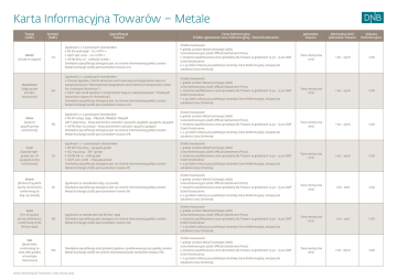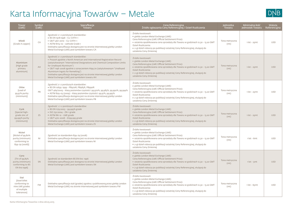 Karta Informacyjna Towarów – Metale Towar (LME) Miedź [Grade A copper] Aluminium [High grade primary aluminium] Ołów [Lead of 99,97% purity (minimum)] Cynk [Special highgrade zinc of 99.995% purity (minimum)] Nickel [Nickel of 99,80% purity (minimum) conforming to B39-79 (2008)] Cyna [Tin of 99,85% purity (minimum) conforming to BS EN 610:1996] Stal [Steel billet conforming to nine LME grades of multiple tolerances] Symbol (LME) Cena Referencyjna Źródło ogłaszania Ceny Referencyjnej / Dzień Rozliczenia Jednostka Towaru Minimalna ilość Jednostek Towaru Waluta Referencyjna CA Zgodność z 1 z poniższych standardów: BS EN 1978:1998 - Cu-CATH-1 GB/T 467-2010 - Cu-CATH-1 ASTM B115-10 - cathode Grade 1 Dokładna specyfikacja dostępna jest na stronie internetowej giełdy London Metal Exchange (LME) pod symbolem towaru CA Źródło kwotowań: giełda London Metal Exchange (LME) Cena Referencyjna (LME Official Settlement Price): ostatnia opublikowana cena sprzedaży dla Towaru w godzinach 12.30 - 13.20 GMT Dzień Rozliczenia: 2-gi dzień roboczy po publikacji ostatniej Ceny Referencyjnej, służącej do ustalenia Ceny Zmiennej Tona metryczna (mt) 1 lot - 25mt USD AH Zgodność z 1 z poniższych standardów: P1020A zgodnie z North American and International Registration Record (zatytułowanym “International Designations and Chemical Composition Limits for Unalloyed Aluminum”) GB/T 1196-2008 zgodnie z oznaczeniem AI99.70 (zatytułowanym “Unalloyed Aluminium Ingots for Remelting”) Dokładna specyfikacja dostępna jest na stronie internetowej giełdy London Metal Exchange (LME) pod symbolem towaru AH Źródło kwotowań: giełda London Metal Exchange (LME) Cena Referencyjna (LME Official Settlement Price): ostatnia opublikowana cena sprzedaży dla Towaru w godzinach 12.30 - 13.20 GMT Dzień Rozliczenia: 2-gi dzień roboczy po publikacji ostatniej Ceny Referencyjnej, służącej do ustalenia Ceny Zmiennej Tona metryczna (mt) 1 lot - 25mt USD PB Zgodność z 1 z poniższych standardów: BS EN 12659: 1999 - PB970R, PB985R, PB990R GB/T 469/2005 - klasy poziomów czystości: 99,970%, 99,985%, 99,990%, 99,994% ASTM B29-03 (2009) - klasy poziomów czystości: 99,97%, 99,995% Dokładna specyfikacja dostępna jest na stronie internetowej giełdy London Metal Exchange (LME) pod symbolem towaru PB Źródło kwotowań: giełda London Metal Exchange (LME) Cena Referencyjna (LME Official Settlement Price): ostatnia opublikowana cena sprzedaży dla Towaru w godzinach 12.30 - 13.20 GMT Dzień Rozliczenia: 2-gi dzień roboczy po publikacji ostatniej Ceny Referencyjnej, służącej do ustalenia Ceny Zmiennej Tona metryczna (mt) 1 lot - 25mt USD ZS Zgodność z 1 z poniższych standardów: BS EN 1179:2003 - 99.995% grade ISO 752:2004 - ZN-1 grade ASTM B6-12 - LME grade GB/T 470-2008 - Zn99.995 grade Dokładna specyfikacja dostępna jest na stronie internetowej giełdy London Metal Exchange (LME) pod symbolem towaru ZS Źródło kwotowań: giełda London Metal Exchange (LME) Cena Referencyjna (LME Official Settlement Price): ostatnia opublikowana cena sprzedaży dla Towaru w godzinach 12.30 - 13.20 GMT Dzień Rozliczenia: 2-gi dzień roboczy po publikacji ostatniej Ceny Referencyjnej, służącej do ustalenia Ceny Zmiennej Tona metryczna (mt) 1 lot - 25mt USD Zgodność ze standardem B39-79 (2008) Dokładna specyfikacja dostępna jest na stronie internetowej giełdy London Metal Exchange (LME) pod symbolem towaru NI Źródło kwotowań: giełda London Metal Exchange (LME) Cena Referencyjna (LME Official Settlement Price): ostatnia opublikowana cena sprzedaży dla Towaru w godzinach 12.30 - 13.20 GMT Dzień Rozliczenia: 2-gi dzień roboczy po publikacji ostatniej Ceny Referencyjnej, służącej do ustalenia Ceny Zmiennej Tona metryczna (mt) 1 lot - 6mt USD Zgodność ze standardem BS EN 610: 1996 Dokładna specyfikacja jest dostępna na stronie internetowej giełdy London Metal Exchange (LME) pod symbolem towaru SN Źródło kwotowań: giełda London Metal Exchange (LME) Cena Referencyjna (LME Official Settlement Price): ostatnia opublikowana cena sprzedaży dla Towaru w godzinach 12.30 - 13.20 GMT Dzień Rozliczenia: 2-gi dzień roboczy po publikacji ostatniej Ceny Referencyjnej, służącej do ustalenia Ceny Zmiennej Tona metryczna (mt) 1 lot - 5mt USD Dokładna specyfikacja stali (grades) zgodna z publikowaną przez giełdę London Metal Exchange (LME) na stronie internetowej pod symbolem towaru FM Źródło kwotowań: giełda London Metal Exchange (LME) Cena Referencyjna (LME Official Settlement Price): ostatnia opublikowana cena sprzedaży dla Towaru w godzinach 12.30 - 13.20 GMT Dzień Rozliczenia: 2-gi dzień roboczy po publikacji ostatniej Ceny Referencyjnej, służącej do ustalenia Ceny Zmiennej Tona metryczna (mt) 1 lot - 65mt USD NI SN FM Specyfikacja Towaru Karta Infomacyjna Towarów z dnia 08.05.2015