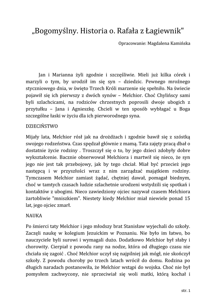 „Bogomyślny. Historia o. Rafała z Łagiewnik" Opracowanie: Magdalena Kamińska Jan i Marianna żyli zgodnie i szczęśliwie. Mieli już kilka córek i marzyli o tym, by urodził im się syn – dziedzic. Pewnego mroźnego styczniowego dnia, w święto Trzech Króli marzenie się spełniło. Na świecie pojawił się ich pierwszy z dwóch synów – Melchior. Choć Chylińscy sami byli szlachcicami, na rodziców chrzestnych poprosili dwoje ubogich z przytułku – Jana i Agnieszkę. Chcieli w ten sposób wybłagać u Boga szczególne łaski w życiu dla ich pierworodnego syna. DZIECIŃSTWO Mijały lata, Melchior rósł jak na drożdżach i zgodnie bawił się z szóstką swojego rodzeństwa. Czas spędzał głównie z mamą. Tata zajęty pracą dbał o dostatnie życie rodziny . Troszczył się o to, by jego dzieci zdobyły dobre wykształcenie. Bacznie obserwował Melchiora i martwił się nieco, że syn jego nie jest tak przebojowy, jak by tego chciał. Miał być przecież jego następcą i w przyszłości wraz z nim zarządzać majątkiem rodziny. Tymczasem Melchior zamiast żądać, chętniej dawał, pomagał biednym, choć w tamtych czasach ludzie szlachetnie urodzeni wstydzili się spotkań i kontaktów z ubogimi. Nieco zawiedziony ojciec nazywał czasem Melchiora żartobliwie "mniszkiem". Niestety kiedy Melchior miał niewiele ponad 15 lat, jego ojciec zmarł. NAUKA Po śmierci taty Melchior i jego młodszy brat Stanisław wyjechali do szkoły. Zaczęli naukę w kolegium Jezuickim w Poznaniu. Nie było im łatwo, bo nauczyciele byli surowi i wymagali dużo. Dodatkowo Melchior był słaby i chorowity. Cierpiał z powodu rany na nodze, która od długiego czasu nie chciała się zagoić . Choć Melchior uczył się najpilniej jak mógł, nie skończył szkoły. Z powodu choroby po trzech latach wrócił do domu. Rodzina po długich naradach postanowiła, że Melchior wstąpi do wojska. Choć nie był pomysłem zachwycony, nie sprzeciwiał się woli matki, którą kochał i str. 1 szanował. W wojsku dobrze wykonywał swoje obowiązki, ale czuł, że nie pasuje do grona żołnierzy. Czuł, że jest inny i ma w życiu inne cele i pragnienia. Kiedy skończył 21 lat i stał się pełnoletni, postanowił opuścić jednostkę i pójść własną drogą. Wstąpił do klasztoru franciszkanów w Krakowie. ZAKONNE ŻYCIE Zgodnie ze zwyczajem Melchior przyjął habit i nowe zakonne imię – Rafał. Postanowiono, że Rafał będzie uczył się dalej, by móc w przyszłości zostać nie tylko zakonnikiem, ale i kapłanem. Rafał był sumienny i pracowity. Wiele czasu spędzał na modlitwie. Unikał towarzystwa, za to często rozmawiał z Bogiem. Pewnie dlatego wśród innych młodych zakonników uchodził za dziwaka i samotnika. Mówili o nim, że jest "bogomyślny" czyli połączony w myślach z Bogiem. Z modlitw najbardziej lubił te najprostsze : „Ojcze nasz”, czy „Zdrowaś Mario”. Niezwykle lubił też śpiewać i przygrywać religijne pieśni. Po kilku miesiącach przełożeni zdecydowali, że Rafał opuści klasztor w Krakowie , a naukę dokończy w Piotrkowie. Tam jego mistrzem i nauczycielem został o. Antoni Rożański. Młody Rafał od początku chciał iść drogą, jaką wyznaczał patron zakonu – święty Franciszek z Asyżu. Chciał zgodnie z regułą zakonu "żyć w posłuszeństwie, bez własności i w czystości". Często tak bardzo posłusznie i bez narzekań wykonywał polecenia swoich przełożonych i nauczycieli, że dziwili się nawet oni sami. Czasami posłuszeństwo to wykorzystywali inni młodsi zakonnicy – wyręczali się nim w ich obowiązkach, czy drobnych pracach. On, choć wiedział, że drwią, wybaczał im i robił, co mówili. Nie gniewał się na innych, nie złościł, nie wdawał w spory i kłótnie, a gdy go ktoś obrażał i próbował rozgniewać odchodził mówiąc jedynie: "Bóg zapłać!". Pilny i skromny młody zakonnik Rafał po zaledwie roku nowicjatu przyjął święcenia, a po upływie kolejnego roku został kapłanem. Miał wtedy 23 lata. KAPŁAN Chętnie odprawiał msze święte, skrupulatnie spowiadał wiernych. Był łagodny i łaskawy, choć za grzechy karał surowo. Chętnie odwiedzał też chorych, za których modlił się tak gorąco i żarliwie jak nikt inny. Mawiano, że ma dar przenikania serc. Jedynie kazania wygłaszał niechętnie. Zapewne jednym z powodów było to, że o. Rafał także po święceniach pozostał skryty str. 2 i nad wymiar skromny. Jako kapłan służył w wielu świątyniach. Między innymi w Obornikach, Radziejowie, Kaliszu, Poznaniu, Warszawie, Gnieźnie czy w Warce, gdzie przez pewien czas pełnił funkcję gwardiana. Ale spotkało go tam wielkie rozczarowanie. W zastępstwie po śmierci dotychczasowego przełożonego, miał zarządzać klasztorem i dbać o jego rozwój. Ale zamiast odbudowywać podupadły budynek, karmił i wspierał biednych rozdając im tyle, ile się dało. Z tego powodu popadł w konflikt z innymi zakonnikami. Posądzono go nawet o to, że jest niepoczytalny, a na dowód tego zgolono jego głowę. Po miesiącach upokorzeń i wyszydzania, które znosił z pokorą, po ponad 10 latach kapłaństwa o. Rafał trafił do Łagiewnik. ŁAGIEWNIKI Łódź była wtedy jeszcze małym osiedlem obok wsi: Chojny, Bałuty i Żubardź, a najbliższym ważnym miastem była Łęczyca. O. Rafał zamieszkał w Łagiewnikach mając 34 lata. Tu mieszkał najdłużej, bo w sumie prawie 11 lat. Tu w końcu poczuł się dobrze i odnalazł zrozumienie. Jako gorliwy kapłan i spowiednik zyskał uznanie wiernych, pielgrzymów i zakonników. Wciąż pomagał biednym i okazywał im wielki szacunek. Jest wiele opowieści, w których o. Rafał oddawał głodnym swoje porcje, biednym swoje ciepłe ubrania – nie dbając o siebie samego. Nie przywiązywał wagi do bogactwa i pieniędzy. Rozdawał wszystko, co miał, a często prosił bogatych o pomoc – nie dla siebie, ale dla potrzebujących. Jeden z jego