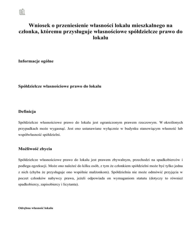 Wniosek o przeniesienie własności lokalu mieszkalnego na członka, któremu przysługuje własnościowe spółdzielcze prawo do lokalu Informacje ogólne Spółdzielcze własnościowe prawo do lokalu Definicja Spółdzielcze własnościowe prawo do lokalu jest ograniczonym prawem rzeczowym. W określonych przypadkach może wygasnąć. Jest ono ustanawiane wyłącznie w budynku stanowiącym własność lub współwłasność spółdzielni. Możliwość zbycia Spółdzielcze własnościowe prawo do lokalu jest prawem zbywalnym, przechodzi na spadkobierców i podlega egzekucji. Może ono należeć do kilku osób, z tym że członkiem spółdzielni może być tylko jedna z nich (chyba że przysługuje ono wspólnie małżonkom). Spółdzielnia nie może odmówić przyjęcia w poczet członków nabywcy prawa, jeżeli odpowiada on wymaganiom statutu (dotyczy to również spadkobiercy, zapisobiercy i licytanta). Odrębna własność lokalu Definicja Odrębna własność lokalu jest nieograniczonym prawem rzeczowym i wiąże się z prawem do gruntu. Właścicielowi lokalu stanowiącego odrębną własność przysługuje odpowiedni do powierzchni lokalu udział w nieruchomości gruntowej i we wspólnych częściach budynku. Prawo to nie wygasa. Jest ono prawem zbywalnym, przechodzi na spadkobierców i podlega egzekucji. Może być ono ustanawiane w budynkach stanowiących zarówno własność osób fizycznych i osób prawnych (np. spółki z o.o.), jak i samorządów (np. gmin), Skarbu Państwa, a także spółdzielni. Zasady przekształcenia Na pisemne żądanie zainteresowanych (członka lub osoby, która nie jest członkiem spółdzielni), którym przysługuje spółdzielcze własnościowe prawo do lokalu, spółdzielnia mieszkaniowa jest obowiązana zawrzeć umowę przeniesienia własności lokalu. Aby jednak do tego doszło, wnioskujący musi dokonać rozliczeń finansowych ze spółdzielnią. Jakie formalności Krok pierwszy Złóż w spółdzielni wniosek o przeniesienie własności lokalu. Krok drugi Spłać przypadającą na dany lokal części zobowiązań spółdzielni związanych z budową w tym w szczególności odpowiedniej części zadłużenia kredytowego spółdzielni wraz z odsetkami. Krok trzeci Spłać – jeśli posiadasz takowe – zadłużenie z tytułu opłat (chodzi o wydatki związane z eksploatacją i utrzymaniem nieruchomości w częściach przypadających na poszczególne lokale oraz eksploatację i utrzymanie nieruchomości stanowiących mienie spółdzielni). . Krok czwarty Pokryj koszty zawarcia umowy oraz koszty założenia księgi wieczystej dla lokalu i wpisu do księgi wieczystej. Forma umowy Ustanowienie odrębnej własności lokalu następuje – pod rygorem nieważności – w formie aktu notarialnego. Opłaty notarialne Wynagrodzenie notariusza za ogół czynności notarialnych dokonanych przy zawieraniu umowy, oraz koszty sądowe w postępowaniu wieczystoksięgowym obciążają osobę, na rzecz których spółdzielnia dokonuje przeniesienia własności lokalu. Wynagrodzenie notariusza za ogół czynności notarialnych dokonanych przy zawieraniu umowy wynosi 1/4 minimalnego wynagrodzenia za pracę, o którym mowa w ustawie z dnia 10 października 2002 r. o minimalnym wynagrodzeniu za pracę (od 1 stycznia 2009 jest to kwota 1276 zł, wynagrodzenie notariusza nie może więc przekroczyć 319 zł). Procedury Termin rozpatrzenia wniosku Spółdzielnia mieszkaniowa zawiera umowę w terminie 3 miesięcy od dnia złożenia wniosku przez osobę uprawnioną, chyba że: nieruchomość posiada nieuregulowany stan prawny w rozumieniu art. 113 ust. 6 ustawy z dnia 21 sierpnia 1997 r. o gospodarce nieruchomościami czyli dla której ze względu na brak księgi wieczystej, zbioru dokumentów albo innych dokumentów nie można ustalić osób, którym przysługują do niej prawa rzeczowe, spółdzielni nie przysługuje prawo własności lub użytkowania wieczystego gruntu, na którym wybudowała budynek lub wybudowali go jej poprzednicy prawni. Zasady oznaczania lokali Określenie przedmiotu odrębnej własności lokali w danej nieruchomości następuje na podstawie uchwały zarządu spółdzielni sporządzonej w formie pisemnej pod rygorem nieważności. Uchwała to powinna określać: 1) oznaczenie nieruchomości obejmującej budynek wraz z gruntem przynależnym do tego budynku, jako podstawową nieruchomość ewidencyjną, w którym ustanawia się odrębną własność lokali; nieruchomość wielobudynkowa może być utworzona tylko wtedy, gdy budynki są posadowione w sposób uniemożliwiający ich rozdzielenie, lub działka, na której posadowiony jest budynek pozbawiona jest dostępu do drogi publicznej lub wewnętrznej; 2) rodzaj, położenie i powierzchnię lokali oraz pomieszczeń przynależnych, w tym piwnic lub pomieszczeń gospodarczych, o ile piwnica lub pomieszczenie gospodarcze jest w tym budynku przyporządkowane danemu lokalowi a władający lokalem faktycznie piwnicę lub pomieszczenie gospodarcze użytkuje; 3) wielkość udziałów we współwłasności nieruchomości wspólnej związanych z odrębną własnością każdego lokalu, 4) oznaczenie osób, którym zgodnie z przepisami ustawy przysługuje prawo żądania przeniesienia na nich własności poszczególnych lokali, 5) przypadający na każdy lokal stan zadłużenia z tytułu: a) kredytu wraz ze skapitalizowanymi odsetkami, b) dokonanego na podstawie odrębnych przepisów przejściowego wykupienia ze środków budżetu państwa odsetek wraz z oprocentowaniem tych odsetek, Uchwała wchodzi w życie z dniem jej podjęcia, chyba że zostanie zaskarżona do sądu. Od dnia wejścia w życie stanowi ona podstawę oznaczania lokali i przypadających na każdy lokal udziałów w nieruchomości wspólnej przy zawieraniu umów o ustanowieniu odrębnej własności lokali na rzecz członków spółdzielni, osób niebędących członkami spółdzielni, którym przysługuje spółdzielcze własnościowe prawo