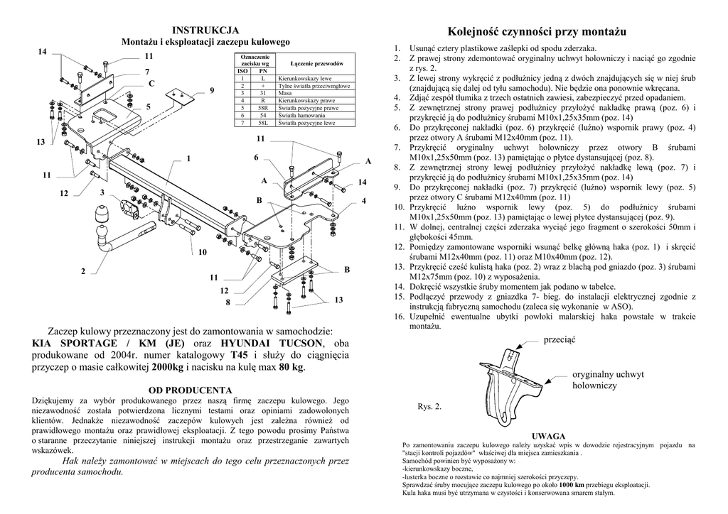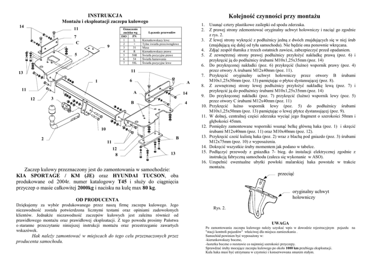 INSTRUKCJA Kolejność czynności przy montaŜu MontaŜu i eksploatacji zaczepu kulowego 14 11 7 C Oznaczenie zacisku wg ISO PN 1 L 2 + 3 31 4 R 5 58R 6 54 7 58L 9 5 1. 2. Łączenie przewodów 3. Kierunkowskazy lewe Tylne światła przeciwmgłowe Masa Kierunkowskazy prawe Światła pozycyjne prawe Światła hamowania Światła pozycyjne lewe 4. 5. 6. 11 13 7. 6 1 11 A A 3 12 14 B 4 8. 9. 10. 11. 12. 10 2 B 13. 11 12 8 13 14. 15. 16. Zaczep kulowy przeznaczony jest do zamontowania w samochodzie: KIA SPORTAGE / KM (JE) oraz HYUNDAI TUCSON, oba produkowane od 2004r. numer katalogowy T45 i słuŜy do ciągnięcia przyczep o masie całkowitej 2000kg i nacisku na kulę max 80 kg. Usunąć cztery plastikowe zaślepki od spodu zderzaka. Z prawej strony zdemontować oryginalny uchwyt holowniczy i naciąć go zgodnie z rys. 2. Z lewej strony wykręcić z podłuŜnicy jedną z dwóch znajdujących się w niej śrub (znajdującą się dalej od tyłu samochodu). Nie będzie ona ponownie wkręcana. Zdjąć zespół tłumika z trzech ostatnich zawiesi, zabezpieczyć przed opadaniem. Z zewnętrznej strony prawej podłuŜnicy przyłoŜyć nakładkę prawą (poz. 6) i przykręcić ją do podłuŜnicy śrubami M10x1,25x35mm (poz. 14) Do przykręconej nakładki (poz. 6) przykręcić (luźno) wspornik prawy (poz. 4) przez otwory A śrubami M12x40mm (poz. 11). Przykręcić oryginalny uchwyt holowniczy przez otwory B śrubami M10x1,25x50mm (poz. 13) pamiętając o płytce dystansującej (poz. 8). Z zewnętrznej strony lewej podłuŜnicy przyłoŜyć nakładkę lewą (poz. 7) i przykręcić ją do podłuŜnicy śrubami M10x1,25x35mm (poz. 14) Do przykręconej nakładki (poz. 7) przykręcić (luźno) wspornik lewy (poz. 5) przez otwory C śrubami M12x40mm (poz. 11) Przykręcić luźno wspornik lewy (poz. 5) do podłuŜnicy śrubami M10x1,25x50mm (poz. 13) pamiętając o lewej płytce dystansującej (poz. 9). W dolnej, centralnej części zderzaka wyciąć jego fragment o szerokości 50mm i głębokości 45mm. Pomiędzy zamontowane wsporniki wsunąć belkę główną haka (poz. 1) i skręcić śrubami M12x40mm (poz. 11) oraz M10x40mm (poz. 12). Przykręcić cześć kulistą haka (poz. 2) wraz z blachą pod gniazdo (poz. 3) śrubami M12x75mm (poz. 10) z wyposaŜenia. Dokręcić wszystkie śruby momentem jak podano w tabelce. Podłączyć przewody z gniazdka 7- bieg. do instalacji elektrycznej zgodnie z instrukcją fabryczną samochodu (zaleca się wykonanie w ASO). Uzupełnić ewentualne ubytki powłoki malarskiej haka powstałe w trakcie montaŜu. przeciąć oryginalny uchwyt holowniczy OD PRODUCENTA Dziękujemy za wybór produkowanego przez naszą firmę zaczepu kulowego. Jego niezawodność została potwierdzona licznymi testami oraz opiniami zadowolonych klientów. JednakŜe niezawodność zaczepów kulowych jest zaleŜna równieŜ od prawidłowego montaŜu oraz prawidłowej eksploatacji. Z tego powodu prosimy Państwa o staranne przeczytanie niniejszej instrukcji montaŜu oraz przestrzeganie zawartych wskazówek. Hak naleŜy zamontować w miejscach do tego celu przeznaczonych przez producenta samochodu. Rys. 2. UWAGA Po zamontowaniu zaczepu kulowego naleŜy uzyskać wpis w dowodzie rejestracyjnym pojazdu na "stacji kontroli pojazdów" właściwej dla miejsca zamieszkania . Samochód powinien być wyposaŜony w: -kierunkowskazy boczne, -lusterka boczne o rozstawie co najmniej szerokości przyczepy. Sprawdzać śruby mocujące zaczepu kulowego po około 1000 km przebiegu eksploatacji. Kula haka musi być utrzymana w czystości i konserwowana smarem stałym. PPUH AUTO-HAK S.J. WyposaŜenie haka: Produkcja Haków Holowniczych Henryk & Zbigniew Nejman 76-200 SŁUPSK ul. Słoneczna 16K tel/fax (059) 8-414-414; 8-414-413 E-mail: [email protected] www. autohak.com.pl Zaczep kulowy bez wyposaŜenia elektrycznego Klasa: A50-X Nr kat. T45 Przeznaczony do zamontowania w samochodzie: KIA SPORTAGE / KM (JE) oraz HYUNDAI TUCSON Dane techniczne: Wartość siły D: 10,3 kN maksymalna masa przyczepy: 2000 kg maksymalny nacisk na kulę: 80 kg produkowanych od 2004r. Numer homologacji zgodnie z dyrektywą 94/20/WE: e20*94/20*0215*00 Zalecany moment skręcający dla śrub i nakrętek 8,8 : M8 M12 25 Nm 85 Nm M10 M14 55 Nm 135 Nm KARTA GWARANCYJNA Producent udziela gwarancji niniejszą kartą gwarancyjną na okres 24 miesięcy licząc od dnia zakupu zaczepu kulowego do samochodu: KIA SPORTAGE / KM (JE) oraz HYUNDAI TUCSON produkowanych od 2004r. Data produkcji .............................. Data zakupu................................... Zakres gwarancji obejmuje wyłącznie wady jakościowe wynikające z winy producenta. Gwarancja nie obejmuje natomiast uszkodzeń zawinionych przez nabywcę, wynikających z niewłaściwego montaŜu, uŜytkowania lub konserwacji, uszkodzeń mechanicznych, normalnego zuŜycia podczas eksploatacji itp. Gwarancja udzielona na zakupiony towar nie wyłącza, nie ogranicza ani nie zawiesza uprawnień kupującego wynikających z niezgodności towaru z umową. Reklamacje naleŜy zgłaszać w punkcie sprzedaŜy, składając jednocześnie kartę gwarancyjną. Usunięcie "wady" następuje po stwierdzeniu przez punkt sprzedaŜy wspólnie z producentem słuszności złoŜonej reklamacji. Reklamacja powinna być załatwiona w ciągu 14 dni od dnia uznania reklamacji. Karta gwarancyjna jest niewaŜna jeŜeli nie jest wypełniona i podpisana. Data zgłoszenia reklamacji: ................................................................... INFORMACJA WSTĘPNA Zaczep kulowy jest skonstruowany zgodnie z zasadami bezpieczeństwa ruchu drogowego. Zaczep kulowy jest elementem wpływającym na bezpieczeństwo jazdy i moŜe zostać zainstalowany wyłącznie przez personel wyspecjalizowany. Niedopuszczalne jest dokonywanie jakichkolwiek zmian w konstrukcji haka. Powoduje to wygaśniecie dopuszczenia do stosowania. W przypadku obecności masy izolacyjnej lub osłony podwozia w miejscu przylegania haka, naleŜy ją usunąć.