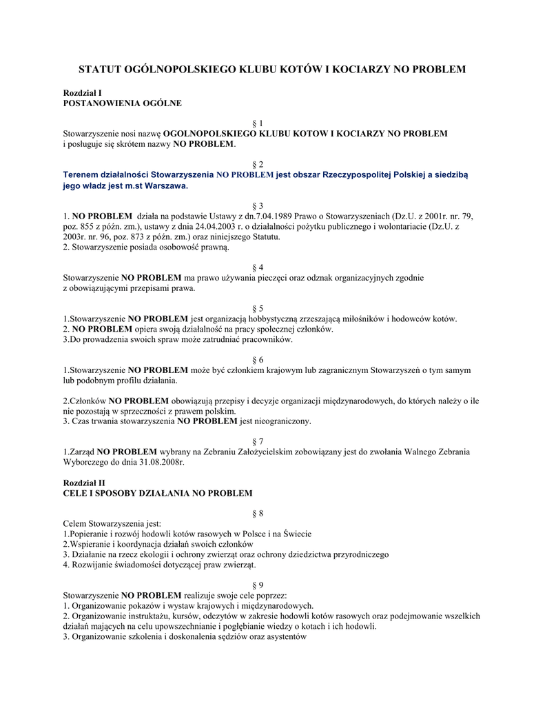 STATUT OGÓLNOPOLSKIEGO KLUBU KOTÓW I KOCIARZY NO PROBLEM Rozdział I POSTANOWIENIA OGÓLNE §1 Stowarzyszenie nosi nazwę OGOLNOPOLSKIEGO KLUBU KOTOW I KOCIARZY NO PROBLEM i posługuje się skrótem nazwy NO PROBLEM. §2 Terenem działalności Stowarzyszenia NO PROBLEM jest obszar Rzeczypospolitej Polskiej a siedzibą jego władz jest m.st Warszawa. §3 1. NO PROBLEM działa na podstawie Ustawy z dn.7.04.1989 Prawo o Stowarzyszeniach (Dz.U. z 2001r. nr. 79, poz. 855 z późn. zm.), ustawy z dnia 24.04.2003 r. o działalności pożytku publicznego i wolontariacie (Dz.U. z 2003r. nr. 96, poz. 873 z późn. zm.) oraz niniejszego Statutu. 2. Stowarzyszenie posiada osobowość prawną. §4 Stowarzyszenie NO PROBLEM ma prawo używania pieczęci oraz odznak organizacyjnych zgodnie z obowiązującymi przepisami prawa. §5 1.Stowarzyszenie NO PROBLEM jest organizacją hobbystyczną zrzeszającą miłośników i hodowców kotów. 2. NO PROBLEM opiera swoją działalność na pracy społecznej członków. 3.Do prowadzenia swoich spraw może zatrudniać pracowników. §6 1.Stowarzyszenie NO PROBLEM może być członkiem krajowym lub zagranicznym Stowarzyszeń o tym samym lub podobnym profilu działania. 2.Członków NO PROBLEM obowiązują przepisy i decyzje organizacji międzynarodowych, do których należy o ile nie pozostają w sprzeczności z prawem polskim. 3. Czas trwania stowarzyszenia NO PROBLEM jest nieograniczony. §7 1.Zarząd NO PROBLEM wybrany na Zebraniu Założycielskim zobowiązany jest do zwołania Walnego Zebrania Wyborczego do dnia 31.08.2008r. Rozdział II CELE I SPOSOBY DZIAŁANIA NO PROBLEM §8 Celem Stowarzyszenia jest: 1.Popieranie i rozwój hodowli kotów rasowych w Polsce i na Świecie 2.Wspieranie i koordynacja działań swoich członków 3. Działanie na rzecz ekologii i ochrony zwierząt oraz ochrony dziedzictwa przyrodniczego 4. Rozwijanie świadomości dotyczącej praw zwierząt. §9 Stowarzyszenie NO PROBLEM realizuje swoje cele poprzez: 1. Organizowanie pokazów i wystaw krajowych i międzynarodowych. 2. Organizowanie instruktażu, kursów, odczytów w zakresie hodowli kotów rasowych oraz podejmowanie wszelkich działań mających na celu upowszechnianie i pogłębianie wiedzy o kotach i ich hodowli. 3. Organizowanie szkolenia i doskonalenia sędziów oraz asystentów 4. Współpracę z instytucjami naukowo-badawczymi w zakresie hodowli w kraju i zagranicą. 5. Współdziałanie z innymi, pokrewnymi organizacjami za granicą. 6. Reprezentowanie interesów członków Stowarzyszenia przed władzami administracyjnymi, organizacjami społecznymi oraz jednostkami gospodarczymi RP. 7. Czuwanie nad przestrzeganiem etyki hodowlanej i członkowskiej. Rozdział III CZŁONKOWIE STOWARZYSZENIA, ICH PRAWA I OBOWIĄZKI § 10 Członkowie Stowarzyszenia dzielą się na: 1. Zwyczajnych. 2. Honorowych. 3. Wspierających. § 11 1. Członkiem zwyczajnym Stowarzyszenia NO PROBLEM może być: a. obywatel RP posiadający pełną zdolność do czynności prawnych i nie pozbawiony praw publicznych; b. małoletni za zgodą przedstawicieli ustawowych, na zasadach określonych w ustawie Prawo o Stowarzyszeniach; c. cudzoziemiec zgodnie z przepisami obowiązującymi obywateli polskich; 2. Członków zwyczajnych przyjmuje w drodze uchwały Zarząd na podstawie pisemnej deklaracji. 3. Od decyzji Zarządu przysługuje prawo odwołania się w terminie 1 miesiąca, które rozpatrzone będzie na najbliższym Walnym Zebraniu. § 12 1. Członkiem honorowym może zostać osoba fizyczna szczególnie zasłużona dla NO PROBLEM. 2.Godność członka honorowego przyznaje WALNE ZEBRANIE. § 13 1.Członkiem wspierającym może zostać osoba fizyczna lub prawna, która zadeklarowała merytoryczne, rzeczowe lub finansowe wsparcie dla stowarzyszenia. 2. Członków wspierających przyjmuje Zarząd Główny Stowarzyszenia na podstawie pisemnej deklaracji, w której winna być wskazana forma wsparcia. 3. Od decyzji Zarządu przysługuje prawo odwołania w terminie 1 miesiąca, które rozpatrzone będzie na najbliższym Walnym Zebraniu. . § 14 Członkowie zwyczajni Stowarzyszenia mają: 1. Czynne i bierne prawo wyborcze do władz Stowarzyszenia NO PROBLEM. 2. Prawo wysuwania postulatów i wniosków do władz Stowarzyszenia NO PROBLEM. 3. Prawo do uczestnictwa w szkoleniach, kursach i we wszystkich imprezach oraz wystawach Stowarzyszenia NO PROBLEM. § 15 1. Członkowie honorowi i wspierający, działający poprzez swoich przedstawicieli, mają prawo do uczestnictwa we wszystkich imprezach organizowanych przez NO PROBLEM bez uiszczania opłat. § 16 Członkowie zwyczajni NO PROBLEM są zobowiązani do: 1. Przestrzegania postanowień statutu i regulaminów oraz uchwał organów NO PROBLEM. 2. Uczestniczenia w pracach NO PROBLEM. 3. Regularnego opłacania składek członkowskich. 4. Stania na straży dobrego imienia NO PROBLEM. § 17 Członkowie honorowi i wspierający są zobowiązani do: 1. Przestrzegania postanowień statutu i regulaminów oraz uchwał organów NO PROBLEM. 2. Uczestniczenia w pracach NO PROBLEM. 3. Stania na straży dobrego imienia NO PROBLEM. § 18 Członek będący pracownikiem NO PROBLEM nie może pełnić jednocześnie funkcji we władzach stowarzyszenia. § 19 1. Członkostwo w NO PROBLEM ustaje na skutek: a. dobrowolnej rezygnacji zgłoszonej na piśmie do Zarządu. b. śmierci członka lub utraty osobowości prawnej przez członka wspierającego. c. Skreślenia z listy członków po uprzednim zawiadomieniu z powodu zalegania z opłatą dwu kolejnych, kwartalnych składek członkowskich. d. wykluczenia w wyniku prawomocnego orzeczenia Sądu powszechnego, orzekającego karę dodatkową w postaci pozbawienia praw publicznych. e. pozbawienie członkowstwa w wyniku uchwały Walnego Zebrania w związku z nieprzestrzeganiem postanowień Statutu oraz uchwał organów NO PROBLEM. 2. Zarząd zobowiązany jest zawiadomić członka o skreśleniu lub wykluczeniu, podając przyczyny skreślenia lub wykl