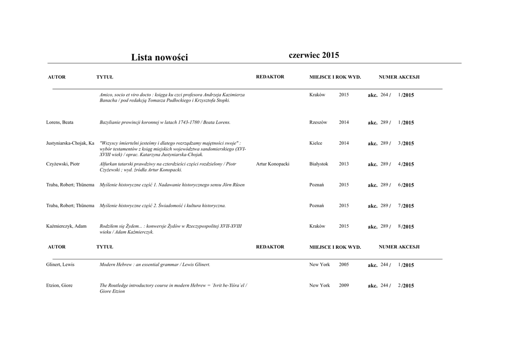 czerwiec 2015 Lista nowości AUTOR TYTUŁ REDAKTOR MIEJSCE I ROK WYD. NUMER AKCESJI Amico, socio et viro docto : księga ku czci profesora Andrzeja Kazimierza Banacha / pod redakcją Tomasza Pudłockiego i Krzysztofa Stopki. Kraków 2015 akc. 264 / 1 /2015 Lorens, Beata Bazylianie prowincji koronnej w latach 1743-1780 / Beata Lorens. Rzeszów 2014 akc. 289 / 1 /2015 Justyniarska-Chojak, Ka "Wszyscy śmiertelni jesteśmy i dlatego rozrządzamy majętności swoje" : wybór testamentów z ksiąg miejskich województwa sandomierskiego (XVIXVIII wiek) / oprac. Katarzyna Justyniarska-Chojak. Kielce 2014 akc. 289 / 3 /2015 Czyżewski, Piotr Alfurkan tatarski prawdziwy na czterdzieści części rozdzielony / Piotr Czyżewski ; wyd. źródła Artur Konopacki. Białystok 2013 akc. 289 / 4 /2015 Traba, Robert; Thünema Myślenie historyczne część 1. Nadawanie historycznego sensu Jörn Rüsen Poznań 2015 akc. 289 / 6 /2015 Traba, Robert; Thünema Myślenie historyczne część 2. Świadomość i kultura historyczna. Poznań 2015 akc. 289 / 7 /2015 Kaźmierczyk, Adam Rodziłem się Żydem... : konwersje Żydów w Rzeczypospolitej XVII-XVIII wieku / Adam Kaźmierczyk. Kraków 2015 akc. 289 / 8 /2015 AUTOR TYTUŁ Artur Konopacki REDAKTOR MIEJSCE I ROK WYD. NUMER AKCESJI Glinert, Lewis Modern Hebrew : an essential grammar / Lewis Glinert. New York 2005 akc. 244 / 1 /2015 Etzion, Giore The Routledge introductory course in modern Hebrew = ʿIvrit be-Yiśraʾel / Giore Etzion New York 2009 akc. 244 / 2 /2015 AUTOR TYTUŁ REDAKTOR MIEJSCE I ROK WYD. NUMER AKCESJI Ringvald , Vardit Brandeis modern Hebrew = ʿIvrit be-heḳsher / Vardit Ringvald Waltham 2005 akc. 244 / 3 /2015 Williams, Ronald J. Williams' Hebrew syntax / Ronald J. Toronto 2007 akc. 244 / 4 /2015 Ringvald, Vardit Brandeis modern Hebrew : intermediate to advanced. Pilot edition Waltham 2013 akc. 244 / 5 /2015 Goliński, Mateusz Przy wrocławskim Rynku : rekonstrukcja dziejów własności posesji. Cz. 2, 1421-1500 / Mateusz Goliński ; Instytut Historyczny Uniwersytetu Wrocławskiego. Wrocław 2015 akc. 245 / 1 /2015 Matwijowski, Krystyn Studia i szkice z dziejów protestantyzmu na Śląsku. Od ukształtowania się wyznania do działalności pietystów. Wrocław 2015 akc. 245 / 2 /2015 Lietuvių mokslo draugijos paveldas Lietuvos mokslų akademijos Vrublevskių bibliotekoje. Bibliografijos rodyklė. Vilnius 2014 akc. 246 / 2 /2015 Bereszyński, Zbigniew NSZZ "Solidarność" i rewolucja solidarnościowa na Śląsku Opolskim 1980-1990. Tom I. Geneza, narodziny i rozwój ruchu ; Instytut Pamięci Narodowej. Komisja Ścigania Zbrodni przeciwko Narodowi Polskiemu. Opole 2014 akc. 247 / 1 /2015 Bereszyński, Zbigniew NSZZ "Solidarność" i rewolucja solidarnościowa na Śląsku Opolskim 1980-1990. Tom II. Od stanu wojennego do zmian ustrojowych w kraju ; Instytut Pamięci Narodowej. Komisja Ścigania Zbrodni przeciwko Opole 2014 akc. 247 / 2 /2015 Wysocki, Roman W kręgu integralnego nacjonalizmu : "czynny nacjonalizm" Dmytra Doncowa na tle "myśli nowoczesnych" Romana Dmowskiego : studium porównawcze / \c Roman Wysocki. Lublin 2014 akc. 249 / 1 /2015 Sypień, Jacek Olkusz i Ziemia Olkuska podczas I wojny światowej w pamiętnikach Jana Jarno / Jacek Sypień. Olkusz 2014 akc. 249 / 3 /2015 Kowalczyk, Andrzej Sta Wena do polityki : o Giedroyciu i Mieroszewskim. T. 1 / Andrzej Stanisław Kowalczyk. Warszawa 2014 akc. 249 / 4 /2015 Marciniak, Wojciech Fr Powroty z Sybiru : repatriacja obywateli polskich z głębi ZSRR w latach 1945-1947 / Wojciech Franciszek Marciniak. Łódź 2014 akc. 249 / 5 /2015 Leszek Ziątkowski, AUTOR TYTUŁ REDAKTOR MIEJSCE I ROK WYD. NUMER AKCESJI Hull, Eugeniusz Państwowość podziemna w narracjach cichociemnych : wspomninia wojenne z lat 1939-1945 Henryka Krajewskiego / Eugeniusz Hull. Toruń 2014 akc. 249 / 6 /2015 Brygidyn, Andrzej; Bry Wspomnienia i relacje żołnierzy Sanockiego Obwodu Związku Walki Zbrojnej - Armii Krajowej 1939-1944 / Andrzej Brygidyn, Magdalena Brygidyn-Paszkiewicz. Sanok 2014 akc. 249 / 7 /2015 Majorossy, Judit; Szend Żołnierze z Pomorza Zachodniego w rejonie Zatoki Perskiej / [red.] Grzegorz Ciechanowski. Grzegorz Ciechanowski Szczecin 2014 akc. 249 / 8 /2015 Das Preßburger Protocollum testamentorum 1410 (1427) - 1529 / hrsg. von Judit Majorossy und Katalin Szende Katlin Szende Wien 2014 akc. 250 / 2 /2015 Dawna Rosja i Rosjanie we współczesnych badaniach polskich / red. nauk. Jan Tyszkiewicz, Krzysztof Łukawski ; Akademia Humanistyczna im. A. Gieysztora, Akademickie Towarzystwo Edukacyjno-Naukowe. Jan Tyszkiewicz, Krzysztof Łukawski Pułtusk 2012 akc. 252 / 1 /2015 Dawne pieczęcie : typologia - metody badań - interpretacje / pod redakcją Zenona Piecha ; Polskie Towarzystwo Heraldyczne. Zenon Piecha Warszawa 2015 akc. 252 / 2 /2015 Deportowani do ZSRS : relacje ofiar Gułagu / pod redakcją Alaina Bluma, Marty Craveri, Valérie Nivelon ; przełożyła Elżbieta Brzozowska. Alain Blum Warszawa 2015 akc. 252 / 3 /2015 Błaszczyk, Grzegorz Herbarz szlachty żmudzkiej. T. 1 / Grzegorz Błaszczyk ; Polskie Towarzystwo Historyczne. Warszawa 2015 akc. 252 / 4 /2015 Błaszczyk, Grzegorz Herbarz szlachty żmudzkiej. T. 3 / Grzegorz Błaszczyk ; Polskie Towarzystwo Historyczne. Warszawa 2015 akc. 252 / 5 /2015 Lublin 2014 akc. 252 / 6 /2015 Intelektualne wizje i rewizje w dziejach stosunków polsko-niemieckich XVIII-XXI wieku / Andreas Lawaty ; [przekład Jacek Dąbrowski, Justyna Górny, Janusz Kawecki, Katarzyna Leszczyńska, Jeremi Sadowski, Marek Kraków 2015 akc. 252 / 7 /2015 Kościoły i klasztory rzymskokatolickie dawnego województwa brzeskolitewskiego. T. 1 / red. tomu Marcin Zgliński ; oprac. Katarzyna Kolendo-Korczak [et al.] ; Międzynarodowe Centrum Kultury w Krakowie. Kraków 2013 akc. 252 / 8 /2015 Historia mówiona w świetle nauk humanistycznych i społecznych / red. Stanisława Niebrzegowska-Bartmińska, Joanna Szadura, Mirosław Szumiło ; przy udziale Janusza Kłapcia. L