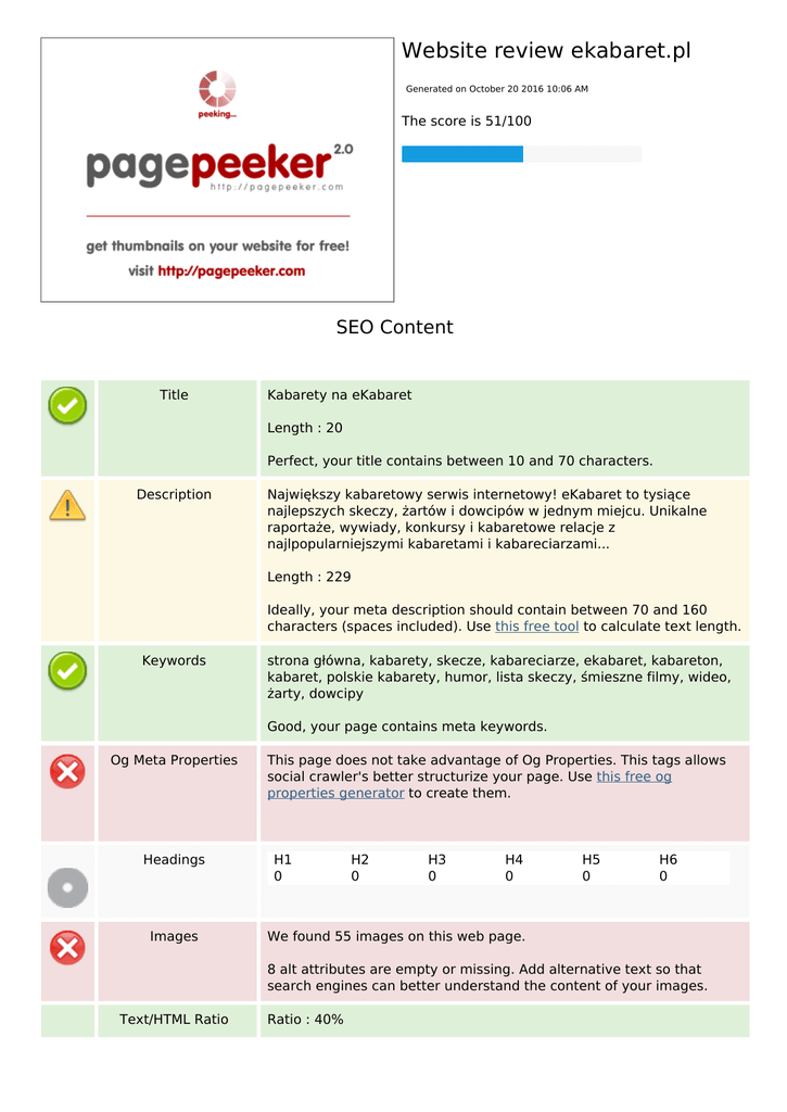 Website review ekabaret.pl Generated on October 20 2016 10:06 AM The score is 51/100 SEO Content Title Kabarety na eKabaret Length : 20 Perfect, your title contains between 10 and 70 characters. Description Największy kabaretowy serwis internetowy! eKabaret to tysiące najlepszych skeczy, żartów i dowcipów w jednym miejcu. Unikalne raportaże, wywiady, konkursy i kabaretowe relacje z najlpopularniejszymi kabaretami i kabareciarzami... Length : 229 Ideally, your meta description should contain between 70 and 160 characters (spaces included). Use this free tool to calculate text length. Keywords strona główna, kabarety, skecze, kabareciarze, ekabaret, kabareton, kabaret, polskie kabarety, humor, lista skeczy, śmieszne filmy, wideo, żarty, dowcipy Good, your page contains meta keywords. Og Meta Properties Headings Images This page does not take advantage of Og Properties. This tags allows social crawler's better structurize your page. Use this free og properties generator to create them. H1 0 H2 0 H3 0 H4 0 H5 0 H6 0 We found 55 images on this web page. 8 alt attributes are empty or missing. Add alternative text so that search engines can better understand the content of your images. Text/HTML Ratio Ratio : 40% SEO Content Ideal! This page's ratio of text to HTML code is between 25 and 70 percent. Flash Iframe Perfect, no Flash content has been detected on this page. Great, there are no Iframes detected on this page. SEO Links URL Rewrite Good. Your links looks friendly! Underscores in the URLs Perfect! No underscores detected in your URLs. In-page links We found a total of 29 links including 0 link(s) to files Statistics External Links : noFollow 0% External Links : Passing Juice 0% Internal Links 100% In-page links Anchor Type Juice Podaj Pagaj 2016 » Internal Passing Juice Gala Stand-up Comedy w Londynie » Internal Passing Juice Wielka Trasa Stand-up Polska - Maciek Adamczyk » Internal Passing Juice Roast Karola Paciorka - Człowiek Warga » Internal Passing Juice Wielki Roast Krzysztofa Skiby - Skiba (odc. 7) » Internal Passing Juice Wielki Roast Krzysztofa Skiby - Olka Szczęśniak (odc. 6) » Internal Passing Juice Kabaret Moralnego Niepokoju - Odrabianie lekcji » Internal Passing Juice In-page links Piotr Guma Gumulec (kabaret Chyba) - parodia Górala » Internal Passing Juice Narwani Talk Show & Abelard Giza - 2 rundy » Internal Passing Juice Jacek Noch i jego ogromny dystans do swojej choroby - tylko dla dorosłych » Internal Passing Juice 4 Najbogatszych polskich aktorów? 7 SECONDS CHALLENGE Cezary Pazura » Internal Passing Juice Kabaret Młodych Panów i Smile – Terapia -18 Mazurska Noc Kabaretowa Mrągowo 2016 » Internal Passing Juice Kabaret Chyba - Prawo jazdy - 22 Festiwal Kabaretu Koszalin 2016 » Internal Passing Juice Stand Up u Kuby Wojewódzkiego - dlaczego marihuana powinna być nielegalna - Michał Leja » Internal Passing Juice Smile – Ślub internetowy- 18 Mazurska Noc Kabaretowa Mrągowo 2016 » Internal Passing Juice Stand Up u Kuby Wojewódzkiego: Czy warto być modelką w Dubaju? Rafał Banaś » Internal Passing Juice Kabaret Chyba - Organista - 18. Mazurska Noc Kabaretowa Mrągowo 2016 » Internal Passing Juice RAFAŁ PACZEŚ - "Warszawska korporacja" | 20 Stand-Upów » Internal Passing Juice Stand Up u Kuby Wojewódzkiego - Adam Bendler » Internal Passing Juice Kabaret Młodych Panów – Koty – XVIII Mazurska Noc Kabaretowa » Internal Passing Juice Łowcy.B i BudaPesz - Le Kawe - XVIII Mazurska Noc Kabaretowa » Internal Passing Juice Stand-up u Kuby Wojewódzkiego - Patryk Czebańczuk » Internal Passing Juice Cezary Pazura wkręca YouTuberów - kto zagra w 13 Posterunku? » Internal Passing Juice XVIII Mazurska Noc Kabaretowa na antenie TVP2 » Internal Passing Juice Stand-up u Kuby Wojewódzkiego - Rafał Pacześ » Internal Passing Juice KABAryjTON w Rybniku » Internal Passing Juice Wielki Roast Krzysztofa Skiby - Karol Modzelewski (odc. 5) » Internal Passing Juice ŁUKASZ LOTEK LODKOWSKI - Pośpiech | 20 Stand-Upów » Internal Passing Juice In-page links RAFAŁ RUTKOWSKI - Moje pasje | 20 Stand-Upów » Internal Passing Juice SEO Keywords Keywords Cloud się kolejny rafał mazurska kuby kabaret noc wojewódzkiego kabaretowa roast Keywords Consistency Keyword Content kabaret 10 mazurska 7 noc 7 kabaretowa 7 rafał 7 Title Keywords Description Usability Url Domain : ekabaret.pl Length : 11 Favicon Great, your website has a favicon. Printability We could not find a Print-Friendly CSS. Language Good. Your declared language is pl. Dublin Core This page does not take advantage of Dublin Core. Headings Document Doctype HTML 4.01 Transitional Encoding Perfect. Your declared charset is UTF-8. W3C Validity Errors : 252 Warnings : 45 Email Privacy Great no email address has been found in plain text! Deprecated HTML Deprecated tags Occurrences <center> 31 <u> 3 Deprecated HTML tags are HTML tags that are no longer used. It is recommended that you remove or replace these HTML tags because they are now obsolete. Speed Tips Attention! Try to avoid nested tables in HTML. Too bad, your website is using inline styles. Great, your website has few CSS files. Too bad, your website has too many JS files (more than 6). Too bad, your website does not take advantage of gzip. Mobile Mobile Optimization Apple Icon Meta Viewport Tag Flash content Optimization XML Sitemap Missing Your website does not have an XML sitemap - this can be problematic. A sitemap lists URLs that are available for crawling and can include Optimization additional information like your site's latest updates, frequency of changes and importance of the URLs. This allows search engines to crawl the site more intelligently. Robots.txt http://ekabaret.pl/robots.txt Great, your website has a robots.txt file. Analytics Great, your website has an analytics tool. Google Analytics Powered by TCPDF (www.tcpdf.org)