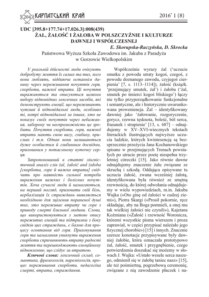 204 КАРПАТСЬКИЙ КРАЙ 2016’ 1 (8) UDC [395.8+177.74+17.026.3]:008(439) ŻAL, ŻAŁOŚĆ I ŻAŁOBA W POLSZCZYŹNIE I KULTURZE DAWNEJ I WSPÓŁCZESNEJ E. Skorupska-Raczyńska, D. Skrocka Państwowa Wyższa Szkoła Zawodowa im. Jakuba z Paradyża w Gorzowie Wielkopolskim У реальній дійсності люди очікують добробуту життя їх самих та тих, кого вони люблять, віддаючи останнім данину через переживання почуттів горя, скорботи, важкої втрати. Ці почуття виражаються та описуються шляхом вибору відповідних лексичних засобів, які демонструють емоції, що переживають чутливі й відповідальні люди, особливо ті, котрі відповідальні за інших, хто не показує своїх почуттів через небажання, заборону чи неспроможність це зробити. Почуття скорботи, горя, важкої втрати мають свою вагу, глибину, присмак і т.п. Однак вони залишаються дуже особистим й глибинним досвідом, прихованим у потаємному куточку серця. Запропонований в статті лінгвістичний аналіз слів żal, żałość and żałoba [скорбота, горе й важка втрата] свідчить про наявність сильної потреби вираження важких і болісних почуттів. Хоча сучасні люди й намагаються, на перший погляд, приховати свій біль, вербалізація їх страждань виявляється необхідною для зцілення пораненої душі тих, хто переживає втрату чи горе з приводу смерті близької людини. Слова, що використовуються з метою опису пережитих емоцій та підтримки з боку свідків цих страждань, є базою для процесу оговтання від горя. Приховування горя та намагання уникнути вираження скорботи спричинюють втрату радості життя та перешкоджають емоційному відновленню, що слідує за втратою. Ключові слова: лексичний склад, семантика, фразеологія, пареміологія, процес переживання скорботи, педагогіка смерті, втрата, страждання. Współcześnie wyrazy żal (‘uczucie smutku z powodu utraty kogoś, czegoś, z powodu doznanego zawodu, czyjegoś cierpienia’ [7, s. 1113–1114]), żałość (książk. ‘przejmujący smutek, żal’) i żałoba (‘żal, smutek po śmierci kogoś bliskiego’) łączy nie tylko przyporządkowanie funkcjonalne i semantyczne, ale i historycznie uwarunkowana proweniencja. Żal – identyfikowany dawniej jako ‘żałowanie, rozgoryczenie, gorycz, rzewna tęsknota, boleść, ból serca, frasunek i strapienie’ [13, s. 687] – odnajdujemy w XV–XVI-wiecznych tekstach literackich ilustrujących najwyższe uczucia ludzkie, których kwintesencją są bezsprzecznie przeżycia Jana Kochanowskiego spisane w przejmujących Trenach powstałych po utracie przez poetę niespełna trzyletniej córeczki [15]. Jako równie dawne odnajdujemy znaczenie żalu związane ze skruchą i szkodą. Oddająca opisywane tu uczucia żałość, zwana wcześniej żałotą, identyfikowana była również ze smętną rzewnością, do której odwołania odnajdujemy w wielu wypowiedziach, m.in. Jakuba Wujka («Oto ginę od żałości w cudzej ziemi»), Piotra Skargi («Prosił pokornie, ręce składając, aby na Boga pomnieli, a onej mu tak wielkiej żałości nie czynili»), Kajetana Koźmiana («Żałość i rzewność Woronicza, któremi wszystkie pisma wierszem i proza zaprawiał, w części przypisać należało jego fizycznej chorobie») [15] i innych. Znacznie szersze konotacje przypisywane były dawniej żałobie, która oznaczała prototypowo żal, żałość, smutek i przygnębienie, czego potwierdzenia doszukać się możemy w słowach J. Wujka: «Ustało wesele serca naszego, odmienił się w żałobę taniec nasz» [15], ale też pośmiertną, pogrzebową ceremonię, związane z nią zawodzenie płaczek i na- ŻAL, ŻAŁOŚĆ I ŻAŁOBA W POLSZCZYŹNIE I KULTURZE DAWNEJ I WSPÓŁCZESNEJ E. Skorupska-Raczyńska, D. Skrocka rzekanie po zmarłym, co objaśnił Grzegorz Knapski słowami: «Żałoba, ceremonia po śmierci przyjaciela abo powinnego» [1, t. II, s. 734]. Z tego zapewne wywodzą się kolejne semy o treści: ‘ubiór żałobny, oznaki żałobne’ («Po ojcu w żałobie chodzi») [1, t. II, s. 734] oraz ‘okres trwania żałoby’, zróżnicowany w naszej kulturze i uzależniony przede wszystkim od pokrewieństwa, statusu zmarłego, ale też indywidualnego podejścia osoby osieroconej, co Zygmunt Gloger w Encyklopedii staropolskiej opisuje następująco: «Po śmierci męża, wdowa powinna była odbyć żałobę, a nie mogła wychodzić za mąż przed upływem 6 miesięcy, inaczej traciła wiano. (...) podług prawa koronnego przepisana była żałoba, ale bez oznaczenia czasu. (...) Im głębiej zapuszczamy się w przeszłość, tem dłuższą i surowszą postrzegamy żałobę po bliskich krewnych lub panujących. Mieczysław I po Dąbrówce chodził w żałobie przez lat 6 (...). Po zgonie Boelsława Chrobrego (...) wszyscy jakby z nakazu dłużej niż rok zachowywali żałobę. (...) Ża