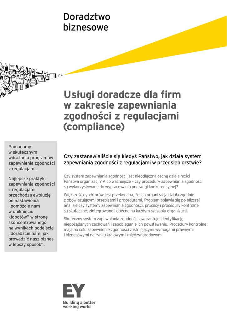 Doradztwo biznesowe Usługi doradcze dla firm w zakresie zapewniania zgodności z regulacjami (compliance) Pomagamy w skutecznym wdrażaniu programów zapewnienia zgodności z regulacjami. Najlepsze praktyki zapewniania zgodności z regulacjami przechodzą ewolucję od nastawienia „pomóżcie nam w uniknięciu kłopotów” w stronę skoncentrowanego na wynikach podejścia „doradźcie nam, jak prowadzić nasz biznes w lepszy sposób”. Czy zastanawialiście się kiedyś Państwo, jak działa system zapewniania zgodności z regulacjami w przedsiębiorstwie? Czy system zapewniania zgodności jest nieodłączną cechą działalności Państwa organizacji? A co ważniejsze – czy procedury zapewniania zgodności są wykorzystywane do wypracowania przewagi konkurencyjnej? Większość dyrektorów jest przekonana, że ich organizacja działa zgodnie z obowiązującymi przepisami i procedurami. Problem pojawia się po bliższej analizie czy systemy zapewniania zgodności, procesy i procedury kontrolne są skuteczne, zintegrowane i obecne na każdym szczeblu organizacji. Skuteczny system zapewniania zgodności gwarantuje identyfikację niepożądanych zachowań i zapobieganie ich powstawaniu. Procedury kontrolne mają na celu zapewnienie zgodności z istniejącymi wymogami prawnymi i biznesowymi na rynku krajowym i międzynarodowym. Dział Doradztwa Biznesowego EY, Zarządzanie Ryzykiem Nadużyć Wykorzystanie funkcji zapewniania zgodności z regulacjami do osiągnięcia przewagi konkurencyjnej Najlepsze praktyki zapewniania zgodności przechodzą ewolucję od nastawienia „pomóżcie nam w uniknięciu kłopotów” w stronę skoncentrowanego na wynikach podejścia „doradźcie nam, jak prowadzić nasz biznes w lepszy sposób”. Pozwalają na zapewnienie stałej zgodności oraz osiągnięcie przewagi konkurencyjnej przedsiębiorstwa poprzez: Zapewniamy naszym klientom wsparcie w zakresie: •• definiowanie „zapewniania zgodności” z uwzględnieniem wymogów prawnych i biznesowych •• oceny systemu i procedur zapewniania zgodności – dokonujemy oceny działania systemu i procedur zapewniania zgodności oraz zarządzania ryzykiem w odniesieniu do wymogów regulacyjnych oraz najlepszych praktyk •• identyfikację istniejących oraz mogących się pojawić ryzyk związanych ze zgodnością •• monitorowanie i ocenę skuteczności działania systemu oraz procedur zapewniania zgodności, a także procedur kontrolnych •• dostosowywanie, koordynowanie i wdrażanie działań w zakresie zapewniania zgodności i zarządzania ryzykiem w przedsiębiorstwie. Podejście praktyczne EY doradza organizacjom pragnącym w sposób aktywny, ale i pragmatyczny podejść do kwestii ryzyka i wymogów w zakresie zapewniania zgodności. System zapewniania zgodności musi być skuteczny i w pełni zintegrowany z celami biznesowymi organizacji. EY pomaga w ocenie, monitorowaniu i usprawnianiu systemu oraz procedur zapewniania zgodności, a także procedur kontrolnych. Dzięki naszemu podejściu oraz doświadczeniu doradzamy naszym klientom jak najlepiej zapewnić zgodność w ramach już istniejących procesów i funkcji biznesowych. Pomagamy również w dokonywaniu systematycznych ocen oraz w usprawnianiu i monitorowaniu procesów zarządzania zmieniającym się ryzykiem zgodności. Ocena ryzyk Ocena zapewnienia zgodności •• oceny ryzyka zgodności – identyfikujemy i pomagamy w ustaleniu hierarchii już istniejących ryzyk oraz pojawiających się nowych. Ponadto wskazujemy relacje pomiędzy poszczególnymi ryzykami zgodności a celami przedsiębiorstwa i jego głównymi procesami biznesowymi •• usprawniania systemu oraz procedur zapewniania zgodności – pomagamy w określeniu i ustaleniu hierarchii działań prowadzących do usprawnienia i lepszego zintegrowania z biznesem systemu zarządzania ryzykiem zgodności oraz procedur kontrolnych •• monitorowania prawidłowości działania systemu oraz procedur zapewniania zgodności, a także procedur kontrolnych. Dlaczego EY? Na całym świecie eksperci EY mają wieloletnie doświadczenie w prowadzeniu prac związanych z zapewnianiem zgodności z regulacjami. Jako założyciel i członek Open Compliance & Ethics Group (OCEG), EY jest liderem w zakresie nadzoru, zarządzania ryzykiem i zapewniania zgodności. EY jest członkiem Komitetu Doradczego i Rady Liderów OCEG. Bierzemy udział w pracach nad wytycznymi OCEG w zakresie zgodności i etyki, a na prośbę OCEG pełnimy również rolę sekretarza szczegółowych wytycznych w zakresie zgodności. Ulepszanie i monitorowanie skuteczności działania systemu oraz procedur zapewniania zgodności, a także systemów kontroli EY | Assurance | Tax | Transactions | Advisory O firmie EY EY jest światowym liderem rynku usług profesjonalnych obejmujących usługi audytorskie, doradztwo podatkowe, doradztwo biznesowe i doradztwo transakcyjne. Nasza wiedza oraz świadczone przez nas najwyższej jakości usługi przyczyniają się do budowy zaufania na rynkach kapitałowych i w gospodarkach całego świata. W szeregach EY rozwijają się utalentowani liderzy zarządzający zgranymi zespołami, których celem jest spełnianie obietnic składanych przez markę EY. W ten sposób przyczyniamy się do budowy sprawniej funkcjonującego świata. Robimy to dla naszych klientów, społeczności, w których żyjemy i dla nas samych. Nazwa EY odnosi się do firm członkowskich Ernst & Young Global Limited, z których każda stanowi osobny podmiot prawny. Ernst & Young Global Limited, brytyjska spółka z odpowiedzialnością ograniczoną do wysokości gwarancji (company limited by guarantee) nie świadczy usług na rzecz klientów. Aby uzyskać więcej informacji, wejdź na www.ey.com/pl EY, Rondo ONZ 1, 00-124 Warszawa © 2013 EYGM Limited. Wszelkie prawa zastrzeżone. SCORE: 003.09.13 Niniejsza publikacja została sporządzona z należytą starannością, jednak z konieczności pewne informacje zosta