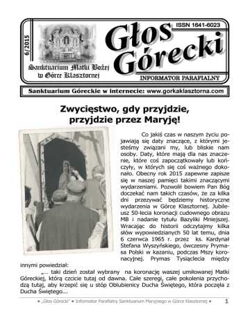 6/2015 Zwycięstwo, gdy przyjdzie, przyjdzie przez Maryję! Co jakiś czas w naszym życiu pojawiają się daty znaczące, z którymi jesteśmy związani my, lub bliskie nam osoby. Daty, które mają dla nas znaczenie, które coś zapoczątkowały lub kończyły, w których się coś ważnego dokonało. Obecny rok 2015 zapewne zapisze się w naszej pamięci takimi znaczącymi wydarzeniami. Pozwolił bowiem Pan Bóg doczekać nam takich czasów, że za kilka dni przezywać będziemy historyczne wydarzenia w Górce Klasztornej. Jubileusz 50-lecia koronacji cudownego obrazu MB i nadanie tytułu Bazyliki Mniejszej. Wracając do historii odczytajmy kilka słów wypowiedzianych 50 lat temu, dnia 6 czerwca 1965 r. przez ks. Kardynał Stefana Wyszyńskiego, ówczesny Prymasa Polski w kazaniu, podczas Mszy koronacyjnej. Prymas Tysiąclecia między innymi powiedział: „… taki dzień został wybrany na koronację waszej umiłowanej Matki Góreckiej, którą czcicie tutaj od dawna. Całe szeregi, całe pokolenia przychodzą tutaj, aby krzepić się u stóp Oblubienicy Ducha Świętego, która poczęła z Ducha Świętego... • „Głos Górecki” • Informator Parafialny Sanktuarium Maryjnego w Górce Klasztornej • 1 Przychodzicie tutaj z wielką nadzieją i wracaliście do waszych domów pocieszeni. Wy, drogie matki, pocieszone obrazem Matki Boga Człowieka. Wy, ojcowie, pokrzepieni w waszym trudzie widokiem Matki, co karmiła świata Zbawiciela. Wychodzicie stąd pełni ufności, że Ona i Wam jak Matka da pożywienie dla waszych dzieci, dla waszych rodzin. Tak liczny udział w tej uroczystości naszej młodzieży i dziatwy wskazuje na to, ze nowe pokolenie naszej Polski Katolickiej, które stoi na progu nowego Tysiąclecia Chrztu Polski przejmie z waszych dłoni, Ojcowie i Matki, tę głęboką cześć ku Matce Najświętszej Góreckiej i poniesie tę cześć, ufność i nadzieję w wiary nowe Tysiąclecie. Najmilsze Dzieci! Uroczystość dzisiejsza jest dla nas wszystkich podniesieniem na duchu. Jest zarazem i wypełnieniem naszych zobowiązań. Wspominam postać poprzednika naszego na tronie Prymasowskim, Kardynała Augusta Hlonda, który umierając w Warszawie przed laty, nam wszystkim Biskupom, kapłanom i całej Stolicy dał otuchy słowami: „Zwycięstwo , gdy przyjdzie, będzie to zwycięstwo Matki Najświętszej”. Moi drodzy, możemy być dumni, że żyjemy tutaj, w cieniu Matki Bożej Góreckiej. Niech to nas wszystkich mobilizuje i angażuje do większej pracy nad sobą dla dobra swoich rodzin i bliskich a także tej nasze wielkiej rodziny parafialnej. Niech Matka Boża Górecka pomaga nam, byśmy i dzisiaj mogli zwyciężać i pokonywać wszystkie swoje słabości. Ks. Kazimierz Świderski MSF Proboszcz Sprzątanie kościoła WIKTORÓWKO – 5 czerwca, godz. 13.00: Białakowska, Łukaszczyk, Adamik i Kapeja. 12 czerwca, godz. 13.00: Łój, Plewa, Januszewski i Smętek. 19 czerwca, godz. 13.00: Pisula, Piątek, Tadeusz Szwedziak i Ireneusz Tomasz 26 czerwca godz. 13.00: Biliński, Brzeziński, Adamik Paweł, Narloch Łukasz Ogłoszenia duszpasterskie 1. W poniedziałek rozpoczynamy miesiąc czerwiec – miesiąc poświęcony czci Najświętszego Serca Pana Jezusa. W naszej świątyni nabożeństwa czerwcowe odprawiane będą codziennie o godz. 18.00 a po nich Msza św. 2. 4 czerwca, I czwartek miesiąca, przypada Uroczystość Najświętszego Ciała i Krwi Chrystusa, czyli tradycyjnie Boże Ciało. Msze św. będą odprawiane w porządku niedzielnym; 6.30, 8.00, 10.00, 12.00 i 18.00. O 10.00 suma wraz z 2 • „Głos Górecki” • Informator Parafialny Sanktuarium Maryjnego w Górce Klasztornej • procesją do czterech ołtarzy przygotowanych tradycyjnie na trasie procesji w Gaju przez mieszkańców poszczególnych wiosek. Do udziału w niej zapraszam poczty sztandarowe, Towarzystwo Św. Wojciecha, chór, ministrantów, marianki, dzieci do sypania kwiatów oraz panów do niesienia baldachimu. 3. Przez cały tydzień po Uroczystości Bożego Ciała trwać będzie oktawa. W tych dniach wieczorem o 18.00 Litania do Serca Pana Jezusa, następnie procesja wokół studzienki i Msza św. Na zakończenie Oktawy, w czwartek 11 czerwca procesja po Gaju i poświęcenie wianków. 4. W I Piątek miesiąca, odwiedziny chorych od godz. 8.00. Przypominamy zwłaszcza dzieciom o praktyce 9-ciu pierwszych piątkach miesiąca. Możliwość przystąpienia do spowiedzi codziennie przed Mszą św. lub przed nabożeństwem. 5. Od 05 do 07 czerwca trwać będą w Górce Rekolekcje dla narzeczonych 6. 06 czerwca, w I sobotę miesiąca przeżywać będziemy dekanalny Dzień Dziecka. Zapraszamy w tym dniu dzieci I-Komunijne z parafii naszego dekanatu na Mszę św. na godz. 11.00. Następnie występ scholi dziecięcej z Łobżenicy i pozostałe atrakcje. Nabożeństwo pierwszosobotnie, wynagradzające zniewagi i grzechy Niepokalanemu Sercu Maryi po Mszy św. o godz. 11.00 7. Od 7 czerwca rozpoczynamy Misje jubileuszowe. Program szczegółowy został przekazany Wam podczas wizyty kolędowej. W niedzielę 7 czerwca, Msze św. z naukami ogólnymi. Przez cały tydzień Msze święte z kazaniami ogólnymi o godz. 11.00 i 18.00. Po wieczornych Mszach w tygodniu nauki misyjne: poniedziałek – Dzień osobistej refleksji - Kobieta – córka, żona i matka. wtorek – Dzień żywej wiary - Mężczyzna – syn, mąż i ojciec środa – Dzień rodziny - Dziecko – nowe życie – ojcostwo i macierzyństwo w zamyśle Bożym (zapraszamy rodziców z dziećmi) czwartek – W ramionach Matki Orędowniczki - Matka, która kocha piątek – Królowa Krajny - Pod troskliwym płaszczem Matki Bożej Góreckiej sobota – Dzień poświęcony Św. Rodzinie z Nazaretu – dzień chorych. Wieczorne modlitwy kończyć będziemy Apelem Maryjnym. Zabieramy ze sobą świece lub lampiony. Bardzo proszę, by tak spróbować zorganizować sobie czas w swoich pracach domowych, by nas nie zabrakło. Niech to będzie pełna wdzi