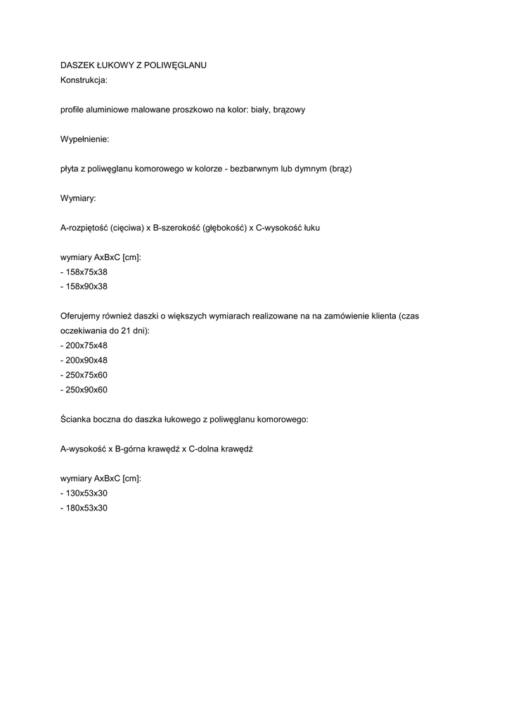 DASZEK ŁUKOWY Z POLIWĘGLANU Konstrukcja: profile aluminiowe malowane proszkowo na kolor: biały, brązowy Wypełnienie: płyta z poliwęglanu komorowego w kolorze - bezbarwnym lub dymnym (brąz) Wymiary: A-rozpiętość (cięciwa) x B-szerokość (głębokość) x C-wysokość łuku wymiary AxBxC [cm]: - 158x75x38 - 158x90x38 Oferujemy równieŜ daszki o większych wymiarach realizowane na na zamówienie klienta (czas oczekiwania do 21 dni): - 200x75x48 - 200x90x48 - 250x75x60 - 250x90x60 Ścianka boczna do daszka łukowego z poliwęglanu komorowego: A-wysokość x B-górna krawędź x C-dolna krawędź wymiary AxBxC [cm]: - 130x53x30 - 180x53x30 Instrukcja montaŜu zadaszenia łukowego 1. Wyjąć zadaszenie z opakowania foliowego. 2. Przymierzyć zadaszenie do ściany i obrysować rysikiem otwory w uchwytach mocujących (1). 3. Wywiercić w ścianie otwory w miejscach uprzednio zaznaczonych rysikiem przy pomocy wiertarki udarowej i wiertła do betonu f=8 mm. 4. Wsunąć koszulki kołków rozporowych w wywiercone otwory. 5. Zerwać folię ochronną z płyty poliwęglanowej. 6. Umyć daszek przy pomocy miękkiej gąbki i czystej wody. 7. PrzyłoŜyć daszek do ściany i przykręcić śrubami. Wymiary: A = 158 cm B = 75 cm C = 38 cm Szczelinę powstałą między daszkiem a ścianą po zamontowaniu zadaszenia wypełnić silikonem uniwersalnym. Kołki rozporowe naleŜy dostosować do rodzaju ściany. Instrukcja montaŜu ścianki działowej 1. Wyjąć ściankę działową z opakowania. 2. Rozpakować rurkę łączącą. 3. Przy pomocy wkrętów długości 45 mm połączyć ściankę z rurką łączącą (rysunek A). Po zamontowaniu zadaszenia i zmontowaniu elementów ścianki naleŜy połączyć zadaszenie i ściankę działową. 1. Wyjąć zaślepki plastikowe z kształtowników zadaszenia. 2. Przy pomocy wkrętów z podkładkami gumowymi połączyć zadaszenie i ściankę boczną (rysunek B). 3. Ustawić ściankę w pionie. 4. Zaznaczyć na ścianie miejsce na wywiercenie otworu pod kołek rozporowy (rysunek B). 5. Przesunąć w bok dół ścianki działowej. 6. Wywiercić otwór o średnicy 10 mm w zaznaczonym uprzednio miejscu. 7. Przymocować ściankę do muru za pomocą kołka rozporowego. Rys. A http://robelit.pl/,Instrukcja%20monta%BFu,160.html Rys. B