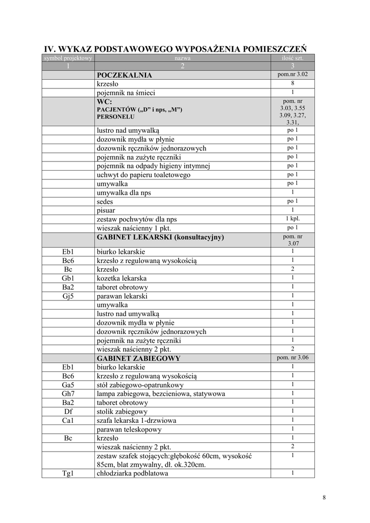 IV. WYKAZ PODSTAWOWEGO WYPOSAŻENIA POMIESZCZEŃ symbol projektowy nazwa 1 2 POCZEKALNIA krzesło pojemnik na śmieci WC: PACJENTÓW („D” i nps, „M”) PERSONELU lustro nad umywalką dozownik mydła w płynie dozownik ręczników jednorazowych pojemnik na zużyte ręczniki pojemnik na odpady higieny intymnej uchwyt do papieru toaletowego umywalka umywalka dla nps sedes pisuar zestaw pochwytów dla nps wieszak naścienny 1 pkt. GABINET LEKARSKI (konsultacyjny) Eb1 Bc6 Bc Gb1 Ba2 Gj5 Eb1 Bc6 Ga5 Gh7 Ba2 Df Ca1 Bc Tg1 biurko lekarskie krzesło z regulowaną wysokością krzesło kozetka lekarska taboret obrotowy parawan lekarski umywalka lustro nad umywalką dozownik mydła w płynie dozownik ręczników jednorazowych pojemnik na zużyte ręczniki wieszak naścienny 2 pkt. GABINET ZABIEGOWY biurko lekarskie krzesło z regulowaną wysokością stół zabiegowo-opatrunkowy lampa zabiegowa, bezcieniowa, statywowa taboret obrotowy stolik zabiegowy szafa lekarska 1-drzwiowa parawan teleskopowy krzesło wieszak naścienny 2 pkt. zestaw szafek stojących:głębokość 60cm, wysokość 85cm, blat zmywalny, dł. ok.320cm. chłodziarka podblatowa ilość szt. 3 pom.nr 3.02 8 1 pom. nr 3.03, 3.55 3.09, 3.27, 3.31, po 1 po 1 po 1 po 1 po 1 po 1 po 1 1 po 1 1 1 kpl. po 1 pom. nr 3.07 1 1 2 1 1 1 1 1 1 1 1 2 pom. nr 3.06 1 1 1 1 1 1 1 1 1 2 1 1 8 1 2 zlewozmywak 1-komorowy z płytą ociekową wbudowany w blat zestawu szafek umywalka (wbudowana w blat zestawu szafek) z baterią uruchamianą bez dotyku dłoni dozownik mydła w płynie dozownik środków dezynfekcyjnych dozownik ręczników jednorazowych pojemnik na zużyte ręczniki pojemnik na odpady MAGAZYNY: podręczny (na potrzeby sali szkoleniowej) materiałów medycznych czystej bielizny sprzętu brudnej bielizny Ci2 Ch9 Fd2 Tg2 Ea2 Bc6 Ch7 szafa magazynowa (90x60x180) regał magazynowy, stalowy (90x60x200) wózek do brudnej bielizny (2-workowy) chłodziarka HOL (pow.zarezerwowana na potrzeby szkoleniowe) Krzesło z blatem do pisania biurko 2-szafkowe krzesło z regulowaną wysokością ekran do prezentacji SZATNIA (kursantów) krzesło wieszak odzieżowy naścienny (dla max. 16 osób) GABINET ODDZIAŁOWEJ biurko + 3 krzesła fotel stolik okolicznościowy szafa biurowa umywalka lustro nad umywalką dozownik mydła w płynie dozownik ręczników jednorazowych pojemnik na zużyte ręczniki PRZEBIERALNIA PACJENTÓW krzesło wieszak odzieżowy naścienny regał listwowy + 1 kosz ŚLUZA WEJŚCIOWA lustro nad umywalką dozownik mydła w płynie dozownik ręczników jednorazowych pojemnik na zużyte ręczniki dozownik środków dezynfekcyjnych umywalka z baterią załączaną bezdotykowo 3 1 1 1 1 1 1 1 pom.nr 3.10 3.20 3.35 3.36 3.50 1 ogółem 9 1 1 pom. nr 3.04 16 1 1 1 pom. nr 3.08 2 1 kpl. pom. nr 3.12 1kpl. 2 1 2 1 1 1 1 1 pom. nr 3.13 2 1 1 pom.nr 3.14 1 1 1 1 1 1 9 1 Cd5 Ch7 Ef3 Bc Af1 Ea2 Bc6 Cd6 Tg1 2 ŚLUZA SZATNIOWA – SZATNIA BRUDNA „D” i „M” szafka odzieżowa 1-działowa (30x50x190) ławeczka szatniowa pojemnik na śmieci ŚLUZA SZATNIOWA – PRZEDSIONEK „D” i „M” lustro nad umywalką dozownik mydła w płynie dozownik ręczników jednorazowych pojemnik na zużyte ręczniki umywalka ŚLUZA SZATNIOWA – ŁAZIENKA „D” i „M” lustro nad umywalką wieszak naścienny 4pkt. uchwyt do papieru toaletowego wiadro pedałowe umywalka sedes natrysk bidet ŚLUZA SZATNIOWA – ŚLUZA POWROTNA „D” i „M” pojemnik z pokrywą (na użytą odzież) ŚLUZA SZATNIOWA – SZATNIA CZYSTA „D” i „M” regał listwowy, z 3 koszami i hakami na min.5 par obuwia POMIESZCZENIA PORZĄDKOWE regał magazynowy wieszak naścienny 4pkt. hak na worek z brudną bielizną dozownik środków dezynfekcyjnych zlew POKÓJ LEKARZY Z ANEKSEM KUCHENNYM stolik (60x60x74) z blatem zmywalnym krzesło stolik meblowy (80x80x74) kanapa biurko 2-szafkowe krzesło z regulowaną wysokością zestaw szafek stojących (szerokość 60cm, wysokość 85cm, długość ok.150cm) zestaw szaf biurowych szafa odzieżowa (60x60x190) chłodziarka wbudowana pod blat zestawu szafek 3 pom. nr 3.15, 3.21 12 + 16 1+2 po 1 pom. nr 3.16, 3.22 po 2 po 2 po 1 po 1 po 2 pom.nr 3.17, 3.25 po 1 po 2 po 1 po 1 po 1 po 1 po 2 1 w „D” pom. nr 3.18, 3.23 2+3 pom.nr 3.19 i 3.26 3+4 pom.nr 3.24, 3.53 po 1 po 1 2 po 1 po 1 pom.nr 3.05 1 4 1 1 6 6 1 1 kpl. 1 1 10 1 Kb2 Gh5N Dk1 Bc Af1 Tg1 Ax2 Kb2 Ca2 Ea2 Bc6 2 zlewozmywak 1-komorowy z płytą ociekową lustro nad umywalką dozowniki mydła w płynie dozownik ręczników jednorazowych pojemnik na zużyte ręczniki umywalka ANEKSY PRZYGOTOWANIA PACJENTA kontener zabiegowy lampa bezcieniowa, zabiegowa, przyścienna lustro nad umywalką dozownik mydła w płynie dozownik środków dezynfekcyjnych dozownik ręczników jednorazowych pojemnik na zużyte ręczniki pojemnik na odpady umywalka z baterią załączaną bezdotykowo POKÓJ PERSONELU stół krzesło zestaw szafek stojących z blatem zmywalnym (szerokość 60cm, wysokość 85cm, długość ok.200cm) kanapa chłodziarka podblatowa lustro nad umywalką dozownik mydła w płynie dozownik ręczników jednorazowych pojemnik na zużyte ręczniki pojemnik na śmieci umywalka wbudowana w blat zestawu szafek zlewozmywak 1-komorowy z płyta ociekową wbudowany w blat zestawu szafek SALA WYBUDZEŃ panel instalacyjny – przyścienny z szynami (górną i dolną) na dodatkowe wyposażenie i aparaturę kontrolnopomiarową wyposażony w: oświetlenie ogólne, oświetlenie miejscowe, 12 gniazd ekwipotencjalnych, 12 gniazd wtyczkowych, po dwa pkt. poboru: O2, V i A, przycisk instalacji przyzywowej, 2 gniazda RJ-45 kontener zabiegowy pompa infuzyjna zestaw aparatury monitorującej wg potrzeb użytkownika parawan teleskopowy szafa lekarska 2-drzwiowa Biurko dwuszafkowe krzesło z regulowaną wysokością lustro nad umywalką dozownik mydła w płynie 3 1 1 1 1 1 1 pom.nr 3.28, 3.29 po 1 po 1 po 1 po 1 po 1 po 1 po 1 po 1 po 1 pom.nr 3.30 1 4 1 1 1 1 1 1 1 1 1 1 pom.nr 3.32 6 szt. 1 6 1 4 1 1 1 1 1 1