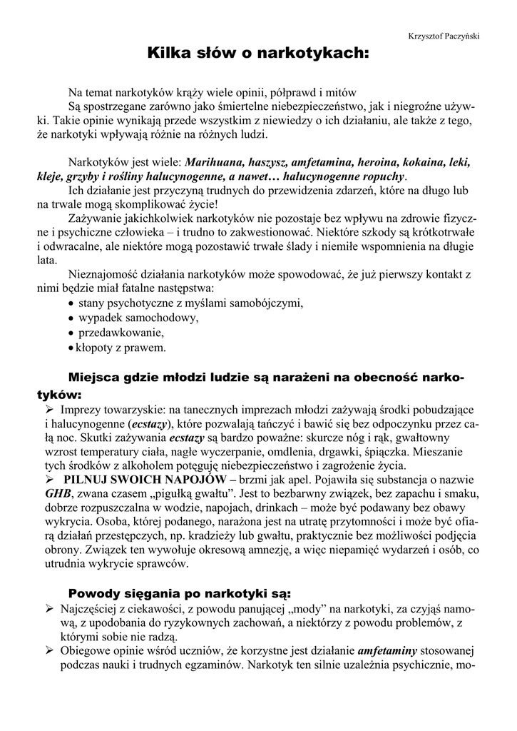 Krzysztof Paczyński Kilka słów o narkotykach: Na temat narkotyków krąży wiele opinii, półprawd i mitów Są spostrzegane zarówno jako śmiertelne niebezpieczeństwo, jak i niegroźne używki. Takie opinie wynikają przede wszystkim z niewiedzy o ich działaniu, ale także z tego, że narkotyki wpływają różnie na różnych ludzi. Narkotyków jest wiele: Marihuana, haszysz, amfetamina, heroina, kokaina, leki, kleje, grzyby i rośliny halucynogenne, a nawet… halucynogenne ropuchy. Ich działanie jest przyczyną trudnych do przewidzenia zdarzeń, które na długo lub na trwale mogą skomplikować życie! Zażywanie jakichkolwiek narkotyków nie pozostaje bez wpływu na zdrowie fizyczne i psychiczne człowieka – i trudno to zakwestionować. Niektóre szkody są krótkotrwałe i odwracalne, ale niektóre mogą pozostawić trwałe ślady i niemiłe wspomnienia na długie lata. Nieznajomość działania narkotyków może spowodować, że już pierwszy kontakt z nimi będzie miał fatalne następstwa: stany psychotyczne z myślami samobójczymi, wypadek samochodowy, przedawkowanie, kłopoty z prawem. Miejsca gdzie młodzi ludzie są narażeni na obecność narkotyków: Imprezy towarzyskie: na tanecznych imprezach młodzi zażywają środki pobudzające i halucynogenne (ecstazy), które pozwalają tańczyć i bawić się bez odpoczynku przez całą noc. Skutki zażywania ecstazy są bardzo poważne: skurcze nóg i rąk, gwałtowny wzrost temperatury ciała, nagłe wyczerpanie, omdlenia, drgawki, śpiączka. Mieszanie tych środków z alkoholem potęguję niebezpieczeństwo i zagrożenie życia. PILNUJ SWOICH NAPOJÓW – brzmi jak apel. Pojawiła się substancja o nazwie GHB, zwana czasem „pigułką gwałtu”. Jest to bezbarwny związek, bez zapachu i smaku, dobrze rozpuszczalna w wodzie, napojach, drinkach – może być podawany bez obawy wykrycia. Osoba, której podanego, narażona jest na utratę przytomności i może być ofiarą działań przestępczych, np. kradzieży lub gwałtu, praktycznie bez możliwości podjęcia obrony. Związek ten wywołuje okresową amnezję, a więc niepamięć wydarzeń i osób, co utrudnia wykrycie sprawców. Powody sięgania po narkotyki są: Najczęściej z ciekawości, z powodu panującej „mody” na narkotyki, za czyjąś namową, z upodobania do ryzykownych zachowań, a niektórzy z powodu problemów, z którymi sobie nie radzą. Obiegowe opinie wśród uczniów, że korzystne jest działanie amfetaminy stosowanej podczas nauki i trudnych egzaminów. Narkotyk ten silnie uzależnia psychicznie, mo- że się rozwinąć psychoza amfetaminowa (lęki, urojenia, natręctwa), a uczucie odprężenia i uspokojenia mija szybko. Problemy w rodzinie. Wielu badaczy poszukujących przyczyn narkomanii jako jeden z ważniejszych czynników chroniących przed używaniem narkotyków wymienia rodzinę. Dobrze funkcjonująca rodzina to jak sprawnie działająca maszyna. Wystarczy jednak, że jeden z członków rodziny ma problemy, a cała rodzina może przestać sprawnie działać. W życiu młodych ludzi zawsze ważna (czasem ważniejsza od rodziny) jest grupa rówieśnicza. Aby znaleźć akceptację grupy, niektórzy gotowi są na wiele – nawet na używanie narkotyków. W poszukiwaniu miłości – młodzi ludzie poszukują partnera czy partnerki, chcą kochać i być kochani. Niektórzy jednak mają problemy z nawiązywaniem kontaktów i sięgają po narkotyki dla dodania sobie odwagi i pewności siebie. Po niektórych narkotykach rzeczywiście ludzie są bardziej rozmowni, towarzyscy, wyluzowani, wzrasta ich samoocena, pewność siebie i łatwiej nawiązują znajomości. Problem w tym, że kiedy nie biorą znowu stają się w swoim mniemaniu nieatrakcyjni, więc sięgają po nie ponownie i kółko się zamyka. Jakie zmiany w człowieku powodują narkotyki? 1. Problemy fizyczne: serce, wątroba, płuca, oskrzela, naczynia krwionośne. 2. Problemy psychiczne: zaburzenia nastroju, koncentracji, pamięci, rozchwianie emocjonalne, stany psychotyczne, zmiany w sferze osobowości. 3. Wygląd zewnętrzny: najbardziej zmienia się „uroda” ludzi przewlekle biorących heroinę, amfetaminę, sterydy. Heroina: wychudzenie, zmiany zapalne skóry, próchnica zębów, brak ogólnej dbałości o wygląd zewnętrzny; Amfetamina: wychudzenie, wysypki; Sterydy: trądzik, rozstępy, przyspieszenie łysienia. Prawo o narkotykach: W Polsce prawo jest jednoznaczne i mówi, że posiadanie nawet najmniejszej ilości jakiegokolwiek narkotyku jest karalne. Ustawa o przeciwdziałaniu narkomanii z dnia 24 kwietnia 1997 r. (Dz.U. nr 75, poz 468 z póżn. zm.) mówi: – Posiadanie narkotyków zagrożone jest karą więzienia do lat 3. – Posiadanie znacznej ilości narkotyków zagrożone jest karą więzienia do lat 5 i grzywną. – Handel narkotykami zagrożony jest karą więzienia do lat 10. – Udzielanie lub nakłanianie do użycia narkotyków zagrożone jest karą więzienia do lat 5. – Kodeks karny (art.178) przewiduje bardzo surowe kary za spowodowanie wypadku drogowego pod wpływem środków odurzających. Aby zdobyć więcej informacji o narkotykach można zadzwonić na Antynarkotykowy Telefon Zaufania 0 801 199 990 czynny codziennie od 16 do 21 lub odwiedzić internetową poradnie: www.poradnia.narkomania.org.pl Materiał pochodzi z broszury wydanej przez Krajowe Biuro ds. Przeciwdziałania Narkomanii