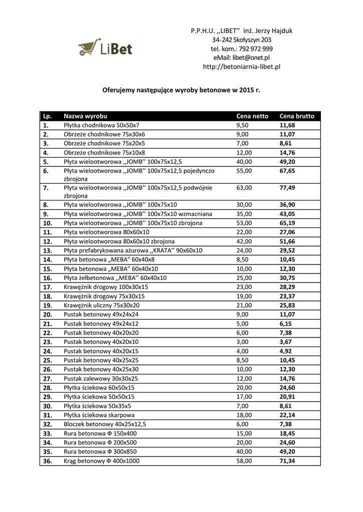 P.P.H.U. ,,LIBET’’ inż. Jerzy Hajduk 34-242 Skołyszyn 203 tel. kom.: 792 972 999 eMail: [email protected] http://betoniarnia-libet.pl Oferujemy następujące wyroby betonowe w 2015 r. Lp. 1. 2. 3. 4. 5. 6. 7. 8. 9. 10. 11. 12. 13. 14. 15. 16. 17. 18. 19. 20. 21. 22. 23. 24. 25. 26. 27. 28. 29. 30. 31. 32. 33. 34. 35. 36. Nazwa wyrobu Płytka chodnikowa 50x50x7 Obrzeże chodnikowe 75x30x6 Obrzeże chodnikowe 75x20x5 Obrzeże chodnikowe 75x10x8 Płyta wielootworowa ,,JOMB’’ 100x75x12,5 Płyta wielootworowa ,,JOMB’’ 100x75x12,5 pojedynczo zbrojona Płyta wielootworowa ,,JOMB’’ 100x75x12,5 podwójnie zbrojona Płyta wielootworowa ,,JOMB’’ 100x75x10 Płyta wielootworowa ,,JOMB’’ 100x75x10 wzmacniana Płyta wielootworowa ,,JOMB’’ 100x75x10 zbrojona Płyta wielootworowa 80x60x10 Płyta wielootworowa 80x60x10 zbrojona Płyta prefabrykowana ażurowa ,,KRATA’’ 90x60x10 Płyta betonowa „MEBA” 60x40x8 Płyta betonowa „MEBA” 60x40x10 Płyta żelbetonowa ,,MEBA’’ 60x40x10 Krawężnik drogowy 100x30x15 Krawężnik drogowy 75x30x15 Krawężnik uliczny 75x30x20 Pustak betonowy 49x24x24 Pustak betonowy 49x24x12 Pustak betonowy 40x20x20 Pustak betonowy 40x20x10 Pustak betonowy 40x20x15 Pustak betonowy 40x25x25 Pustak betonowy 40x25x30 Pustak zalewowy 30x30x25 Płytka ściekowa 60x50x15 Płytka ściekowa 50x50x15 Płytka ściekowa 50x35x5 Płytka ściekowa skarpowa Bloczek betonowy 40x25x12,5 Rura betonowa Ф 150x400 Rura betonowa Ф 200x500 Rura betonowa Ф 300x850 Krąg betonowy Ф 400x1000 Cena netto 9,50 9,00 7,00 12,00 40,00 55,00 Cena brutto 11,68 11,07 8,61 14,76 49,20 67,65 63,00 77,49 30,00 35,00 53,00 22,00 42,00 24,00 8,50 10,00 25,00 23,00 19,00 21,00 9,00 5,00 6,00 3,00 4,00 8,50 10,00 12,00 20,00 17,00 7,00 18,00 6,00 15,00 20,00 40,00 58,00 36,90 43,05 65,19 27,06 51,66 29,52 10,45 12,30 30,75 28,29 23,37 25,83 11,07 6,15 7,38 3,67 4,92 10,45 12,30 14,76 24,60 20,91 8,61 22,14 7,38 18,45 24,60 49,20 71,34 37. 38. 39. 40. 41. 42. 43. 44. 45. 46. 47. 48. 49. 50. 51. 52. 53. 54. 55. 56. 57. 58. 59. 60. 61. 62. 63. 64. 65. 66. 67. 68. 69. 70. 71. 72. 73. 74. 75. 76. 77. 78. 79. 80. 81. 82. Krąg betonowy Ф 500x1000 Krąg betonowy Ф 600x1000 Krąg betonowy Ф 800x750 Krąg betonowy Ф 800x1000 Krąg betonowy Ф 1000x500 Krąg betonowy Ф 1000x1000 Krąg betonowy Ф 1200x750 Krąg betonowy Ф 800x750 ze stopniami kanałowymi Krąg betonowy Ф 1000x500 ze stopniami kanałowymi Krąg betonowy Ф 1000x1000 ze stopniami kanałowymi Krąg betonowy Ф 1200x750 ze stopniami kanałowymi Krąg żelbetonowy Ф 400x1000 Krąg żelbetonowy Ф 400x1000 Krąg żelbetonowy Ф 500x1000 Krąg żelbetonowy Ф 600x1000 Krąg żelbetonowy Ф 800x750 Krąg żelbetonowy Ф 800x1000 Krąg żelbetonowy Ф 1000x500 Krąg żelbetonowy Ф 1000x1000 Krąg żelbetonowy Ф 1200x750 Dok żelbetonowy Ф 800x750 Dok żelbetonowy Ф 1000x500 Dok żelbetonowy Ф 1000x1000 Dok żelbetonowy Ф 1200x750 Koryto odwadniające żelbet. typ kolejowy 75x60 Koryto odwadniające 60x60 Koryto odwadniające 60x50x45 Pół koryto odwadniające 60x30 Korytko odwadniające 50x30x30 Korytko odwadniające żelbetonowe 50x30x30 Korytko odwadniające 50x30x12 Korytko odwadniające 60x18x14 Dyble betonowe Trylinka betonowa Gurt betonowy Wyloty betonowe pojedyncze Wyloty betonowe składane Pierścieo odciążający żelbet. Ф 1200/600x200 Pierścieo odciążający żelbetonowy Ф 1200/800x250 Pierścieo odciążający żelbetonowy Ф 1200/700x250 Pierścieo odciążający żelbetonowy Ф 1450/1000x250 Pierścieo odciążający żelbetonowy Ф 1700/1220x250 Pierścieo odciążający żelbetonowy Ф 1700/1220x200 Pierścieo odciążający żelbetonowy Ф 2000/1500x250 Pierścieo betonowy Ф800x250 składany Nakrywa żelbetonowa Ф 1000x100 70,00 80,00 90,00 120,00 80,00 150,00 165,00 120,00 120,00 200,00 205,00 78,00 80,00 100,00 110,00 115,00 155,00 120,00 210,00 240,00 180,00 180,00 285,00 320,00 90,00 58,00 30,00 20,00 20,00 35,00 12,00 10,00 12,00 10,00 22,00 25,00 175,00 135,00 145,00 165,00 240,00 300,00 250,00 320,00 32,00 45,00 86,10 98,40 110,70 147,60 98,40 184,50 202,95 147,60 147,60 246,00 252,15 95,94 98,40 123,00 135,30 141,45 190,65 147,60 258,30 295,20 221,40 221,40 350,55 393,60 110,70 71,34 36,90 24,60 24,60 43,05 14,76 12,30 14,76 12,30 27,06 30,75 215,25 166,05 178,35 202,95 295,20 369,00 307,50 393,60 39,36 55,35 83. 84. 85. 86. 87. 88. 89. 90. 91. 92. 93. 94. 95. 96. 97. 98. 99. 100. 101. 102. 103. 104. 105. 106. 107. 108. 109. 110. 111. 112. 113. 114. 115. 116. 117. 118. 119. 120. 121. 122. 123. 124. 125. Nakrywa żelbetonowa Ф 1000x150/60 Nakrywa żelbetonowa Ф 1200x100 Nakrywa żelbetonowa Ф 1200x150/60 Nakrywa żelbetonowa Ф 1450x150/60 Nakrywa żelbetonowa Ф 1700x150/60 Nakrywa żelbetonowa Ф 2000x150/60 Ogrodzenie żelbetonowe 2000x1500 Ogrodzenie żelbetonowe 2000x1750 Ogrodzenie żelbetonowe 2000x1250 Ogrodzenie żelbetonowe 2000x2000 Ogrodzenie żelbetonowe 2000x2500 Słupek ogrodzeniowy 1000 Słupek ogrodzeniowy 1250 Słupek ogrodzeniowy 1500 Słupek ogrodzeniowy 1950 Słupek ogrodzeniowy 2250 Słupek ogrodzeniowy 2500 Słupek ogrodzeniowy 2750 Słupek ogrodzeniowy 3250 Słupek 220x10x8 „góra” Słupek 250x10x10 „góra” Słupek 260x6x6 „góra” Słupek 260x8x6 „góra” Słupek 260x10x8 „góra” Słupek 320x8x6 „góra” Słupek żelbetonowy do oznakowania 1400x120x120 Słupek żelbetonowy do oznakowania 1400x140x140 Słupek znacznikowy 1550x120x120 Słupki betonowe graniczne 55x15 Przęsło ogrodzeniowe 2000x250x50 Przęsło ogrodzeniowe 2500x200x50 Przęsło ogrodzeniowe 2500x250x60 Przęsło ogrodzeniowe 3000x250x60 Przęsło ogrodzeniowe 2000x500x50 Przęsło żelbetonowe 2000x500x50 Pustak betonowy ogrodzeniowy 25x25x20 Pustak betonowy ogrodzeniowy 25x25x25 Rura betonowa skośna 40 Rura betonowa skośna 50 Rura betonowa skośna 60 Łaocuch betonowy „Kosteckiego” element A Łaocuch betonowy „Kosteckiego” element B Łaocuch betonowy „Koste