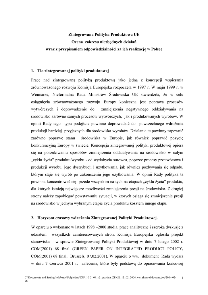 Zintegrowana Polityka Produktowa UE Ocena zakresu niezbędnych działań wraz z przypisaniem odpowiedzialności za ich realizację w Polsce 1. Tło zintegrowanej polityki produktowej Prace nad zintegrowaną polityką produktową jako jedną z koncepcji wspierania zrównoważonego rozwoju Komisja Europejska rozpoczęła w 1997 r. W maju 1999 r. w Weimarze, Nieformalna Rada Ministrów Środowiska UE stwierdziła, że w celu osiągnięcia zrównoważonego rozwoju Europy konieczna jest poprawa procesów wytwórczych i doprowadzenie do zmniejszenia negatywnego oddziaływania na środowisko zarówno samych procesów wytwórczych, jak i produkowanych wyrobów. W opinii Rady tego typu podejście powinno doprowadzić do powszechnego wdrożenia produkcji bardziej przyjaznych dla środowiska wyrobów. Działania te powinny zapewnić zarówno poprawę stanu środowiska w Europie, jak również poprawić pozycję konkurencyjną Europy w świecie. Koncepcja zintegrowanej polityki produktowej opiera się na poszukiwaniu sposobów zmniejszenia oddziaływania na środowisko w całym „cyklu życia” produktu/wyrobu - od wydobycia surowca, poprzez procesy przetwórstwa i produkcji wyrobu, jego dystrybucji i użytkowania, jak również pozbywania się odpadu, którym staje się wyrób po zakończeniu jego użytkowania. W opinii Rady polityka ta powinna koncentrować się przede wszystkim na tych na etapach „cyklu życia” produktu, dla których istnieją największe możliwości zmniejszenia presji na środowisko. Z drugiej strony należy zapobiegać powstawaniu sytuacji, w których osiąga się zmniejszenie presji na środowisko w jednym wybranym etapie życia produktu kosztem innego etapu. 2. Horyzont czasowy wdrażania Zintegrowanej Polityki Produktowej. W oparciu o wykonane w latach 1998 –2000 studia, prace analityczne i szeroką dyskusję z udziałem stanowiska wszystkich zainteresowanych stron, Komisja Europejska ogłosiła projekt w sprawie Zintegrowanej Polityki Produktowej w dniu 7 lutego 2002 r. COM(2001) 68 final (GREEN PAPER ON INTEGRATED PRODUCT POLICY, COM(2001) 68 final, Brussels, 07.02.2001). W oparciu o ww. dokument Rada wydała w dniu 7 czerwca 2001 r. zalecenia, które były podstawą do opracowania końcowej C:\Documents and Settings\wlabasze\Pulpit\jeza\ZPP_10 01 04_v3_przyjeta_ZPKIE_13_02_2004_ver_skonsolidowana.doc/2004-0226 1 wersji dokumentu dotyczącego Zintegrowanej Polityki Produktowej, zatytułowanego „Komunikat Komisji dla Rady i Parlamentu Europejskiego: Zintegrowana Polityka Produktowa. Budowanie w oparciu o Środowiskową Metodykę Cyklu Życia” z dnia 18 czerwca, 2003 r., COM (2003) 302 final (COMMUNICATION FROM THE COMMISSION ON THE COUNCIL AND THE EUROPEAN PARLIAMENT: Integrated Product Policy. Building on Environmental Life-Cycle Thinking, Brussels, 18.06.2003.3.) Zgodnie z tym dokumentem Komisja przewiduje opracowanie Zintegrowanej Polityki Produktowej w ciągu 5 lat (2003-2007). Całkowity budżet przewidziany na realizację tego działania wynosi blisko 5 mln EUR, z czego 1,6 mln EUR przeznacza się na koszty ekspertyz, pracy ekspertów, prac studialnych, projektów pilotowych, a ponad 3,3 mln EUR na wydatki związane z pracą 6 urzędników koordynujących to działanie. Rada Ministrów Środowiska UE w dokumencie końcowym z posiedzenia w dnia 27 października 2003 r. dotyczącego polityki produktowej kładzie głównie nacisk na koordynację działań w zakresie opracowywania instrumentów wspierających Zintegrowaną Politykę Produktową oraz badania związane z tworzeniem naukowych podstaw oceny negatywnego oddziaływania na środowisko różnych substancji i produktów. Dokument ten przewiduje, że wyniki prowadzonych działań, w formie raportu przeglądowego dotyczącego analizy „cyklu życia” (life-cycle thinking), zostaną przedstawione do akceptacji Radzie i Parlamentowi Europejskiemu w 2007 r. 3. Instrumenty przewidywane do realizacji polityki produktowej Dokument COM (2003) 302 final z dnia 18 czerwca 2003 r. w sprawie zintegrowanej polityki produktowej przewiduje szereg instrumentów służących do jej wdrażania. Instrumenty te przedstawiono w tablicy 1. Są to m.in. instrumenty finansowe, takie jak podatki ekologiczne, rachunkowość uwzględniająca wszystkie koszty produkcji (łącznie ze stratami w środowisku), tzw. internalizacja kosztów zewnętrznych czy wycofywanie subsydiów. Inne przewidywane instrumenty to: upowszechnianie eko-znakowania, zapewnienie dostępu do informacji środowiskowych związanych z produktem dla konsumentów, upowszechnianie zarządzania środowiskowego w przedsiębiorstwach i organizacjach - EMAS (Eco-management and Auditing Scheme), upowszechnianie deklaracji środowiskowych dla produktów, przystępowanie do porozumień C:\Documents and Settings\wlabasze\Pulpit\jeza\ZPP_10 01 04_v3_przyjeta_ZPKIE_13_02_2004_ver_skonsolidowana.doc/2004-0226 2 środowiskowych pomiędzy przedsiębiorcami i władzą publiczną1, stosowanie kryteriów ekologicznych przy przetargach finansowanych ze środków publicznych itp. Komisja uważa, że instrumenty te, powinny zapewnić ciągłe usprawnianie produktów i usług, w celu zmniejszania ich negatywnego oddziaływania na środowisko, tzn. poprzez nadawanie produktom i usługom cech bardziej przyjaznych środowisku2. W tablicy polityki 1 przedstawiającej instrumenty wspomagające wdrożenie zintegrowanej produktowej, obok poszczególnych instrumentów umieszczono nazwę dokumentu referencyjnego, w którym podano przewidywane przez Komisję Europejską działania, względnie krótką charakterystykę działań, które w opinii Komisji powinny wspierać wdrażanie ww. polityki. Należy podkreślić, że prace nad formułowaniem zintegrowanej polityki produktowej nadal trwają (jak wspomniano powyżej przewidywany termin zakończenia prac i przekazania dokumentu do Parlamentu Europejskiego do akceptacji to 2007 r.), dlatego też propozycje szczegółowych rozwiązań rozwa