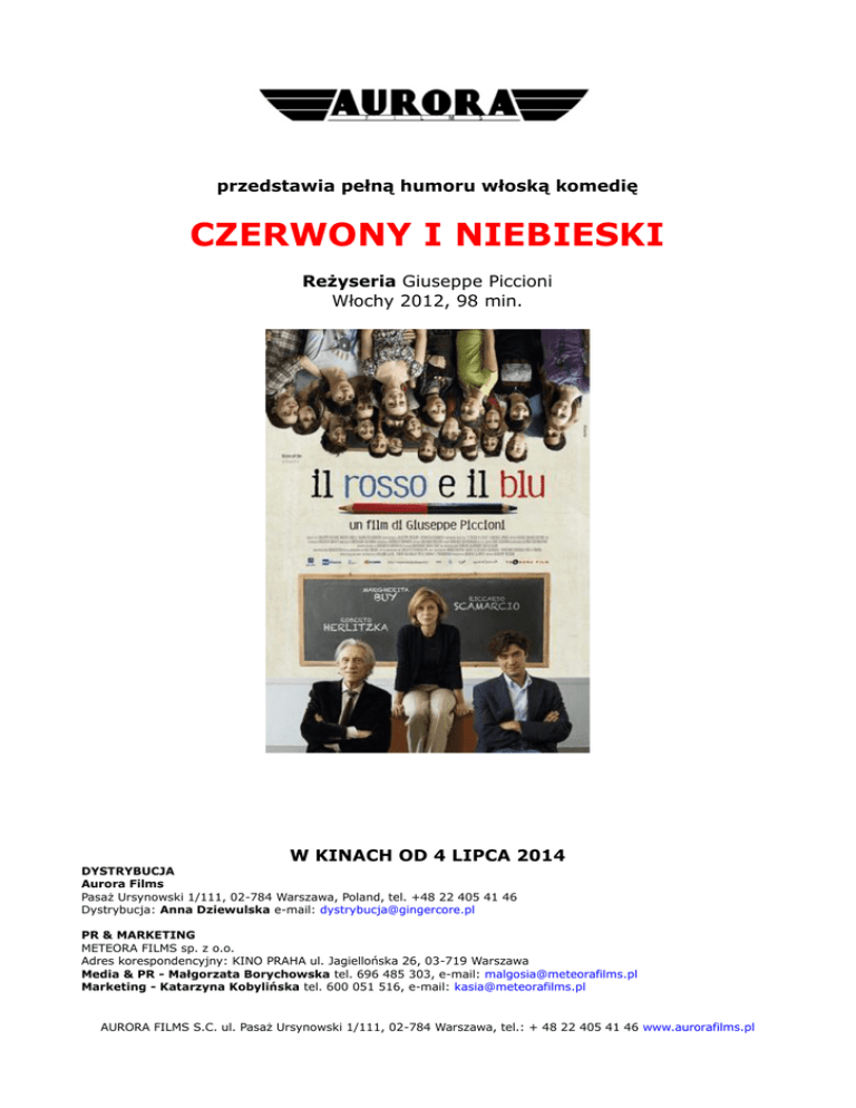 przedstawia pełną humoru włoską komedię CZERWONY I NIEBIESKI Reżyseria Giuseppe Piccioni Włochy 2012, 98 min. W KINACH OD 4 LIPCA 2014 DYSTRYBUCJA Aurora Films Pasaż Ursynowski 1/111, 02-784 Warszawa, Poland, tel. +48 22 405 41 46 Dystrybucja: Anna Dziewulska e-mail: [email protected] PR & MARKETING METEORA FILMS sp. z o.o. Adres korespondencyjny: KINO PRAHA ul. Jagiellońska 26, 03-719 Warszawa Media & PR - Małgorzata Borychowska tel. 696 485 303, e-mail: [email protected] Marketing - Katarzyna Kobylińska tel. 600 051 516, e-mail: [email protected] AURORA FILMS S.C. ul. Pasaż Ursynowski 1/111, 02-784 Warszawa, tel.: + 48 22 405 41 46 www.aurorafilms.pl Aurora Films S.C. przedstawia produkcję Bianca Film we współpracy z Rai Cinema i Cinecittá Studios CZERWONY I NIEBIESKI Tytuł oryginalny: Il rosso e il blu w reżyserii Giuseppe Piccioniego Twórcy filmu: Scenariusz : Giuseppe Piccioni, Francesca Manieri na podstawie powieści Marco Lodoliego Zdjęcia: Roberto Cimatti Montaż: Esmeralda Calabria Muzyka: Ratchev & Carratello Scenografia: Ivana Gargiulo, Ludovica Ferrario Produkcja: Donatella Botti Występują: Riccardo Scamarcio Profesor Giovanni Prezioso Margherita Buy Giuliana Roberto Herlitzka Profesor Fiorito Nina Torresi Melania Lucia Mascino Elena Togani Davide Giordano Enrico Brugnoli Elena Lietti Emma Tassi i inni AURORA FILMS S.C. ul. Pasaż Ursynowski 1/111, 02-784 Warszawa, tel.: + 48 22 405 41 46 www.aurorafilms.pl Nagrody/Festiwale: 2013 – nominacja dla Roberto Herlitzki do nagrody „David di Donatello” w kategorii najlepszy aktor 2013 – Nagroda Związku Dziennikarzy Filmowych we Włoszech, nominację dla Donatelli Botti za najlepszą produkcje i dla Giuseppe Piccioniego i Francesca Manieriego za najlepszy scenariusz Opis filmu: Nagły powrót do szkolnych lat nie dla każdego widza mógłby być przyjemny. Jednak jeśli popatrzy on na swoją szkołę poprzez film Giuseppe Piccioniego na pewno przypomni sobie swoje młodzieńcze porywy, pierwsze miłości, bronione z pasją poglądy. Poprzez wspaniały humor filmu inaczej spojrzy na swoich dawnych nauczycieli. Podobnie jak bohaterowie włoskiej komedii również oni pod pozorami oschłości mogli kryć zarówno dobre serca jak i zawiedzione nadzieje czy liczne osobiste problemy. Do szkoły średniej w Rzymie trafia na zastępstwo początkujący nauczyciel Giovanni Prezioso (Riccardo Scamarcio - pamiętany z głównej roli w komedii „Mine vaganti. O miłości i makaronach”). Pełen dobrych chęci i wiary w uczniów chciałby być dla swoich wychowanków niczym Robin Williams w „Stowarzyszeniu umarłych poetów”. Jednak zamiast zarażać ich miłością do kultury i sztuki musi zmierzyć się z obojętnością klasykonglomeratu imigrantów, dzieciaków z problemami i dorastających dziewcząt. Jego przewodnikiem staje się profesor Fiorito (Roberto Herlitzka) stary nauczyciel historii sztuki, kiedyś wspaniały wykładowca, obecnie wypalony przez lata pracy cynik, marzący już tylko o zbliżającej się emeryturze, albo jeszcze bliższym samobójstwie. Szkołą stara się zarządzać trzecia główna bohaterka filmu - Giuliana (grana przez Margeritę Buy). Boryka się z obojętnością rodziców na los swoich dzieci, niechęcią władz do odpowiedniego dotowania szkoły i tysiącem spraw administracyjnych, które powoli czynią z AURORA FILMS S.C. ul. Pasaż Ursynowski 1/111, 02-784 Warszawa, tel.: + 48 22 405 41 46 www.aurorafilms.pl niej wyzutą z emocji i niedostępną kobietę. Wszystko się zmienia, gdy pewnego dnia pod materacami na sali gimnastycznej znajduje Adama, jednego z najlepszych uczniów szkoły. Chłopiec porzucony przez matkę nie ma co z sobą począć, ani gdzie mieszkać. Giluliana , dotychczas potrafiąca zmierzyć się z każdą sytuacją, ryzykuje swój autorytet i postanawia mu pomóc. Jej los przecina się z historią dwóch pozostałych nauczycieli. Na drodze profesora Fioritino staje jego dawny uczeń, a Prezioso musi zmierzyć się ze zbuntowaną uczennicą ze swojej klasy – Melanią. Każde z nich zostaje postawione przed trudną sytuacją, w której nie działają żadne z góry założone schematy. Błędy w szkolnych pracach nauczyciele bez trudu oznaczali tytułowymi kolorami, czerwonym i niebieskim, to w jaki sposób poprowadzą swoje życie nie jest jednak tak łatwe... Ponad głowami uczniów, dzwonków szkolnych, codziennych, nudnych lekcji zaczynają się przetaczać dramaty dalekie od uświęconych relacji szkolnych. Film, oparty na bestsellerowej powieści Marco Lodoli, nie tonie w dydaktycznym sosie. Wyreżyserowany z prawdziwą szczerością, ciętym humorem i zrozumieniem każdego z bohaterów spotkał się z dużą popularnością wśród włoskich widzów. Od momentu premiery 21 września 2012 zarobił już półtora miliona dolarów w rodzinnym kraju i został sprzedany do dystrybucji w wielu innych. Rola Roberto Herlitzki została z kolei uznana przez krytykę za jedną z najlepszych w jego karierze i nominowana do nagrody „David di Donatello” - włoskiego odpowiednika Oskara. AURORA FILMS S.C. ul. Pasaż Ursynowski 1/111, 02-784 Warszawa, tel.: + 48 22 405 41 46 www.aurorafilms.pl Giuseppe Picconi o swoim filmie: Świetnie, jeśli szkoła dobrze uczy, dobrze jeśli przynajmniej nie jest niebezpieczna dla młodych ludzi i kieruje ich na właściwą drogę. Wspaniale jeśli pomaga odkryć umiejętności i wskazać życiowe powołanie. Jej „zbawcza misja” często jednak ulega zaburzeniom. Musi mierzyć się z setkami bezkształtnych problemów, nacisku mediów i dydaktyków, subkultur i życia ulicy. Nie chciałem jednak podchodzić do tego problemu socjologicznie, pokazywać szkoły w jakiejś zapomnianej dzielnicy; mówić o edukacji w sposób łatwy do zaszufladkowania. „Czerwony i niebieski” stara się pokazać świat, w którym ludzie nie mogąc znaleźć swojej tożsamości, powoli wychodzą ze swoich codziennych skorup. Film czyni 