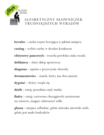 Alfa b e t yc z n y s ł o w n i c z e k tru d n i e j s z yc h w y ra z ó w bywalec – osoba często bywająca w jakimś miejscu casting – wybór osoby w drodze konkursu chitynowy pancerzyk – twarda powłoka ciała owada delikatesy – duży sklep spożywczy diagnoza – opinia o przyczynie choroby dwumasztowiec – statek, który ma dwa maszty dygotać – drżeć, trząść się dziób – tutaj: przednia część statku fladry – tutaj: czerwone chorągiewki zawieszone na sznurze, mające odstraszyć wilki głusza – miejsce odludne, gdzie mieszka niewiele osób, gdzie jest mało budynków internat – hotel dla zamiejscowych uczniów, często przy szkole lub w jej pobliżu klub fitness – miejsce, gdzie dorośli przychodzą ćwiczyć kłoda – pień zrąbanego lub powalonego drzewa, pozbawiony gałęzi koślawy – krzywy kotły – instrumenty muzyczne podobne do bębnów kożuch – zimowe palto ze skóry owczej kuracja – leczenie kurnik – pomieszczenie gospodarskie dla kur kuśtykać – chodzić, utykając na jedną nogę; kuleć lampa błyskowa – część aparatu fotograficznego, która oświetla fotografowaną osobę lub rzecz ligustr – krzew o drobnych liściach, kwitnący na biało; w Polsce stosowany głównie jako żywopłot łom – stalowy pręt, na końcu zaostrzony lub spłaszczony, używany do rozbijania, kruszenia lub podważania czegoś madame – „pani” po francusku martwieć – tu: zastygać w bezruchu, nieruchomieć ze strachu maszt – część statku, służąca do zawieszenia żagla menedżer – kierownik niezidentyfikowany – taki, o którym nikt nic nie wie nyska – stare auto dostawcze obora – budynek dla bydła, głównie dla krów oszołomiony – więcej niż zaskoczony, niezwykle zdumiony panika – nagły, silny strach pelargonia – roślina doniczkowa, ozdobna, hodowana w Polsce na balkonach i w mieszkaniach pensjonat – dom z pokojami do wynajęcia pobrużdżony – pomarszczony, pokryty bruzdami podest – miejsce stanowiące początek lub koniec schodów pokpiwać – podśmiewać się popielaty – podobny do koloru popiołu; inaczej: jasnoszary przedwojenny – tu: pochodzący z okresu sprzed II wojny światowej, czyli mający ponad 75 lat przycupnąć – przysiąść lub przykucnąć na chwilę przytaszczyć – przynieść coś ciężkiego rozcapierzone – rozłożone, szeroko rozciągnięte rufa – tylna część statku rumor – łoskot, hałas spiżarnia – pomieszczenie domowe, w którym przechowuje się jedzenie stanąć słupka – o zwierzęciu czworonożnym: stanąć na tylnych łapach staroświecki – staromodny stelaż – tu: podstawa, rama, na której opiera się cała konstrukcja stodoła – duży budynek gospodarski do przechowywania zbóż, słomy i siana stres – napięcie emocjonalne związane z trudną sytuacją struchlały – przerażony, przestraszony sumiaste wąsy – długie i gęste wąsy szrotówek – motyl, który jest szkodnikiem zjadającym liście kasztanowców szuwary – rośliny rosnące gęsto nad brzegami jezior; zarośla wokół brzegów jezior śmiać się do rozpuku – bardzo się śmiać, zanosić się śmiechem tarabanić – tu: uderzać mocno, czyniąc przy tym hałas tchórz – osoba bojaźliwa, taka, którą łatwo przestraszyć tropy – ślady zwierząt na śniegu lub ziemi wataha – stado wilków wizytówka – podręczny kartonik z imieniem i nazwiskiem wprawki – ćwiczenia wykałaczka – cienki, mały drewniany patyczek zaostrzony na końcach wyrostek – ślepa kiszka w prawym boku, która może wywołać ból brzucha wystrugany – wyrzeźbiony ręcznie z jednego kawałka drewna zadygotać – gwałtownie zadrżeć, zatrząść się z jakiegoś powodu złowieszczy – zapowiadający coś złego weekend – koniec tygodnia wezgłowie – szczyt łóżka, o który można się oprzeć wypolerowane – tutaj: wyczyszczone tak, że się błyszczy zachłanny – taki, który chce mieć więcej, niż potrzebuje zacukać się – zaniemówić z zakłopotania zaszarżować – gwałtownie zaatakować zirytowany – rozzłoszczony, zdenerwowany, rozdrażniony znienacka – nagle, z zaskoczenia
