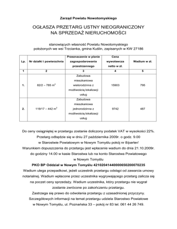 Zarząd Powiatu Nowotomyskiego OGŁASZA PRZETARG USTNY NIEOGRANICZONY NA SPRZEDAś NIERUCHOMOŚCI stanowiących własność Powiatu Nowotomyskiego połoŜonych we wsi Trzcianka, gmina Kuślin, zapisanych w KW 27186 Lp. 1 Nr działki i powierzchnia 2 Przeznaczenie w planie Cena zagospodarowania wywoławcza przestrzennego netto w zł. 3 4 5 15903 795 9742 487 Wadium w zł. Zabudowa mieszkaniowa 1. 82/2 – 785 m 2 wielorodzinna z moŜliwością lokalizacji usług Zabudowa mieszkaniowa 2. 119/17 – 442 m 2 jednorodzinna z moŜliwością lokalizacji usług Do ceny osiągniętej w przetargu zostanie doliczony podatek VAT w wysokości 22%. Przetarg odbędzie się w dniu 27 października 2009r. o godz. 9.00 w Starostwie Powiatowym w Nowym Tomyślu pokój nr 8/parter/ Warunkiem dopuszczenia do przetargu jest wpłacenie wadium do dnia 21.10.2009r. do godziny 14.00 w kasie Starostwa lub na konto Starostwa Powiatowego w Nowym Tomyślu PKO BP Oddział w Nowym Tomyślu 42102041440000650200070235 Wadium ulega przepadkowi, jeŜeli uczestnik przetargu odstąpi od zawarcia umowy notarialnej. Wadium wpłacone przez uczestnika wygrywającego przetarg zalicza się na poczet ceny sprzedaŜy. Wadium uczestnika, który przetargu nie wygrał zostanie zwrócone po zakończeniu przetargu. Zastrzega się prawo do odwołania przetargu z uzasadnionej przyczyny. Szczegółowych informacji na temat przetargu udziela Starostwo Powiatowe w Nowym Tomyślu, ul. Poznańska 33 – pokój nr 83 tel. 061 44 26 749.