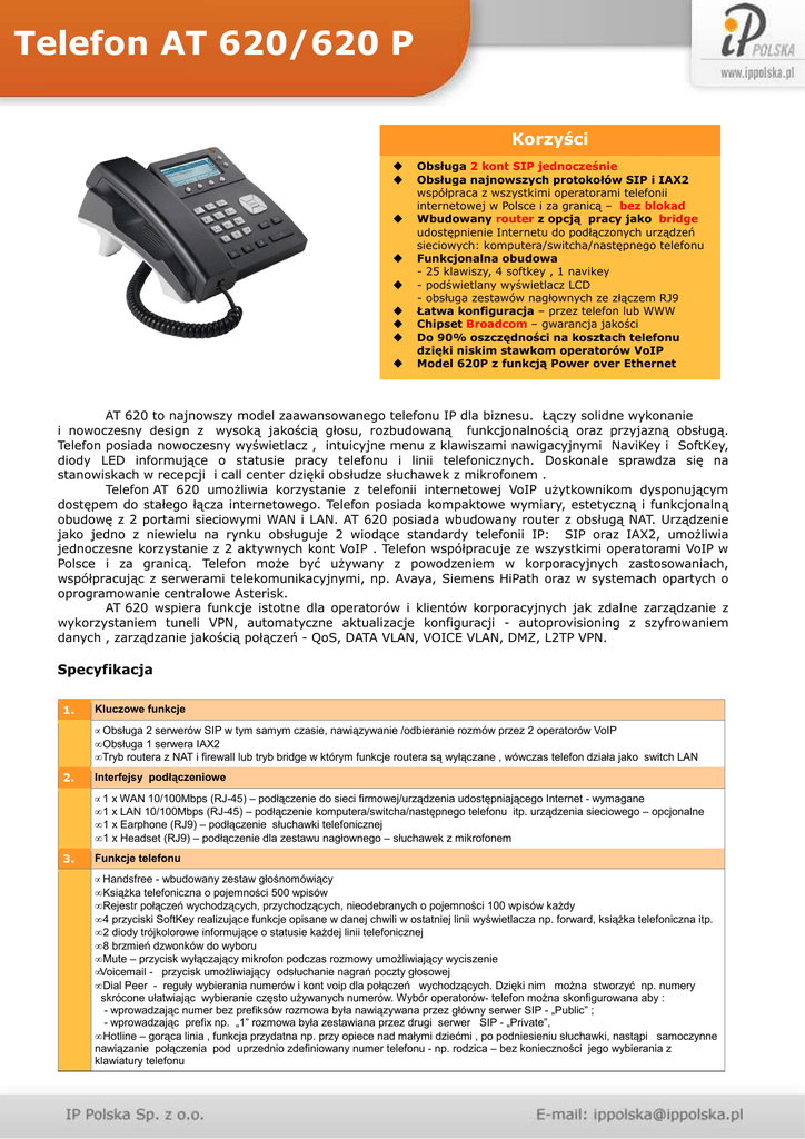 Telefon AT 620/620 P Korzyści Obsługa 2 kont SIP jednocześnie Obsługa najnowszych protokołów SIP i IAX2 współpraca z wszystkimi operatorami telefonii internetowej w Polsce i za granicą – bez blokad Wbudowany router z opcją pracy jako bridge udostępnienie Internetu do podłączonych urządzeń sieciowych: komputera/switcha/następnego telefonu Funkcjonalna obudowa - 25 klawiszy, 4 softkey , 1 navikey - podświetlany wyświetlacz LCD - obsługa zestawów nagłownych ze złączem RJ9 Łatwa konfiguracja – przez telefon lub WWW Chipset Broadcom – gwarancja jakości Do 90% oszczędności na kosztach telefonu dzięki niskim stawkom operatorów VoIP Model 620P z funkcją Power over Ethernet AT 620 to najnowszy model zaawansowanego telefonu IP dla biznesu. Łączy solidne wykonanie i nowoczesny design z wysoką jakością głosu, rozbudowaną funkcjonalnością oraz przyjazną obsługą. Telefon posiada nowoczesny wyświetlacz , intuicyjne menu z klawiszami nawigacyjnymi NaviKey i SoftKey, diody LED informujące o statusie pracy telefonu i linii telefonicznych. Doskonale sprawdza się na stanowiskach w recepcji i call center dzięki obsłudze słuchawek z mikrofonem . Telefon AT 620 umoŜliwia korzystanie z telefonii internetowej VoIP uŜytkownikom dysponującym dostępem do stałego łącza internetowego. Telefon posiada kompaktowe wymiary, estetyczną i funkcjonalną obudowę z 2 portami sieciowymi WAN i LAN. AT 620 posiada wbudowany router z obsługą NAT. Urządzenie jako jedno z niewielu na rynku obsługuje 2 wiodące standardy telefonii IP: SIP oraz IAX2, umoŜliwia jednoczesne korzystanie z 2 aktywnych kont VoIP . Telefon współpracuje ze wszystkimi operatorami VoIP w Polsce i za granicą. Telefon moŜe być uŜywany z powodzeniem w korporacyjnych zastosowaniach, współpracując z serwerami telekomunikacyjnymi, np. Avaya, Siemens HiPath oraz w systemach opartych o oprogramowanie centralowe Asterisk. AT 620 wspiera funkcje istotne dla operatorów i klientów korporacyjnych jak zdalne zarządzanie z wykorzystaniem tuneli VPN, automatyczne aktualizacje konfiguracji - autoprovisioning z szyfrowaniem danych , zarządzanie jakością połączeń - QoS, DATA VLAN, VOICE VLAN, DMZ, L2TP VPN. Specyfikacja 1. Kluczowe funkcje • Obsługa 2 serwerów SIP w tym samym czasie, nawiązywanie /odbieranie rozmów przez 2 operatorów VoIP • Obsługa 1 serwera IAX2 • Tryb routera z NAT i firewall lub tryb bridge w którym funkcje routera są wyłączane , wówczas telefon działa jako switch LAN 2. Interfejsy podłączeniowe • 1 x WAN 10/100Mbps (RJ-45) – podłączenie do sieci firmowej/urządzenia udostępniającego Internet - wymagane • 1 x LAN 10/100Mbps (RJ-45) – podłączenie komputera/switcha/następnego telefonu itp. urządzenia sieciowego – opcjonalne • 1 x Earphone (RJ9) – podłączenie słuchawki telefonicznej • 1 x Headset (RJ9) – podłączenie dla zestawu nagłownego – słuchawek z mikrofonem 3. Funkcje telefonu • Handsfree - wbudowany zestaw głośnomówiący • KsiąŜka telefoniczna o pojemności 500 wpisów • Rejestr połączeń wychodzących, przychodzących, nieodebranych o pojemności 100 wpisów kaŜdy • 4 przyciski SoftKey realizujące funkcje opisane w danej chwili w ostatniej linii wyświetlacza np. forward, ksiąŜka telefoniczna itp. • 2 diody trójkolorowe informujące o statusie kaŜdej linii telefonicznej • 8 brzmień dzwonków do wyboru • Mute – przycisk wyłączający mikrofon podczas rozmowy umoŜliwiający wyciszenie •Voicemail - przycisk umoŜliwiający odsłuchanie nagrań poczty głosowej • Dial Peer - reguły wybierania numerów i kont voip dla połączeń wychodzących. Dzięki nim moŜna stworzyć np. numery skrócone ułatwiając wybieranie często uŜywanych numerów. Wybór operatorów- telefon moŜna skonfigurowana aby : - wprowadzając numer bez prefiksów rozmowa była nawiązywana przez główny serwer SIP - „Public” ; - wprowadzając prefix np. „1” rozmowa była zestawiana przez drugi serwer SIP - „Private”, • Hotline – gorąca linia , funkcja przydatna np. przy opiece nad małymi dziećmi , po podniesieniu słuchawki, nastąpi samoczynne nawiązanie połączenia pod uprzednio zdefiniowany numer telefonu - np. rodzica – bez konieczności jego wybierania z klawiatury telefonu • Przekazy połączeń przychodzących na inny numer ( gdy mam zajętą linię , gdy nie odbieram, bezwarunkowe) • DND (Do not Disturb) ; Nie przeszkadzać - odrzucenie wszystkich połączeń przychodzących • Połączenia konferencyjne 3 stronne, połączenia oczekujące, • Identyfikacja numeru dzwoniącego – połączenia przychodzącego • Czarna lista numerów od których połączenia przychodzące będą automatycznie odrzucane (Black List) • Lista numerów zabronionych – połączenia wychodzące do nich są blokowane (Limited List) • Digital Map; definiowanie wzorców wprowadzania numerów telefonicznych (długości, prefiksy, opóźnienie wybrania numeru itp.) • Funkcja automatycznej sekretarki • Dzwonienie bez rejestracji na serwerze SIP , bezpośrednio na adresy IP innych telefonów w sieci • Obsługa wielu języków interfejsu www i menu telefonu 4. Funkcje głosowe • Obsługiwane kodeki głosowe: G.711(A-law/u-law-64K), G723.1-(6.3 kbps,5.3kbps),G722, G729 • VAD (Voice Activity Detection) –detekcja mowy, CNG (Comfort Noise Generator) – generator szumu; zapewniają komfort rozmów • AEC (Auto Echo Cancelation) sprzętowa redukcja echa (wg specyfikacji G168) • Sterowanie poziomem głośności dla dzwonków, słuchawki i osobno poziomem czułości dla mikrofonu • Ustawiany standard sygnalizacji dla róŜnych krajów ( dla Polski – UK) • DTMF – wybieranie tonowe i odtwarzanie zgodnie z ITU-T 5. Funkcje sieciowe • WAN : adresy statyczne IP, adresy dynamiczne IP klient DHCP, PPPoE (dla modemów kablowych ADSL -neostrada) • LAN: adresy statyczne IP, adresy dynami
