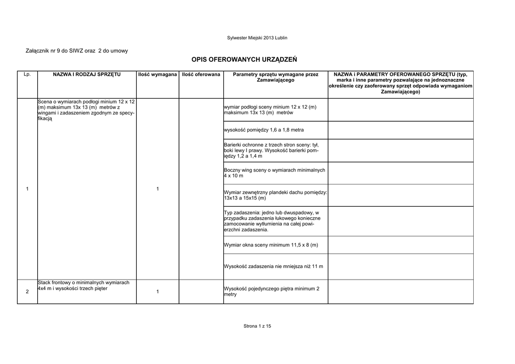 Sylwester Miejski 2013 Lublin Załącznik nr 9 do SIWZ oraz 2 do umowy OPIS OFEROWANYCH URZĄDZEŃ Lp. NAZWA I RODZAJ SPRZĘTU Ilość wymagana Scena o wymiarach podłogi minium 12 x 12 (m) maksimum 13x 13 (m) metrów z wingami i zadaszeniem zgodnym ze specyfikacją Ilość oferowana Parametry sprzętu wymagane przez Zamawiającego wymiar podłogi sceny minium 12 x 12 (m) maksimum 13x 13 (m) metrów wysokość pomiędzy 1,6 a 1,8 metra Barierki ochronne z trzech stron sceny: tył, boki lewy I prawy. Wysokość barierki pomiędzy 1,2 a 1,4 m Boczny wing sceny o wymiarach minimalnych 4 x 10 m 1 1 Wymiar zewnętrzny plandeki dachu pomiędzy: 13x13 a 15x15 (m) Typ zadaszenia: jedno lub dwuspadowy, w przypadku zadaszenia łukowego konieczne zamocowanie wytłumienia na całej powierzchni zadaszenia. Wymiar okna sceny minimum 11,5 x 8 (m) Wysokość zadaszenia nie mniejsza niż 11 m 2 Stack frontowy o minimalnych wymiarach 4x4 m i wysokości trzech pięter 1 Wysokość pojedynczego piętra minimum 2 metry Strona 1 z 15 NAZWA i PARAMETRY OFEROWANEGO SPRZĘTU (typ, marka i inne parametry pozwalające na jednoznaczne określenie czy zaoferowany sprzęt odpowiada wymaganiom Zamawiającego) Sylwester Miejski 2013 Lublin Konsoleta oświetleniowa Grand Ma 2 Full Size lub o parametrach równoważnych 3 wewnętrzne ekrany dotykowe TFT (15.4"WXGA) Wbudowany pomocniczy dotykowy ekran 9” 30 zmotoryzowanych, czułych na dotyk faderów 3 1 Wbudowany zasilacz awaryjny UPS. Możliwość liczenia 8192 parametrów Ruchoma podkładka pod nadgarstki tworząca zamknięcie szuflady na drobne akcesoria. Urządzenia typu ruchoma głowa spot z lampą wyładowczą o mocy co najmniej 700W - Martin Mac 700 lub o parametrach równoważnych Lampa 700W HTI System mieszania kolorów CMY Wymienne kolory na tarczy kolorów Tarcza gobo obrotowych Tarcza gobo nieobrotowych Zakres ruchu Pan / Tilt 540° / 240° Iris Focus 2m do nieskończoności System mieszania kolorów CMY 4 16 Zoom 14° - 30° Dimmer mechaniczny Tarcza kolorów Ilość kolorów na tarczy minimum 8 Obrotowa tarcza gobo Strona 2 z 15 4 16 Sylwester Miejski 2013 Lublin Gobo: spiral milkiway red/yellow fire water Iris System Pamięci Pozycji Tarcza animacji 5 Urządzenia typu ruchoma głowa wash w technologii LED RGB Mac 301/JB A7/Robe Robin 600 lub o parametrach równoważnych Wash w technologii LED RGB (dopuszczalne RGBW). 14 Zakres zoom 13°-30° Pan: 430° Tilt: 300° 6 Urządzenia typu ruchoma głowa beam Elation Rayzor Q7, Robe Led beam 100, fourlight FastONE, lub o parametrach równoważnych Beam angle nie większy niż 8° 8 Wysokość urządzenia nie większa niż 40 cm 7 Urządzenia typu ruchoma głowa beam Elation Rayzor Q7, Robe Led beam 100, fourlight FastONE, cp alpha beam 300 lub o parametrach równoważnych 6 Urządzenia typu ruchoma głowa beam, waga nie większa niż 20 kg ClayPaky Sharpy lub o parametrach równoważnych Beam angle nie większy niż 8° Wymienna tarcza 14 kolorów Wymienna tarcza 17 gobo Rotacyjny pryzmat Moc nie większa niż: 200W 8 26 Strona 3 z 15 Urządzenia typu ruchoma głowa beam, waga nie większa niż 20 kg ClayPaky Sharpy lub o parametrach równoważnych Sylwester Miejski 2013 Lublin - Temperatura barwowa: 8,000 K 8 26 - Strumień świetlny: 7,950 lm Zakres Zoom: 0 - 3.8° - PAN = 540°, TILT = 250° waga nie większa niż 20 kg Prędkość minimalna: - PAN = 2.40 sek. - TILT = 1.40 sek. 9 Ruchoma głowa typu wash – Mac 700 Wash, Robe Robin 800/1200, VariLite VLX WASH lub o parametrach równoważnych 9 Led par pro/arc paint/led par thomas lub o parametrach równoważnych 10 Zoom 15°-55° RGBW lub RGBA 30 IP 65 18x 3W LED 11 12 13 14 15 Blinder two light Blinder four light Urządzenie efektowe typu stroboskop ze źródłem światła o mocy nie mniejszej niż 3000W, sterowane w systemie DMX, Martin ATOMIC 3000 lub o parametrach równoważnych Spot HMI 1200 W Oświetlacz architektoniczny o mocy 2500 W Griven Kolorado 2500 lub o parametrach równoważnych 8 39 10 Moc minimum 3000 W, temperatura barwowa światła 5600 K 2 Moc minimum 1200 W Źródło światła HMI o mocy 2500 W 10 Moc światła minimum 240000 lux Maszyna do dymu ZR 33/ZR44 lub o parametrach równoważnych 16 Ilość dymu wypuszczanego przez maszynę: 1000 m³/min 6 Strona 4 z 15 Maszyna do dymu ZR 33/ZR44 lub o parametrach równoważnych Sylwester Miejski 2013 Lublin Grzałka o mocy 1500 W 16 6 Czas podgrzewania max 8 minut Sterowana za pomocą protokołu DMX512 AF -1 lub o parametrach równoważnych 17 Prędkość obrotowa od 0-2500 obr na minutę 6 Przepustowość minimalna: 1500 m3 powietrza na godzinę Sterowany za pomocą protokołu DMX512 18 Dimmer 12 kanałów 5 19 Oświetlenie banera na froncie sceny – światło żarowe 20 Okablowanie całego systemu oświetleniowego. 1 21 Rozdzielnia prądowa z odpowiednimi zabezpieczeniami umożliwiająca zasilanie dostarczonego nagłośnienia i oświetlenia. 1 22 Zawiesia, wyciągarki, elementy systemu zawieszeń oświetlenia itp. Moc pojedynczego kanału minimum 2,3 kW 1 kpl 1 kpl 23 Aliskafy, uchwyty elementy systemu mocowań oświetlenia itp. 1 kpl 24 Oświetlenie robocze schodów sceny i terenu backstage 1 kpl Strona 5 z 15 Sylwester Miejski 2013 Lublin 25 Oświetlenie robocze wingu bocznego 1 kpl Koło z kratownicy quadro średnica 3m 26 1 27 1/4 koła z kratownicy quadro o średnicy 10 m 2 28 1/4 koła z kratownicy quadro o średnicy 15 m 2 29 Kratownica quadro minimum 28x28 (cm) długość 5-6 m 2 30 Kratownica quadro minimum 28x28 (cm) długość 12-15 m 4 31 Kratownica quadro minimum 28x28 (cm) długość 3-5 m 2 32 Kratownica quadro minimum 28x28 (cm) długość 1 m 6 33 Kratownica quadro minimum 28x28 (cm) długość 0,5 m 6 34 Kratownica quadro minimum 28x28 (cm) długość 0,25 m 6 Kolumna głośnikowa szerokopasmowa - pasmo przenoszenia ±3dB: 80Hz-17 kHz - kąt promieniowania: H (-6dB) - 90°> 35 Minimum 16 - możliwość zawieszenia - fabrycznie atestowane zaczepy - maksymalny SPL minimum: 1