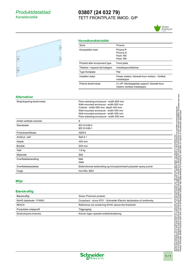 Produktdatablad 03807 (24 032 79) Karakteristikk TETT FRONTPLATE 9MOD. G/P Hovedkarakteristikk Prisma Kompatibel med Prisma P Prisma G Pack 160 Pack 160 Produkt eller komponent type Front plate Tilbehør / separat del kategori Installasjonstilbehør Type frontplate Flat Installert utstyr Power meters: kilowatt-hour meters - Vertikal installasjon Polene beskrivelse 2 x 4P: Montasjeplate support: kilowatt-hour meters Vertikal installasjon  Informasjonen i denne dokumentasjonen inneholder generelle beskrivelser og / eller tekniske egenskaper ved ytelsen til produktene heri. Denne dokumentasjonen er ikke tenkt som en erstatning for, og skal ikke brukes til avgjørelse for egnethet eller pålitelighet av disse produktene til spesifikke brukerapplikasjoner. Det er brukers eller integrators plikt til å foreta den nødvendige og fullstendige risikoanalyse, evaluering og utprøving av produkter med hensyn til den relevante spesifikke anvendelse eller bruk. Hverken Schneider Electric Industries SAS, eller noen av de tilknyttede selskaper eller datterselskaper er ansvarlig for, eller hefter for misbruk av inneværende opplysninger. Serie Alternativer Skap/kapsling beskrivelse Floor-standing enclosure - width 600 mm Wall-mounted enclosure - width 600 mm Cubicle - width 650 mm, depth 400 mm Wall-mounted enclosure - width 555 mm Wall-mounted enclosure - width 555 mm Floor-standing enclosure - width 555 mm Antall vertikale moduler 9 Standarder IEC 61439-2 IEC 61439-1 Produktsertifikater ASEFA Antall pr. sett Sett á 1 Høyde 450 mm Bredde 500 mm Vekt 1.8 kg Materiale Stål Overflatebehandling Matt Glatt Overflatebeskyttelse Elektroforese behandling og hot-polymerisert polyester epoxy pulver Farge Hvit RAL 9001 Miljø Bærekraftig Bærekraftig Green Premium produkt RoHS (datokode: YYWW) Compliant - since 0701 - Schneider Electric declaration of conformity REACh Reference not containing SVHC above the threshold Produktets miljøprofil Tilgjengelig Destruksjons-instruks Krever ingen spesiell avfallshåndtering 1/1