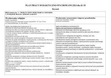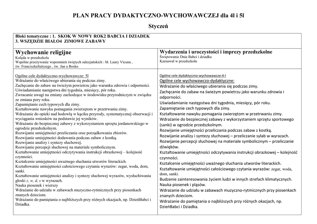 PLAN PRACY DYDAKTYCZNO-WYCHOWAWCZEJ dla 4l i 5l Styczeń Bloki tematyczne : 1. SKOK W NOWY ROK2 BABCIA I DZIADEK 3. WSZĘDZIE BIAŁO4 ZIMOWE ZABAWY Wychowanie religijne Wydarzenia i uroczystości i imprezy przedszkolne Kolęda w przedszkolu Wspólne przeżywanie wspomnień świętych salezjańskich : bł. Laury Vicuna , św. FranciszkaSalezego , św. Jan a Bosko Świętowanie Dnia Babci i dziadka Karnawał w przedszkolu Ogólne cele dydaktyczno-wychowawcze: 5l Wdrażanie do właściwego ubierania się podczas zimy. Zachęcanie do zabaw na świeżym powietrzu jako warunku zdrowia i odporności. Uświadamianie następstwa dni tygodnia, miesięcy, pór roku. Zwracanie uwagi na zmiany zachodzące w środowisku przyrodniczym w związku ze zmiana pory roku. Zapamiętanie cech typowych dla zimy. Kształtowanie nawyku pomagania zwierzętom w przetrwaniu zimy. Wdrażanie do opieki nad hodowlą w kąciku przyrody, systematycznej obserwacji i wyciągania wniosków na podstawie jej wyników. Wdrażanie do bezpiecznej zabawy z wykorzystaniem sprzętu jordanowskiego w ogrodzie przedszkolnym. Rozwijanie umiejętności przeliczania oraz porządkowania zbiorów. Rozwijanie umiejętności dodawania podczas zabaw z kostką. Rozwijanie analizy i syntezy słuchowej. Rozwijanie percepcji słuchowej na materiale symbolicznym. Kształtowanie umiejętności odczytywania instrukcji obrazkowej – kolejność czynności. Kształcenie umiejętności uważnego słuchania utworów literackich. Kształtowanie umiejętności całościowego czytania wyrazów: zegar, woda, dom, sanki. Kształtowanie umiejętności analizy i syntezy słuchowej wyrazów, wysłuchiwania głoski z, w, d, s w wyrazach. Nauka piosenek i wierszy Wdrażanie do udziału w zabawach muzyczno-rytmicznych przy piosenkach znanych dzieciom. Wdrażanie do pamiętania o najbliższych przy różnych okazjach, np. DzieńBabci i Dziadka. Ogólne cele dydaktyczno-wychowawcze:4-l Ogólne cele wychowawczo-dydaktyczne: Wdrażanie do właściwego ubierania się podczas zimy. Zachęcanie do zabaw na świeżym powietrzu jako warunku zdrowia i odporności. Uświadamianie następstwa dni tygodnia, miesięcy, pór roku. Zapamiętanie cech typowych dla zimy. Kształtowanie nawyku pomagania zwierzętom w przetrwaniu zimy. Wdrażanie do bezpiecznej zabawy z wykorzystaniem sprzętu sportowego (sanki) w ogrodzie przedszkolnym. Rozwijanie umiejętności przeliczania podczas zabaw z kostką. Rozwijanie analizy i syntezy słuchowej – przeliczanie sylab w wyrazach. Rozwijanie percepcji słuchowej na materiale symbolicznym – przeliczanie dźwięków. Kształtowanie umiejętności odczytywania instrukcji obrazkowej – kolejność czynności. Kształcenie umiejętności uważnego słuchania utworów literackich. Kształtowanie umiejętności całościowego czytania wyrazów: zegar, woda, dom, sanki. Budzenie zainteresowania życiem ludzi w innych strefach klimatycznych. Nauka piosenek i pląsów. Wdrażanie do udziału w zabawach muzyczno-rytmicznych przy piosenkach znanych dzieciom. Wdrażanie do pamiętania o najbliższych przy różnych okazjach, np. DzieńBabci i Dziadka.