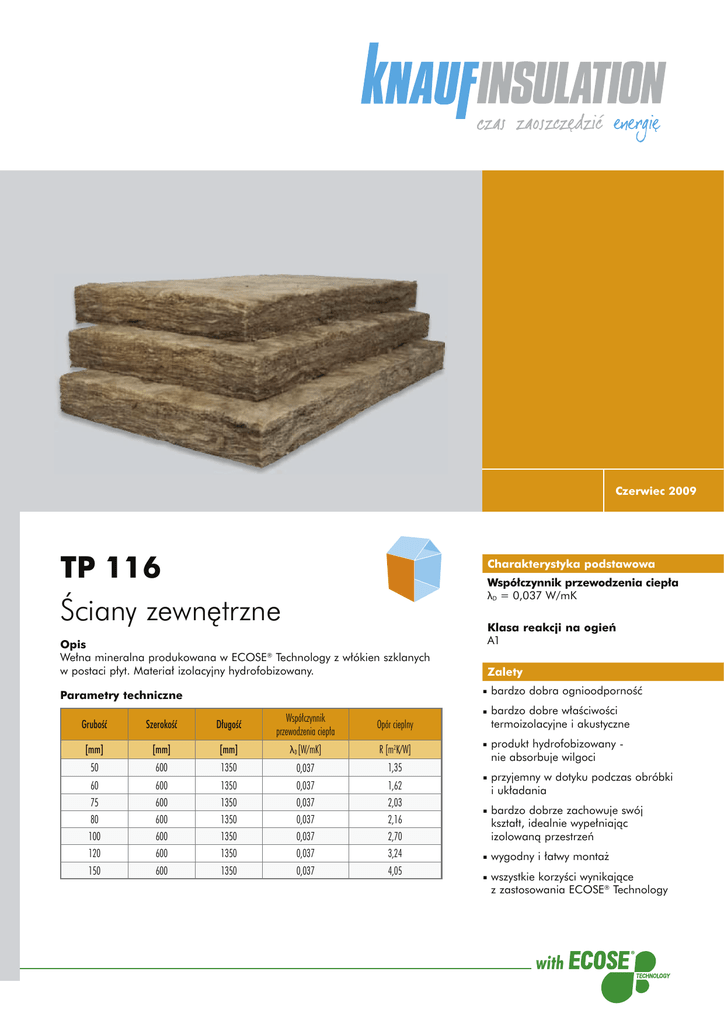 Czerwiec 2009 TP 116 Ściany zewnętrzne Charakterystyka podstawowa Współczynnik przewodzenia ciepła λD = 0,037 W/mK Opis Wełna mineralna produkowana w ECOSE® Technology z włókien szklanych w postaci płyt. Materiał izolacyjny hydrofobizowany. Klasa reakcji na ogień A1 Zalety bardzo dobra ognioodporność Parametry techniczne bardzo dobre właściwości termoizolacyjne i akustyczne Grubość Szerokość Długość Współczynnik przewodzenia ciepła Opór cieplny [mm] [mm] [mm] λD [W/mK] R [m2K/W] 50 600 1350 0,037 1,35 60 600 1350 0,037 1,62 75 600 1350 0,037 2,03 80 600 1350 0,037 2,16 100 600 1350 0,037 2,70 bardzo dobrze zachowuje swój kształt, idealnie wypełniając izolowaną przestrzeń 120 600 1350 0,037 3,24 wygodny i łatwy montaż 150 600 1350 0,037 4,05 produkt hydrofobizowany nie absorbuje wilgoci przyjemny w dotyku podczas obróbki i układania wszystkie korzyści wynikające z zastosowania ECOSE® Technology TP 116 Parametry techniczne Deklarowany współczynnik przewodzenia ciepła Klasa reakcji na ogień Klasa tolerancji grubości Wytrzymałość na rozciąganie Oporność właściwa przepływu powietrza Nasiąkliwość wodą przy krótkotrwałym zanurzeniu Nasiąkliwość wodą przy długotrwałym częściowym zanurzeniu Współczynnik oporu dyfuzyjnego Kod oznaczenia CE Symbol Wartość Norma λD 0,037 W/mK EN 12 667, EN 12 939 – – – AFr A1 T4 > dwukrotny ciężar 5,0 kPa.s/m2 EN 13 501-1 EN 823 – EN 29 053 Wp < 1kg/m2 EN 1609 Wlp < 3kg/m2 EN 12 087 µ – 1 MW-EN 13162-T4-WS-WL(P)-AFr5 EN 12 086 EN 13162 MW-EN 13162-T2-WS-WL(P) – 001-BK-511-3338-0009-KOOM – Certyfikat zgodności EC Keymark certyfikat Zastosowanie Płyty z wełny mineralnej TP 116 produkowane są w ECOSE® Technology z włókien szklanych. Jest to materiał przeznaczony do izolacji ścian zewnętrznych. Główne zastosowanie jako izolacja cieplna i akustyczna w konstrukcjach ścian z elewacją wentylowaną, lekkie obudowy hal (ściany kasetowe) oraz jako izolacja na ruszcie ścian zewnętrznych od strony wewnętrznej. Może być stosowana też jako izolacja stropów belkowych. Od strony zewnętrznej w przypadku elewacji wentylowanych zaleca się ułożenie witroizolacji w celu eliminacji przewiewania izolacji przez wiatr. W układach izolacji ścian zewnętrznych od strony wewnętrznej należy na termoizolacji ułożyć paroizolację zabezpieczającą przegrodę przed wilgocią kondensacyjną. W przypadku ścian metalowych kasetowych funkcję bariery paroszczelnej spełnia wewnętrzna okładzina metalowa. Materiał można stosować także w konstrukcjach poziomych (np. stropy drewniane gęstożebrowe, konstrukcje szkieletowo-ryglowe lub szkieletowe) jako izolację termicz- KI-DS/TP116/PL-090701 ną i akustyczną układaną między belkami stropów międzykondygnacyjnych. Nad pomieszczeniami o wysokim ciśnieniu pary wodnej ( np. podwyższonej temperaturze lub dużej wilgotności względnej) należy stosować folię paroizolacyjną zabezpieczającą materiał izolacyjny przed trwałym zawilgoceniem. Opakowanie Płyty TP 116 pakowane są w paczkach. Opakowanie zbiorcze zabezpieczone jest folią PE. Opakowanie ochronne jest opatrzone logiem producenta i kartą produktu, w której podano podstawowe parametry techniczne wyrobu oraz zalecany podstawowy sposób jego zastosowania. Naturalna wełna mineralna w ECOSE® Technology to wełna mineralna nowej generacji. Innowacyjna wełna mineralna firmy Knauf Insulation jest produkowana z naturalnie występujących i/lub wtórnych surowców przy wykorzystaniu biotechnologii łączenia włókien bazującej na naturalnych komponentach, wolnej od formaldehydu, fenolu i akrylu, bez dodatku sztucznych barwników oraz substancji rozjaśniających. Dzięki zastosowaniu innowacyjnej substancji spajającej nowa wełna mineralna firmy Knauf Insulation w ECOSE® Technology ma naturalnie brązowy kolor - jest wolna od jakichkolwiek chemicznych barwników Knauf Insulation Sp. z o.o. ul. 17 Stycznia 56 02-146 Warszawa Tel.: +48 22 369 59 00 Faks: +48 22 369 59 10 E-mail: [email protected] Dział Obsługi Klienta Tel.: +48 22 369 59 19 Tel.: +48 22 369 59 20 Tel.: +48 22 369 59 21 Faks: +48 22 369 59 22 E-mail: [email protected] Jakość Knauf Insulation posiada certyfikat jakości dla zintegrowanego systemu zarządzania według norm ISO 9001:2008, EN ISO 14001:2004 oraz OHSAS 18001:2007. Podczas produkcji niniejszego wyrobu nie dochodzi do przekroczenia limitów emisji, które znajdują się pod szczegółową kontrolą działu jakości Knauf Insulation. www.knaufinsulation.pl