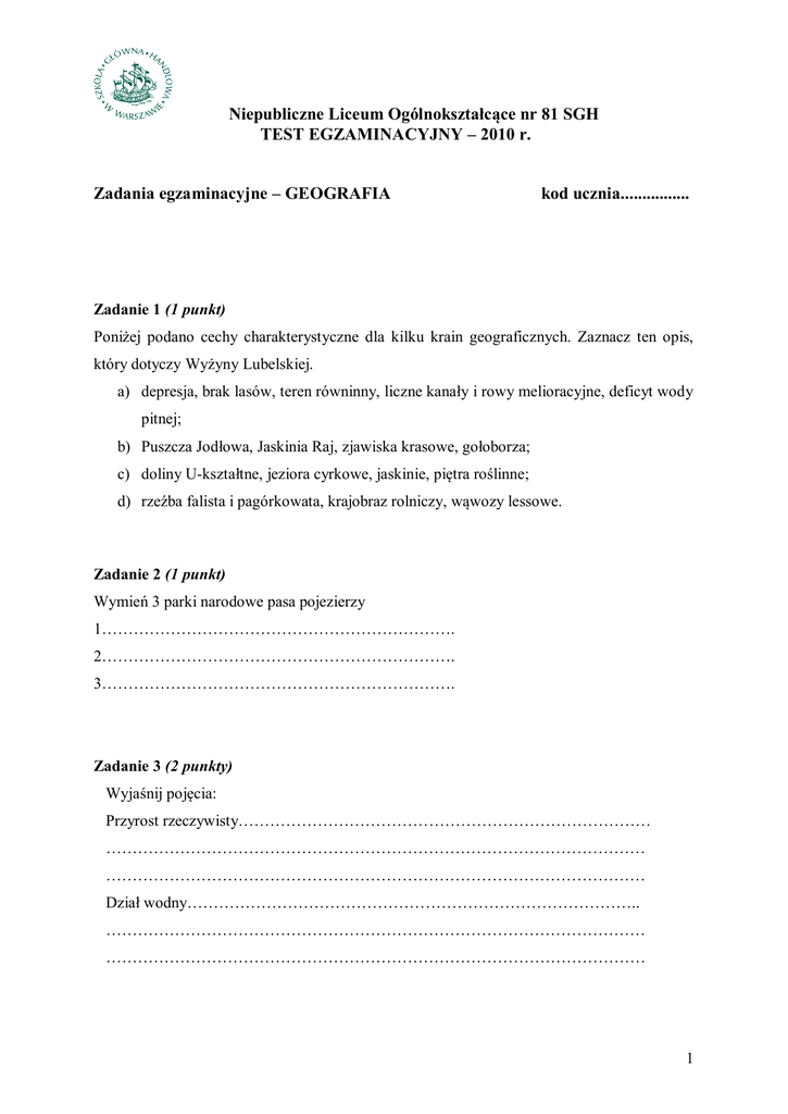 Niepubliczne Liceum Ogólnokształcące nr 81 SGH TEST EGZAMINACYJNY – 2010 r. Zadania egzaminacyjne – GEOGRAFIA kod ucznia................ Zadanie 1 (1 punkt) Poniżej podano cechy charakterystyczne dla kilku krain geograficznych. Zaznacz ten opis, który dotyczy Wyżyny Lubelskiej. a) depresja, brak lasów, teren równinny, liczne kanały i rowy melioracyjne, deficyt wody pitnej; b) Puszcza Jodłowa, Jaskinia Raj, zjawiska krasowe, gołoborza; c) doliny U-kształtne, jeziora cyrkowe, jaskinie, piętra roślinne; d) rzeźba falista i pagórkowata, krajobraz rolniczy, wąwozy lessowe. Zadanie 2 (1 punkt) Wymień 3 parki narodowe pasa pojezierzy 1…………………………………………………………. 2…………………………………………………………. 3…………………………………………………………. Zadanie 3 (2 punkty) Wyjaśnij pojęcia: Przyrost rzeczywisty…………………………………………………………………… ………………………………………………………………………………………… ………………………………………………………………………………………… Dział wodny………………………………………………………………………….. ………………………………………………………………………………………… ………………………………………………………………………………………… 1 Zadanie 4 (2 punkty) Podaj nazwę kraju, na terytorium którego położone są: Płw. Labrador………………………………………………………………………………… Appalachy……………………………………………………………………………………… Rzeka Murray-Darling……………………………………………………………………….. Jezioro Bajkał………………………………………………………………………………….. Płw. Krym…………………………………………………………………………………….. Zadanie 5 (2 punkty) Podaj nazwy zaznaczonych krajów i ich stolice kraj stolica 1 2 3 4 5 2 Zadanie 6 (1 punkt) Które z podanych form są charakterystyczne dla Pojezierza Mazurskiego? Formy: Wąwozy lessowe, jaskinie, moreny czołowe, doliny U-kształtne, wietrzenie mrozowe, drumliny, jeziora morenowe, jeziora rynnowe Charakterystyczne formy Pojezierza Mazurskiego: ……………………………………………………………………………………………. Zadanie 7 (1 punkty) Podaj nazwy zaznaczonych półwyspów Lp. półwyspy 1 2 3 4 3 Zadanie 8 (1 punkt) Podaj nazwy miast wojewódzkich w następujących województwach: 1. Wielkopolskie………………………………………………………... 2. Warmińsko-mazurskie………………………………………………. 3. Dolnośląskie………………………………………………………….. 4. Pomorskie……………………………………………………………. Zadanie 9 (1 punkt) Zaznacz na mapie województwa wymienione w punkcie (wpisz odpowiednią cyfrę) Zadanie 10 (1 punkty) Podaj nazwy obiektów geograficznych na podstawie krótkiego opisu: 1. Na tym półwyspie położone są m. in. Wietnam, Laos, Kambodża ……………………………………………………………………………………………… 2. Na tym półwyspie położone są m. in. Oman, Jemen, Zjednoczone Emiraty Arabskie: ……………………………………………………………………………………………… 3. Jest to największa zatoka na Morzu Bałtyckim …………………………………………………………………………………………… 4 Zadanie 11 (1 punkt) Na mapie zaznaczono cztery polskie miasta. Podkreśl nazwę miasta, w którym słońce góruje najwcześniej a) Gdańsk b) Poznań c) Kraków d) Lublin Zadanie 12 (1 punkt) Wyjaśnij, z jakiego powodu wraz ze wzrostem poziomu rozwoju gospodarczego państw rośnie rola usług w tych krajach? 1. ............................................................................................................................................. ............................................................................................................................................. ............................................................................................................................................. 2. ............................................................................................................................................. ............................................................................................................................................. ............................................................................................................................................ 5 Zadanie 13 (1 punkt) Rysunek przedstawia oświetlenie Ziemi w dniu przesilenia letniego. Podkreśl zdanie opisujące to przesilenie. a) Słońce góruje w zenicie nad zwrotnikiem Raka. Na półkuli północnej rozpoczyna się zima, a na półkuli południowej lato; b) Słońce góruje w zenicie nad zwrotnikiem Koziorożca. Na półkuli północnej rozpoczyna się lato, na półkuli południowej zima; c) Słońce góruje w zenicie nad zwrotnikiem Raka. Na biegunie północnym jest dzień polarny, a na biegunie południowym – noc polarna; d) Słońce góruje w zenicie nad zwrotnikiem Koziorożca. Na biegunie południowym panuje dzień polarny, a na biegunie północnym – noc polarna. Zadanie 14 (1 punkt) 1. Odległość między miastami A i B wynosi 50 kilometrów. Oblicz odległość pomiędzy tymi miastami na mapie w skali 1: 125 000. Miejsce na obliczenia Wynik…………………………………………………………………………………………… 6 Zadan