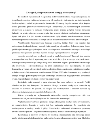 Z czego (i jak) produkować energię elektryczną? Po ostatnich wydarzeniach w japońskiej elektrowni Fukushima rozgorzała dyskusja na temat bezpieczeństwa elektrowni atomowych. Ich zwolennicy twierdzą, że jest to technologia bardzo wydajna, tania i bezpieczna dla środowiska. Ekolodzy i społeczeństwa wielu krajów świata protestują przeciwko budowie nowych i eksploatacji już wybudowanych elektrowni atomowych, ponieważ w sytuacji wystąpienia awarii istnieje potężne ryzyko narażenia ludności na utratę zdrowia, a nawet życia, jak również skażenia środowiska naturalnego. Pytają oni gdzie i w jaki sposób przechowywane będą odpady promieniotwórcze. Można również napotkać stwierdzenia, iż nastąpi dalsze uzależnienie surowcowe od państw obcych. Współcześnie funkcjonowanie każdego państwa, każdej firmy oraz rodziny bez zabezpieczenia ciągłej dostawy energii elektrycznej jest niemożliwe. Jednak czytając liczne publikacje i obserwując dyskusje na temat oddziaływania na środowisko różnych technologii produkcji elektryczności powstaje pytanie: z czego (i jak) produkować energię? A może pozostać przy produkcji energii z węgla kamiennego? Przecież jego zasoby w naszym kraju są duże i wystarczą jeszcze na wiele lat, a jest to energia relatywnie tania. Jednak produkcja ta skutkuje emisją dużej ilości dwutlenku węgla – gazu bardzo szkodliwego dla środowiska i odpowiedzialnego za efekt cieplarniany. Nie zapominajmy, że Unia Europejska wymaga od wszystkich państw członkowskich ograniczenia emisji tego związku: w Polsce emisja CO2 ma zostać zredukowana o 20% do 2020 roku. Pozostając przy produkcji energii z węgla potrzebujemy nowych technologii spalania lub magazynowania dwutlenku węgla. Ale jaki będzie ich koszt i wpływ na środowisko? Produkcja elektryczności z gazu ziemnego lub ropy naftowej w sytuacji Polski również nie jest zbyt korzystna. Po pierwsze dlatego, że nasze zasoby tych surowców są znikome w stosunku do potrzeb. Po drugie, ich wydobywanie i transport również są obarczone dużym ryzykiem zagrożeń ekologicznych. Zatem pozostają do wykorzystania odnawialne zasoby energetyczne. Ale czy zastosowanie ich jest bardziej bezpieczne dla środowiska naturalnego? Wykorzystanie wiatru do produkcji energii elektrycznej ma tyle samo zwolenników, co przeciwników. Energia z wiatru jest bez wątpienia najtańsza. Jej produkcja nie zanieczyszcza atmosfery, wody i gleby. Przeciwnicy elektrowni wiatrowych podnoszą kwestie ochrony ptaków i krajobrazu oraz dużej emisji hałasu i fal elektromagnetycznych. Korzystanie z zasobów wodnych do produkcji elektryczności nie powoduje emisji gazów cieplarnianych, jednak nie jest całkowicie obojętne dla naszego środowiska. Ekolodzy alarmują, że budowa elektrowni wodnych zaburza ekosystemy wodne i zniekształca naturalny bieg rzek. Turbiny wodne pracują bardzo głośno. To wszystko ma negatywny wpływ na organizmy żyjące w wodzie. Energię elektryczną oraz energię cieplną możemy uzyskać z promieniowania słonecznego. Energia słoneczna jest czysta i ekologiczna. Technologia ta również nie przyczynia się do emisji gazów cieplarnianych i hałasu. Bez wątpienia największą jej zaletą jest łatwa dostępność. W naszych warunkach geograficznych nasłonecznienie nie jest duże i występują jego wahania w ciągu doby oraz w ciągu roku, dlatego też niezbędne jest magazynowanie energii słonecznej. Mimo wielu pozytywów tej technologii, jej przeciwnicy dopatrzyli się nieścisłości. Okazuje się, że podczas produkcji baterii słonecznych wykorzystywane są toksyczne związki chemiczne, a panele zawierają metale ciężkie. W związku z tym przewiduje się niekorzystny wpływ na środowisko ich utylizacji po zakończeniu eksploatacji. Zasoby energii geotermalnej są praktycznie nieograniczone. Jednak aby wody podziemne móc wykorzystać do produkcji energii elektrycznej potrzeba ich wysokich temperatur oraz niskiej mineralizacji. Na obszarze naszego kraju nie ma zbyt dużo takich źródeł. Poza tym, przeciwnicy tej metody wskazują na fakt, że podczas prowadzenia prac poszukiwawczych dochodzi do emisji szkodliwych związków i wówczas może zachodzić skażenie wód występujących pod powierzchnią Ziemi. W takim razie pozostają do wykorzystania jeszcze zasoby biomasy. Biomasa to stałe lub ciekłe substancje pochodzenia roślinnego lub zwierzęcego ulegające biodegradacji, pozostałości z produkcji rolnej i z leśnictwa oraz odpady przemysłowe i komunalne. Mogą być one poddawane procesowi spalania, zgazowywania lub „fermentacji metanowej”, w wyniku czego uzyskuje się energię elektryczną oraz cieplną. Największą zaletą biomasy jest zerowy bilans emisji dwutlenku węgla, uwalnianego podczas jej spalania. Zasoby biomasy są odtwarzalne oraz dostępne na całym świecie. Jako źródło elektryczności biomasa jest mniej zawodna niż energia z wiatru czy energia słoneczna. Jej zasoby mogą być gromadzone i użytkowane w zależności od potrzeb. Transport i magazynowanie biomasy nie pociąga za sobą takich zagrożeń dla środowiska naturalnego, jak transport i magazynowanie ropy naftowej czy gazu ziemnego. Niestety i ta technologia ma pewne słabe strony. Otóż podczas spalania materii organicznej (białka i tłuszcze) do atmosfery dostają się szkodliwe związki, miedzy innymi siarki. Wadą biomasy może być jej duża wilgotność i niska wartość energetyczna w stosunku do masy lub objętości. Przeciwnicy tego surowca energetycznego zwracają uwagę również na zły wpływ wieloletnich upraw energetycznych na ekosystem oraz obawiają się wzrostu cen żywności. Z powyższych rozważań wynika więc, że nie ma ani jednego zasobu energetycznego, ani jednej technologii wytwarzania energii elektrycznej, całkowicie nieszkodliwych dla środowiska naturalnego. Każda działalność produkcyjna człowieka wiąże się z oddziaływaniem na ś