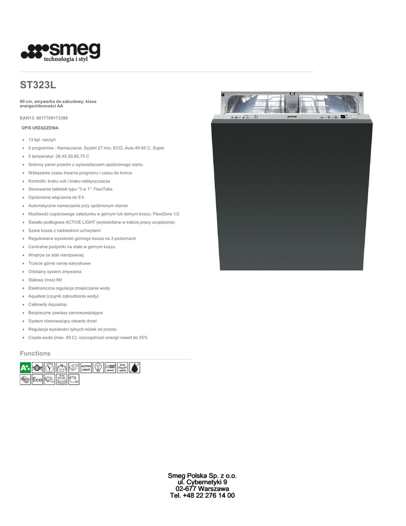 ST323L 60 cm, zmywarka do zabudowy, klasa energochłonności AA EAN13: 8017709173388 OPIS URZĄDZENIA 13 kpl. naczyń 5 programów : Namaczanie, Szybki 27 min, ECO, Auto 45-65 C, Super 5 temperatur: 38,45,50,65,75 C Srebrny panel przedni z wyświetlaczem opóźnionego startu Wskazanie czasu trwania programu i czasu do końca Kontrolki: braku soli i braku nabłyszczacza Stosowanie tabletek typu "3 w 1": FlexiTabs Opóźnienie włączenia do 9 h Automatyczne namaczanie przy opóźnionym starcie Możliwość częściowego załadunku w górnym lub dolnym koszu: FlexiZone 1/2 Światło podłogowe ACTIVE LIGHT (wyświetlane w trakcie pracy urządzenia) Szare kosze z niebieskimi uchwytami Regulowana wysokość górnego kosza na 3 poziomach Centralne podpórki na stałe w górnym koszu Wnętrze ze stali nierdzewnej Trzecie górne ramię natryskowe Orbitalny system zmywania Stalowy (inox) filtr Elektroniczna regulacja zmiękczania wody Aquatest (czujnik zabrudzenia wody) Całkowity Aquastop Bezpieczne zawiasy samowyważające System równoważący otwarte drzwi Regulacja wysokości tylnych nóżek od przodu Ciepła woda (max. 60 C): oszczędność energii nawet do 35% Functions Smeg Polska Sp. z o.o. ul. Cybernetyki 9 02-677 Warszawa Tel. +48 22 276 14 00 ST323L do zabudowy z panelem ukrytym 60 cm A++: Zmywarki, chłodziarki, pralki w klasie A ++ zużywają do 20% mniej energii w stosunku do urządzeń należących do klasy A. Urządzenia tej klasy gwarantują zmniejszone zużycie energii, maksymalną efektywność energetyczną i poszanowanie dla środowiska naturalnego. MAKSYMALNY ZAŁADUNEK: Załadunek od 7 do 14 kompletów w zależności od modelu. OPÓŹNIONY START: Opóźniony start do 24h. Naczynia, które oczekują na włączenie się zmywarki są automatycznie namaczane. FLEXIZONE ½ ZAŁADUNKU: Ta opcja umożliwia zmywanie połowy załadunku. Niewielką ilość sprzętów i naczyń kuchennych, umieszczamy w dowolnym koszu, co pozwala zaoszczędzić energię, wodę i skraca czas zmywania. OPCJA TABLETEK: Opcja, która maksymalnie ułatwia korzystanie z urządzenia. ACTIVE LIGHT: Najwyższe modele puszczaj wiązkę światła na podłogę podczas pracy, dzięki czemu wiemy że zmywarki nie należy jeszcze otwierać. OPTCJA ENERSAVE: Specjalny system, który zwiększa efektywność energetyczna zmywarki, poprzez automatyczne otwarcie drzwi zmywarki. Część procesu suszenia odbywa się przy otwartych drzwiach. AQUATEST: Czujnik zabrudzenia wody, który sprawdza jej jakość przed każdym zmywaniem. Dzięki temu zmywanie zawsze następuje do czysta i minimalnym zużyciu wody i energii. PODŁĄCZENIE CIEPŁEJ I ZIMNEJ WODY: Wiele modeli Smeg daje możliwość podłączenia do ciepłej i zimnej wody (maksymalna temperatura wody 60 ° C). Dzięki temu zużywamy mniej energii i skracamy czas zmywania. ROMPI-GOCCIA: Niektóre modele zmywarek są wyposażone w specjalne polimerowe dysze RompiGoccia, które poprawiają proces suszenia poprzez kierowanie kropli wody wewnątrz urządzenia. PŁUKANIE: Płukanie w zimnej wodzie. PROGRAM ECO: Program redukujący zużycie wody i energii, do mniej zabrudzonych naczyń. PROGRAM SZYBKI 27 MIN: Szybki program mycia bez suszenia. Auto 45°- 65°: Program do mycia normalnie zabrudzonej zastawy stołowej . Dzięki automatycznemu czujnikowi Aquatest , optymalizuje podstawowe parametry , takie jak czas zmywania, temperatura i pobór wody. PROGRAM SUPER: Do bardzo brudnych naczyń, usuwa zaschnięte resztki jedzenia. Smeg Polska Sp. z o.o. ul. Cybernetyki 9 02-677 Warszawa Tel. +48 22 276 14 00 ST323L do zabudowy z panelem ukrytym 60 cm Smeg Polska Sp. z o.o. ul. Cybernetyki 9 02-677 Warszawa Tel. +48 22 276 14 00