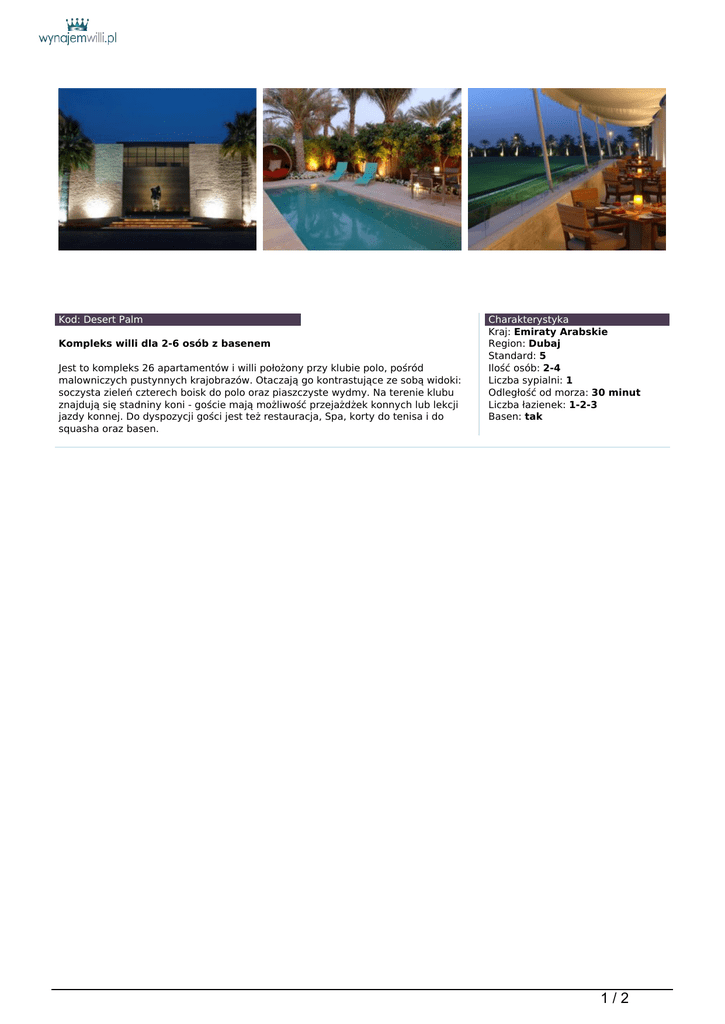 Kod: Desert Palm Kompleks willi dla 2-6 osób z basenem Jest to kompleks 26 apartamentów i willi położony przy klubie polo, pośród malowniczych pustynnych krajobrazów. Otaczają go kontrastujące ze sobą widoki: soczysta zieleń czterech boisk do polo oraz piaszczyste wydmy. Na terenie klubu znajdują się stadniny koni - goście mają możliwość przejażdżek konnych lub lekcji jazdy konnej. Do dyspozycji gości jest też restauracja, Spa, korty do tenisa i do squasha oraz basen. Charakterystyka Kraj: Emiraty Arabskie Region: Dubaj Standard: 5 Ilość osób: 2-4 Liczba sypialni: 1 Odległość od morza: 30 minut Liczba łazienek: 1-2-3 Basen: tak 1/2 Zakwaterowanie: Pool Villas - 4 wille, każda o powierzchni 198 m2, z jedną sypialnią z łazienką, przestronnym salonem połączonym z jadalnią, tarasem oraz prywatnym basenem 2,6 x 8m i prysznicem zewnętrznym. Wille wyposażono w klimatyzację, bar, ekspres do kawy, sejf, telefon, bezprzewodowy Internet, telewizor plazmowy 40", system stereo Bang & Olufsen, odtwarzacz CD/DVD, iPod. Pool Residences - 10 willi o powierzchni 528 m2 z dwiema sypialniami, otoczonych prywatnym ogrodem z basenem 4 x 8m, tarasem ze stołem do posiłków al fresco i patio do opalania. Całość ogrodzona jest prawie trzymetrowym parkanem gwarantującym kameralną atmosferę. Oprócz 2 sypialni wille mieszczą też gabinet, który na życzenie można zamienić w trzecią sypialnię, przestronny salon, w pełni wyposażoną kuchnię, trzy luksusowo urządzone łazienki. Wille wyposażono w klimatyzację, telefon, Internet bezprzewodowy, telewizor plazmowy 46 ", system stereo Bang & Olufsen, odtwarzacz CD/DVD, iPod. Villa Layali - prezydencka willa o powierzchni 585 m2 z dwiema sypialniami. W centralnej części znajduje się duże patio z prywatnym basenem 3,6 x 8m. Do dyspozycji gości jest duży salon z jadalnią wyposażony w system stereo Bang & Olufsen oraz telewizor LCD 52". Obie sypialnie posiadają prywatne ogrody, telewizor z odtwarzaczem CD/DVD, iPod, garderobę i łazienkę. Na dachu mieści się prywatny taras idealny do oglądania rozgrywek polo i zachodów słońca. Lokalizacja: Dubaj, 30 minut od międzynarodowego lotniska w Dubaju, 30 minut od plaży Jumeirah. Cena za tydzień wynajmu: 2/2 Powered by TCPDF (www.tcpdf.org)