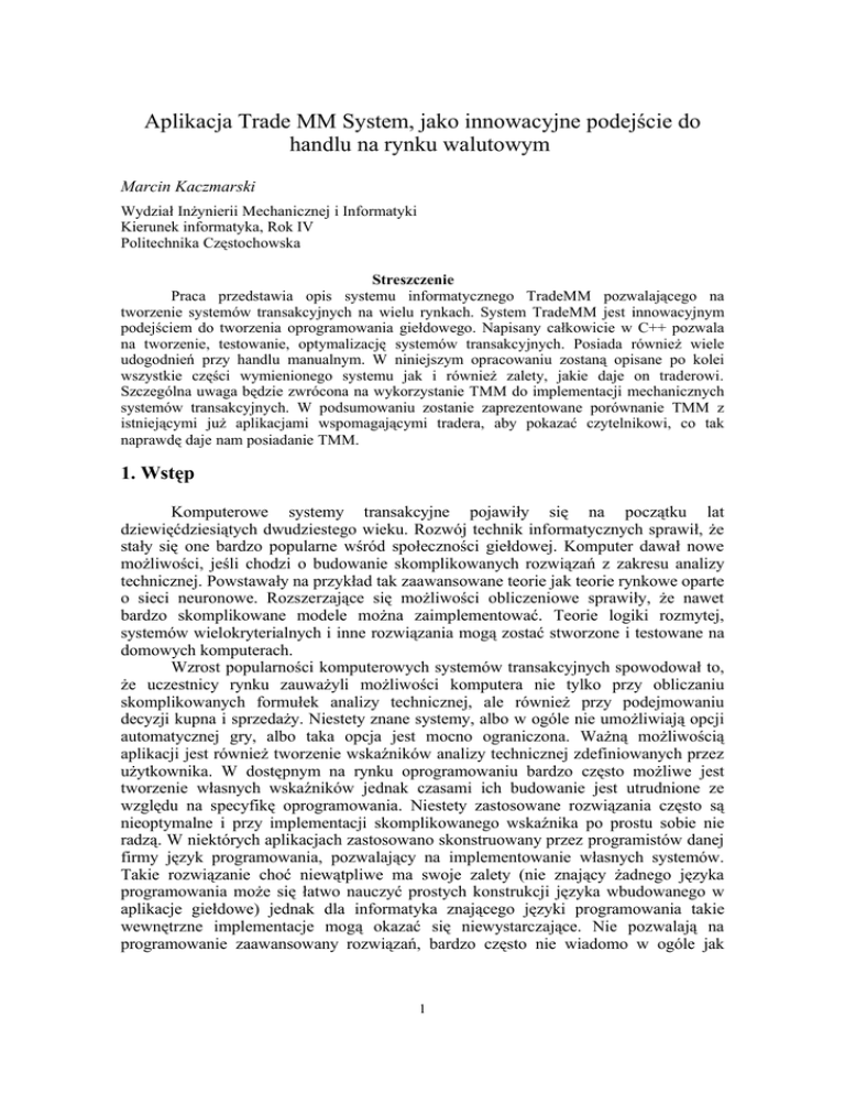 Aplikacja Trade MM System, jako innowacyjne podejście do handlu na rynku walutowym Marcin Kaczmarski Wydział Inżynierii Mechanicznej i Informatyki Kierunek informatyka, Rok IV Politechnika Częstochowska Streszczenie Praca przedstawia opis systemu informatycznego TradeMM pozwalającego na tworzenie systemów transakcyjnych na wielu rynkach. System TradeMM jest innowacyjnym podejściem do tworzenia oprogramowania giełdowego. Napisany całkowicie w C++ pozwala na tworzenie, testowanie, optymalizację systemów transakcyjnych. Posiada również wiele udogodnień przy handlu manualnym. W niniejszym opracowaniu zostaną opisane po kolei wszystkie części wymienionego systemu jak i również zalety, jakie daje on traderowi. Szczególna uwaga będzie zwrócona na wykorzystanie TMM do implementacji mechanicznych systemów transakcyjnych. W podsumowaniu zostanie zaprezentowane porównanie TMM z istniejącymi już aplikacjami wspomagającymi tradera, aby pokazać czytelnikowi, co tak naprawdę daje nam posiadanie TMM. 1. Wstęp Komputerowe systemy transakcyjne pojawiły się na początku lat dziewięćdziesiątych dwudziestego wieku. Rozwój technik informatycznych sprawił, że stały się one bardzo popularne wśród społeczności giełdowej. Komputer dawał nowe możliwości, jeśli chodzi o budowanie skomplikowanych rozwiązań z zakresu analizy technicznej. Powstawały na przykład tak zaawansowane teorie jak teorie rynkowe oparte o sieci neuronowe. Rozszerzające się możliwości obliczeniowe sprawiły, że nawet bardzo skomplikowane modele można zaimplementować. Teorie logiki rozmytej, systemów wielokryterialnych i inne rozwiązania mogą zostać stworzone i testowane na domowych komputerach. Wzrost popularności komputerowych systemów transakcyjnych spowodował to, że uczestnicy rynku zauważyli możliwości komputera nie tylko przy obliczaniu skomplikowanych formułek analizy technicznej, ale również przy podejmowaniu decyzji kupna i sprzedaży. Niestety znane systemy, albo w ogóle nie umożliwiają opcji automatycznej gry, albo taka opcja jest mocno ograniczona. Ważną możliwością aplikacji jest również tworzenie wskaźników analizy technicznej zdefiniowanych przez użytkownika. W dostępnym na rynku oprogramowaniu bardzo często możliwe jest tworzenie własnych wskaźników jednak czasami ich budowanie jest utrudnione ze względu na specyfikę oprogramowania. Niestety zastosowane rozwiązania często są nieoptymalne i przy implementacji skomplikowanego wskaźnika po prostu sobie nie radzą. W niektórych aplikacjach zastosowano skonstruowany przez programistów danej firmy język programowania, pozwalający na implementowanie własnych systemów. Takie rozwiązanie choć niewątpliwe ma swoje zalety (nie znający żadnego języka programowania może się łatwo nauczyć prostych konstrukcji języka wbudowanego w aplikacje giełdowe) jednak dla informatyka znającego języki programowania takie wewnętrzne implementacje mogą okazać się niewystarczające. Nie pozwalają na programowanie zaawansowany rozwiązań, bardzo często nie wiadomo w ogóle jak 1 działają i w jakich sytuacjach podejmują decyzję. Jeśli pojawi się jakiś problem z systemem, wada, którą nie zauważyli programiści firmy projektującej dane rozwiązanie użytkownik jest skazany na czekanie na nową wersję platformy, gdyż nie może sam nic zmienić i poprawić. W systemie TMM, gdzie wszystko jest zaimplementowane w języku C++ programista może za pomocą odpowiednich narzędzi prześledzić działanie stworzonego systemu, sposób, w jaki on podejmuje decyzje. W przypadku wystąpienia błędu można go łatwo zlokalizować i poprawić. Myślę, że powierzenie swojego kapitału aplikacji, która działa nie do końca pod kontrolą tradera jest, co najmniej ryzykowne i dlatego wielu traderów choć widzi niewątpliwe zalety mechanicznych systemów nie decyduje się na ich wdrożenie. Dlatego na zakończenie tego opracowania postaram się porównać funkcjonalność znanych mi systemów z systemem TMM. 2. Opis funkcji programu Podstawowymi funkcjami programu, które chciałbym wyodrębnić są: nawiązywanie połączenia z serwerem; pobieranie aktualnych cen; zawieranie transakcji kupna, sprzedaży; modyfikowanie transakcji wartościami StopLoss i TakeProfit; dodawanie, usuwanie i modyfikowanie wskaźników analizy technicznej; wizualizacja danych, mechaniczne systemy optymalizowane. • Nawiązywanie połączenia z serwerem Dzięki funkcjom z rodziny API udostępnianym przez firmę MetaQuotes Software Corporation program zapewnia komunikację z serwerem. Funkcje te są zamknięte w bibliotece dll i mogą być dołączone do programu. Niestety jak na razie MetaQuotes Software Corporation nie zdecydowała się zrobić implementacji API pod linuxa, z tego powodu funkcje te są dedykowane systemom Microsoftu. Wprowadza to pewne utrudnienia jeśli chodzi o implementację przy użyciu biblioteki QT. Parametrami łączenia z serwerem są, z punktu widzenia użytkownika: nazwa serwera, port, numer konta użytkownika i hasło. • pobieranie aktualnych cen par walut Pobieranie cen jest realizowane również przy użyciu funkcji API, ceny poszczególnych par są sprawdzane co pewien krótki okres czasu (0.5 sekundy) i w przypadku, gdy cena na serwerze ulegnie zmianie, zmieniana jest ona również w programie. Na rysunku 1 widzimy ceny poszczególnych par walut. 2 Rys. 1 Ceny par walut pobierane na bieżąco Niektóre pary takie jak USD/PLN, czy EUR/PLN nie są ujęte na powyższym rysunku, jest to związane ze specyfiką serwera, z którym program jest aktualnie połączony. W zależności od konkretnego brokera jest inna lista par kwotowanych, czyli takich na których trader może przeprowadzać transakcje. • zawieranie transakcji kupna, sprzedaży Zawieranie transakcji jest z punktu widzenia użytkownika jednym z najważniejszych, o ile nie najważniejszym z elementów systemu TMM, dlatego 