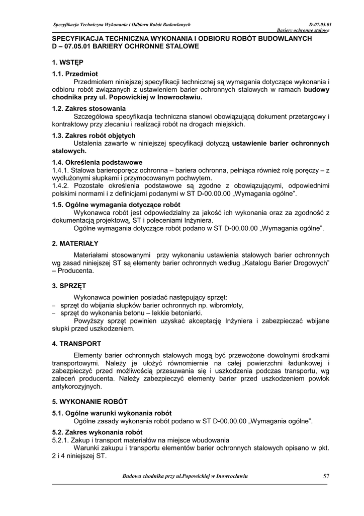 Specyfikacja Techniczna Wykonania i Odbioru Robót Budowlanych D-07.05.01 Bariery ochronne stalowe SPECYFIKACJA TECHNICZNA WYKONANIA I ODBIORU ROBÓT BUDOWLANYCH D – 07.05.01 BARIERY OCHRONNE STALOWE 1. WSTĘP 1.1. Przedmiot Przedmiotem niniejszej specyfikacji technicznej są wymagania dotyczące wykonania i odbioru robót związanych z ustawieniem barier ochronnych stalowych w ramach budowy chodnika przy ul. Popowickiej w Inowrocławiu. 1.2. Zakres stosowania Szczegółowa specyfikacja techniczna stanowi obowiązującą dokument przetargowy i kontraktowy przy zlecaniu i realizacji robót na drogach miejskich. 1.3. Zakres robót objętych Ustalenia zawarte w niniejszej specyfikacji dotyczą ustawienie barier ochronnych stalowych. 1.4. Określenia podstawowe 1.4.1. Stalowa barieroporęcz ochronna – bariera ochronna, pełniąca równieŜ rolę poręczy – z wydłuŜonymi słupkami i przymocowanym pochwytem. 1.4.2. Pozostałe określenia podstawowe są zgodne z obowiązującymi, odpowiednimi polskimi normami i z definicjami podanymi w ST D-00.00.00 „Wymagania ogólne”. 1.5. Ogólne wymagania dotyczące robót Wykonawca robót jest odpowiedzialny za jakość ich wykonania oraz za zgodność z dokumentacją projektową, ST i poleceniami InŜyniera. Ogólne wymagania dotyczące robót podano w ST D-00.00.00 „Wymagania ogólne”. 2. MATERIAŁY Materiałami stosowanymi przy wykonaniu ustawienia stalowych barier ochronnych wg zasad niniejszej ST są elementy barier ochronnych według „Katalogu Barier Drogowych” – Producenta. 3. SPRZĘT Wykonawca powinien posiadać następujący sprzęt: − sprzęt do wbijania słupków barier ochronnych np. wibromłoty, − sprzęt do wykonania betonu – lekkie betoniarki. PowyŜszy sprzęt powinien uzyskać akceptację InŜyniera i zabezpieczać wbijane słupki przed uszkodzeniem. 4. TRANSPORT Elementy barier ochronnych stalowych mogą być przewoŜone dowolnymi środkami transportowymi. NaleŜy je ułoŜyć równomiernie na całej powierzchni ładunkowej i zabezpieczyć przed moŜliwością przesuwania się i uszkodzenia podczas transportu, wg zaleceń producenta. NaleŜy zabezpieczyć elementy barier przed uszkodzeniem powłok antykorozyjnych. 5. WYKONANIE ROBÓT 5.1. Ogólne warunki wykonania robót Ogólne zasady wykonania robót podano w ST D-00.00.00 „Wymagania ogólne”. 5.2. Zakres wykonania robót 5.2.1. Zakup i transport materiałów na miejsce wbudowania Warunki zakupu i transportu elementów barier ochronnych stalowych opisano w pkt. 2 i 4 niniejszej ST. Budowa chodnika przy ul.Popowickiej w Inowrocławiu 57 Specyfikacja Techniczna Wykonania i Odbioru Robót Budowlanych D-07.05.01 Bariery ochronne stalowe 5.2.2. Osadzenie i zmontowanie stalowych barier ochronnych PowyŜsze prace naleŜy wykonać zgodnie z instrukcją (zaleceniami) producenta barier. Roboty wykonywać w taki sposób, aby nie uszkodzić zabezpieczeń antykorozyjnych. 5.2.3. Wykonanie zakończeń barier ochronnych Na końcach bariee wykonać odcinki początkowe i końcowe o długościach zgodnych z Wytycznymi, wpuszczone w ziemię, przy rozstawie słupków co 2,0 m lub co 4,0 m. 6. KONTROLA JAKOŚCI ROBÓT 6.1. Ogólne zasady kontroli jakości robót Ogólne zasady kontroli jakości robót podano w ST D-00.00.00 „Wymagania ogólne”. 6.2. Kontrola montaŜu barier polega na: - sprawdzeniu jakości elementów składowych barier, - sprawdzenie geodezyjnym rzędnych taśmy i jej przebiegu w planie, - kontrola powłok antykorozyjnych, - sprawdzeniu łączników taśmy i słupków. 6.3. Dopuszczalne tolerancje - dopuszczalna technologicznie odchyłka odległości między słupkami, wynikająca z wymiarów wydłuŜonych otworów w prowadnicy, słuŜących do zamocowania słupków, wynosi ± 11 mm, - dopuszczalna róŜnica wysokości słupków, decydująca czy prowadnica będzie zamocowana równolegle do nawierzchni jezdni, jest wyznaczona kształtem i wymiarami otworów w słupkach do mocowania wysięgników lub przekładek wynosi ± 6 mm, - rzędna góry taśmy bariery - ± 5 mm, - odchylenie taśmy bariery w planie ± 10 mm. 7. OBMIAR ROBÓT Jednostką obmiarową jest m (metr) ustawionych stalowych barier ochronnych zgodnie z Dokumentacją Projektową i pomiarem w terenie. 8. ODBIÓR ROBÓT Ogólne zasady odbioru robót podano w ST D-00.00.00 „Wymagania ogólne”. 9. PODSTAWA PŁATNOŚCI Płatność będzie za metr ustawionych barier ochronnych zgodnie z obmiarem z uwzględnieniem ewentualnych potrąceń. Cena wykonania 1 m barier ochronnych obejmuje: − zakup i transport elementów barier ochronnych na miejsce wbudowania,, − wytyczenie odcinków ustawienia barier wraz z miejscami osadzenia słupków, − oznakowanie robót prowadzonych w pasie drogowym, − wbicie słupków barier ochronnych, − montaŜ taśmy profilowej oraz innych elementów barier, − usunięcie poza pas drogowy zbędnych materiałów, − wykonanie niezbędnych badań i pomiarów przewidzianych w specyfikacji. 10. PRZEPISY ZWIĄZANE Wytyczne stosowania drogowych barier ochronnych. Ministerstwo Komunikacji – Generalna Dyrekcja Dróg Publicznych. Katalog Drogowych Barier Ochronnych. Producent. Budowa chodnika przy ul.Popowickiej w Inowrocławiu 58
