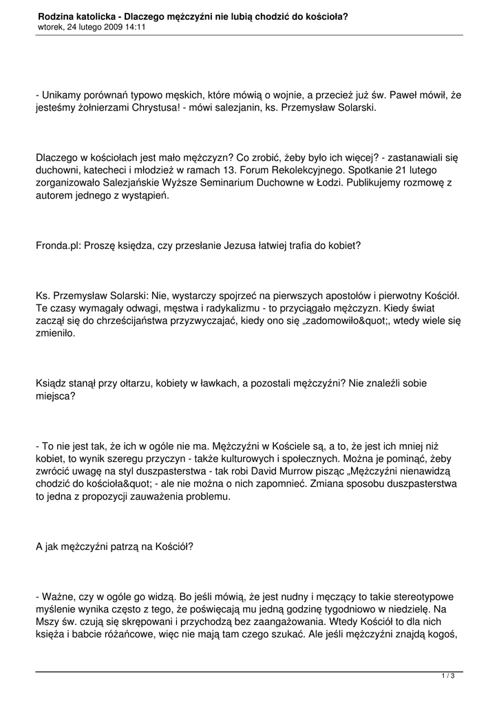 Rodzina katolicka - Dlaczego mężczyźni nie lubią chodzić do kościoła? wtorek, 24 lutego 2009 14:11 - Unikamy porównań typowo męskich, które mówią o wojnie, a przecież już św. Paweł mówił, że jesteśmy żołnierzami Chrystusa! - mówi salezjanin, ks. Przemysław Solarski. Dlaczego w kościołach jest mało mężczyzn? Co zrobić, żeby było ich więcej? - zastanawiali się duchowni, katecheci i młodzież w ramach 13. Forum Rekolekcyjnego. Spotkanie 21 lutego zorganizowało Salezjańskie Wyższe Seminarium Duchowne w Łodzi. Publikujemy rozmowę z autorem jednego z wystąpień. Fronda.pl: Proszę księdza, czy przesłanie Jezusa łatwiej trafia do kobiet? Ks. Przemysław Solarski: Nie, wystarczy spojrzeć na pierwszych apostołów i pierwotny Kościół. Te czasy wymagały odwagi, męstwa i radykalizmu - to przyciągało mężczyzn. Kiedy świat zaczął się do chrześcijaństwa przyzwyczajać, kiedy ono się „zadomowiło", wtedy wiele się zmieniło. Ksiądz stanął przy ołtarzu, kobiety w ławkach, a pozostali mężczyźni? Nie znaleźli sobie miejsca? - To nie jest tak, że ich w ogóle nie ma. Mężczyźni w Kościele są, a to, że jest ich mniej niż kobiet, to wynik szeregu przyczyn - także kulturowych i społecznych. Można je pominąć, żeby zwrócić uwagę na styl duszpasterstwa - tak robi David Murrow pisząc „Mężczyźni nienawidzą chodzić do kościoła" - ale nie można o nich zapomnieć. Zmiana sposobu duszpasterstwa to jedna z propozycji zauważenia problemu. A jak mężczyźni patrzą na Kościół? - Ważne, czy w ogóle go widzą. Bo jeśli mówią, że jest nudny i męczący to takie stereotypowe myślenie wynika często z tego, że poświęcają mu jedną godzinę tygodniowo w niedzielę. Na Mszy św. czują się skrępowani i przychodzą bez zaangażowania. Wtedy Kościół to dla nich księża i babcie różańcowe, więc nie mają tam czego szukać. Ale jeśli mężczyźni znajdą kogoś, 1/3 Rodzina katolicka - Dlaczego mężczyźni nie lubią chodzić do kościoła? wtorek, 24 lutego 2009 14:11 z kim mogą się utożsamiać w Kościele, to chętnie zostają. Wizerunek to jedno, inna sprawa to kwestia osobistej wiary. Kim mają być takie osoby? - Pomijając księży. Dużo zdziałać mogą świeccy liderzy, którymi stają się mężczyźni. Przywództwo duchowe to dziedzina, która także powinna zostać w końcu odkryta przez świeckich - przecież przewodnikami duchowymi nie muszą być wyłącznie księża. Zwłaszcza jeśli chodzi o przekazywanie wiary innym mężczyznom i młodym chłopakom. Mężczyźni głoszą Chrystusa w inny sposób - w rywalizacji sportowej, na obozach przetrwania, na świeżym powietrzu - takie duszpasterstwo poza murami kościoła. Czy kobiety nie robią obecnie za mężczyzn zbyt dużo? - Oczywiście. Po pierwsze, mężczyźni nie przyjdą do świątyni, jeśli będą tam same kobiety - to będzie „babska sprawa". Po drugie, przyzwyczaili się, że wszystko za nich robią kobiety i księża. To duchowni głownie organizują obozy wakacyjne, rekolekcje. Tymczasem to powinni robić właśnie świeccy mężczyźni. Na przykład tak, jak pan Ryszard Sadłoń, który uczestniczył w naszym Forum Rekolekcyjnym. Co roku organizuje on pielgrzymkę kibiców piłkarskich do Piekar Śląskich. Jest jeszcze trzecia sprawa. Dając mężczyznom zadanie, trzeba zaufać, że im się powiedzie. Często faceci się wycofują z obawy, że nie zorganizują czegoś tak, jak dotychczas robiły to kobiety i to będzie źle. Nic bardziej błędnego, trzeba dać im działać po swojemu. Po męsku. Jaka jest więc recepta na sukces. Na powrót mężczyzn do Kościoła, ale także sposób na to, żeby z niego nie uciekali? - Najprostsza rada to stawiać na duszpasterstwo. W kazaniach unikamy porównań typowo męskich, takich, które mówią o wojnie, a przecież już św. Paweł mówił, że jesteśmy żołnierzami Chrystusa! Boimy się w ten sposób mówić. Tymczasem potrzeba porównań dostosowanych do psychiki mężczyzn - prostych, konkretnych i nienapuszonych. Na pewno można mówić tak, żeby do nich trafiać. Warunek? Trzeba tego chcieć. 2/3 Rodzina katolicka - Dlaczego mężczyźni nie lubią chodzić do kościoła? wtorek, 24 lutego 2009 14:11 Rozmawiała Agnieszka Jaworska. Źródło: Fronda.pl 3/3