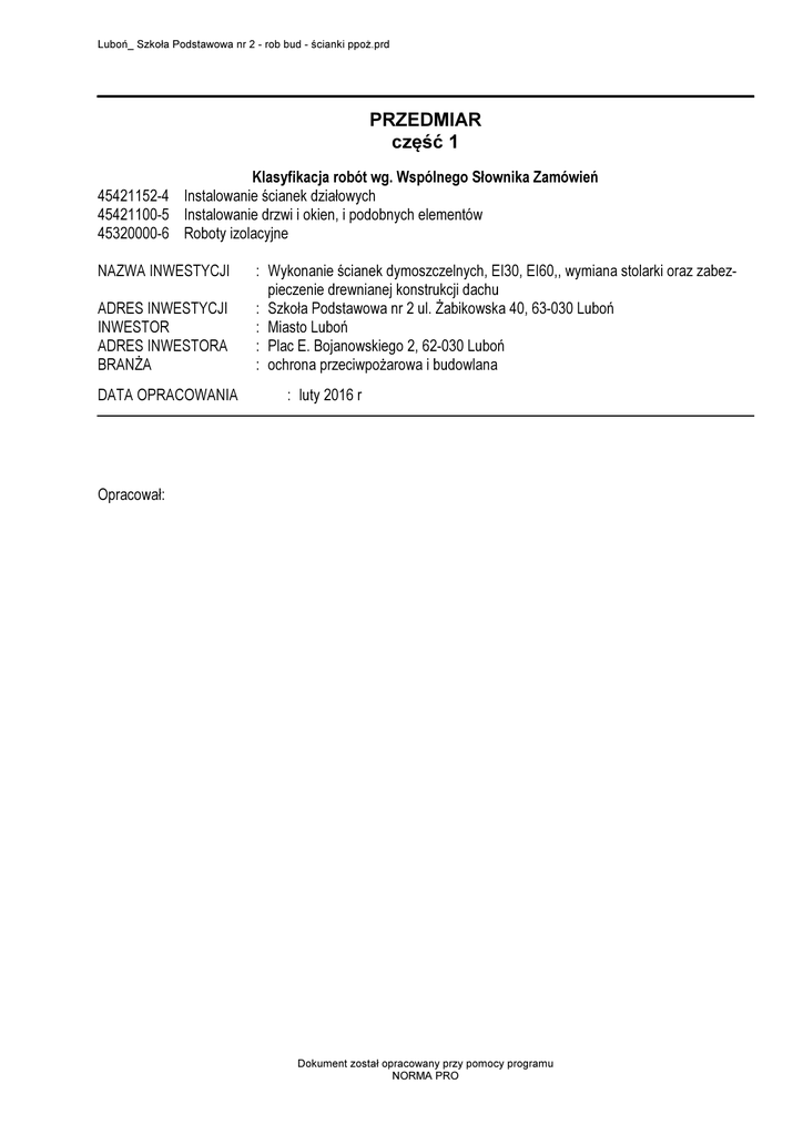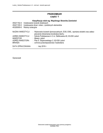 Luboń_ Szkoła Podstawowa nr 2 - rob bud - ścianki ppoż.prd PRZEDMIAR część 1 Klasyfikacja robót wg. Wspólnego Słownika Zamówień 45421152-4 Instalowanie ścianek działowych 45421100-5 Instalowanie drzwi i okien, i podobnych elementów 45320000-6 Roboty izolacyjne NAZWA INWESTYCJI ADRES INWESTYCJI INWESTOR ADRES INWESTORA BRANŻA DATA OPRACOWANIA : Wykonanie ścianek dymoszczelnych, EI30, EI60,, wymiana stolarki oraz zabezpieczenie drewnianej konstrukcji dachu : Szkoła Podstawowa nr 2 ul. Żabikowska 40, 63-030 Luboń : Miasto Luboń : Plac E. Bojanowskiego 2, 62-030 Luboń : ochrona przeciwpożarowa i budowlana : luty 2016 r Opracował: Dokument został opracowany przy pomocy programu NORMA PRO Luboń_ Szkoła Podstawowa nr 2 - rob bud - ścianki ppoż.prd DZIAŁY PRZEDMIARU Lp. 1 2 3 4 5 Nazwa działu Drzwi aluminiowe, dymoszczelne i EI 60 - parter i piętro Drzwi stalowe w klasie ogniowej EI 30 - poddasze Schody strychowe EI45 Zabezpieczenia i usunięcia materiałów z rozbiórki Zabezpieczenie konstrukcji drwenianej dachu części "starej szkoły" -2- Norma PRO Wersja 4.48 Nr seryjny: 23751 Od 1 14 19 24 28 Do 13 18 23 27 31 Luboń_ Szkoła Podstawowa nr 2 - rob bud - ścianki ppoż.prd PRZEDMIAR Lp. Podstawa 1 1 KNR 4-01 d.1 0354-05 Opis i wyliczenia Drzwi aluminiowe, dymoszczelne i EI 60 - parter i piętro Wykucie z muru ościeżnic drewnianych o powierzchni ponad 2 m2 Parter Drzwi DW5 1,96*2,45 Piętro Drzwi D1W5 1,96*2,18 2 KNR 4-01 d.1 0812-03 analogia 3 KNR 4-01 d.1 0811-07 4 KNR 4-01 d.1 0354-11 analogia 5 KNNR 7 d.1 0503-08 6 KNNR 7 d.1 0503-08 7 KNNR 7 d.1 0503-08 8 KNNR 7 d.1 0503-08 9 KNNR 7 d.1 0505-01 j.m. m2 4,802 m2 4,273 1,00+1,00+1,00+1,00+1,00 m Rozebranie posadzki z płytek gres m2 0,98+0,85+0,98+1,02 m2 Wykucie listew stalowych podłogowych m 1,70+1,75 m Drzwi przymykowe dwuskrzydłowe aluminiowe w parterze oznaczone wg projektu jako DW5, dymoszczelne i EI 60, parametry techniczno jakościowe wg projektu 1,96*2,28*1<szt> m2 Drzwi przymykowe dwuskrzydłowe aluminiowe w parterze oznaczone wg projektu jako DW6, EI 60, parametry techniczno jakościowe wg projektu 1,70*2,28*1<szt> m2 m2 m2 Drzwi przymykowe dwuskrzydłowe aluminiowe na piętrze oznaczone wg pro- m2 jektu jako D1W5, dymoszczelne i EI 60, parametry techniczno jakościowe wg projektu 1,96*2,18*1<szt> m2 Drzwi przymykowe dwuskrzydłowe aluminiowe na piętrze oznaczone wg projektu jako D1W6, EI 60, parametry techniczno jakościowe wg projektu 1,73*2,27*1<szt> 9,075 5,000 RAZEM 5,000 3,830 RAZEM 3,830 3,450 RAZEM 3,450 4,469 RAZEM 4,469 3,876 RAZEM 3,876 4,273 RAZEM 4,273 3,927 RAZEM 3,927 4,835 RAZEM 4,835 3,830 RAZEM 3,830 5,000 RAZEM 5,000 3,580 RAZEM 3,580 85,000 RAZEM 85,000 m2 m2 Przegroda aluminiowa z profili powlekanych z drzwiami - drzwi na piętrze m2 oznaczone jako D1W10, dymoszczelne , parapetry techniczno jakościowe wg projektu 2,13*2,27*1<szt> m2 m 12 KNR 0-14 d.1 2011-09 m2 15 KNR 4-01 d.2 0354-11 analogia RAZEM Demontaż cokolików o długości do 1 m w jednym miejscu z płytek gres ( do R m monoznik 0,5 , bez nakładów M) 11 NNRNKB (z.VI) Cokoliki z płytek kamionkowych GRES na zaprawie klejowej - uzupełd.1 202 2809-01 nienie po montażu drzwi ( do R mnożnik 1,50) poz.2 2 14 KNR 4-01 d.2 0354-05 Razem m2 10 NNRNKB (z.VI) Posadzki jednobarwne z płytek kamionkowych GRES na zaprawie klejo- m2 d.1 202 2805-04 wej - uzupełnienie posadzki po montazu drzwi (do R mnożnik 1,50) poz.3 m2 13 KNNR 3 d.1 0605-04 Poszcz. Obudowa płytami gipsowo - kartonowymi np. Glasroc F (Ridurit) na rusztach metalowych, wypełninie wełną mineralną - uzupełninie ścianki nad drzwiami EI 60 i dymoszczelne 0,33*2+0,98+1,115+0,825 m m2 Dwukrotne malowanie tynków wewnętrznych ścian i sufitów farbą lateksową z m2 przygotowaniem powierzchni 85,00 m2 Drzwi stalowe w klasie ogniowej EI 30 - poddasze Wykucie z muru ościeżnic drewnianych o powierzchni ponad 2 m2 m2 Poddasze 1,10*2,10*2 m2 Wykucie listew stalowych podłogowych m 1,00*2 m -3- Norma PRO Wersja 4.48 Nr seryjny: 23751 4,620 RAZEM 4,620 2,000 RAZEM 2,000 Luboń_ Szkoła Podstawowa nr 2 - rob bud - ścianki ppoż.prd PRZEDMIAR Lp. Podstawa 16 KNR 4-01 d.2 0818-04 analogia Opis i wyliczenia j.m. Demontaż i ponowny montaż po osadzeniu nowych drzwi listew przyściennych miejsc. PCW o długości do 1.0 m w jednym miejscu 2,00 17 KNR 2-02 d.2 1204-05 analogia miejsc. 3 19 KNR 4-01 d.3 0432-02 analogia 20 KNR 4-01 d.3 0429-06 analogia 23 KNNR 3 d.3 0605-04 27 KNR 4-01 d.4 0108-10 m2 2,089 szt. 1,00 szt. Rozebranie zabudowy z płyt gipsowo-kartonowych i płyt OSB z częścowym zdjęciem wełny mineralnej (do R mnożnik 1,50) m2 4,37+2,28 m2 2,000 szt Dwukrotne malowanie w/w powierzchni farbą emulsyjną z przygotowaniem po- m2 wierzchni 4,50 m2 Usunięcie z budynku materiałow i odpadów z rozbiórki 5 Zabezpieczenie konstrukcji drwenianej dachu części "starej szkoły" 28 KNR-W 4-01 Zabezpieczenie podłóg i innych elementów folią d.5 1216-01 250,00 -4- Norma PRO Wersja 4.48 Nr seryjny: 23751 4,189 8,500 RAZEM 8,500 1,000 RAZEM 1,000 6,650 RAZEM 6,650 1,000 RAZEM 1,000 6,650 RAZEM 6,650 4,500 RAZEM 4,500 80,000 RAZEM 80,000 m2 m2 m3 m3 m3 m3 1,361 0,462 0,240 m3 1,500 m3 1,500 Wywiezienie gruzu spryzmowanego samochodami skrzyniowymi na odległość m3 do 1 km ( z opłatą za składowanie i utylizację na składowisku odpadów) poz.25 m3 Wywiezienie gruzu spryzmowanego samochodami skrzyniowymi - za każdy następny 1 km Krotność = 9 poz.26 RAZEM szt Obudowa płytami gipsowo - kartonowymi 12,5 mm np. Glasroc F (Ridurit) i m2 płytą OSB na rusztach metalowych, wypełnienie wełną mineralną -uzupełninie zabudowy schodów 4,37+2,28 m2 istniejace drzwi i schodów 9,075*0,15 4,62*0,10 1,20*0,20 płytki cokoliki i listwy 1,50 pozostałe 1,50 26 KNR 4-01 d.4 0108-09 2,100 Schody strychowe EI45 Demontaz istniejących schodów strychowych drewnianych 4 Zabezpieczenia i usunięcia materiałów z rozbiórki 24 KNR-W 4-01 Zabezpieczenie podłóg fol