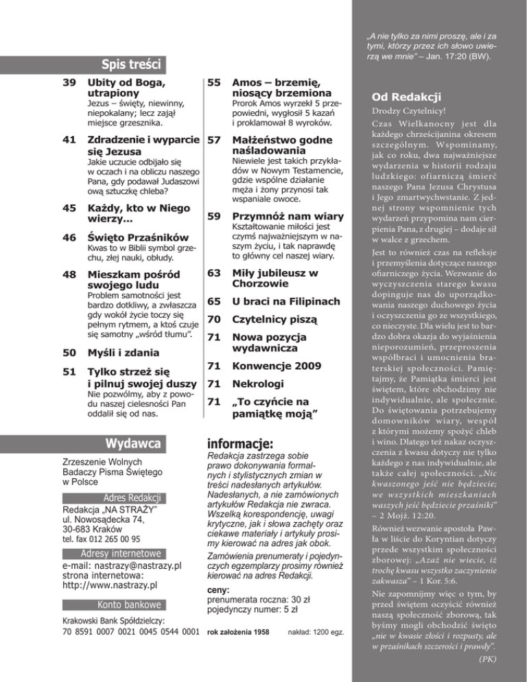 „A nie tylko za nimi proszę, ale i za tymi, którzy przez ich słowo uwierzą we mnie” – Jan. 17:20 (BW). Spis treści 39 Ubity od Boga, utrapiony 55 Jezus – święty, niewinny, niepokalany; lecz zajął miejsce grzesznika. 41 Prorok Amos wyrzekł 5 przepowiedni, wygłosił 5 kazań i proklamował 8 wyroków. Zdradzenie i wyparcie 57 się Jezusa Małżeństwo godne naśladowania Każdy, kto w Niego wierzy... Przymnóż nam wiary Jakie uczucie odbijało się w oczach i na obliczu naszego Pana, gdy podawał Judaszowi ową sztuczkę chleba? 45 46 48 Amos – brzemię, niosący brzemiona 59 Święto Przaśników Kwas to w Biblii symbol grzechu, złej nauki, obłudy. Mieszkam pośród swojego ludu Problem samotności jest bardzo dotkliwy, a zwłaszcza gdy wokół życie toczy się pełnym rytmem, a ktoś czuje się samotny „wśród tłumu”. Miły jubileusz w Chorzowie 65 U braci na Filipinach 70 Czytelnicy piszą 71 Nowa pozycja wydawnicza Myśli i zdania 51 71 Tylko strzeż się i pilnuj swojej duszy 71 Wydawca Zrzeszenie Wolnych Badaczy Pisma Świętego w Polsce Adres Redakcji Redakcja „NA STRAŻY” ul. Nowosądecka 74, 30-683 Kraków tel. fax 012 265 00 95 Adresy internetowe e-mail: [email protected] strona internetowa: http://www.nastrazy.pl Konto bankowe Kształtowanie miłości jest czymś najważniejszym w naszym życiu, i tak naprawdę to główny cel naszej wiary. 63 50 Nie pozwólmy, aby z powodu naszej cielesności Pan oddalił się od nas. Niewiele jest takich przykładów w Nowym Testamencie, gdzie wspólne działanie męża i żony przynosi tak wspaniale owoce. 71 Konwencje 2009 Nekrologi „To czyńcie na pamiątkę moją” informacje: Redakcja zastrzega sobie prawo dokonywania formalnych i stylistycznych zmian w treści nadesłanych artykułów. Nadesłanych, a nie zamówionych artykułów Redakcja nie zwraca. Wszelką korespondencję, uwagi krytyczne, jak i słowa zachęty oraz ciekawe materiały i artykuły prosimy kierować na adres jak obok. Zamówienia prenumeraty i pojedynczych egzemplarzy prosimy również kierować na adres Redakcji. ceny: prenumerata roczna: 30 zł pojedynczy numer: 5 zł Krakowski Bank Spółdzielczy: 70 8591 0007 0021 0045 0544 0001 rok założenia 1958 nakład: 1200 egz. Od Redakcji Drodzy Czytelnicy! Czas Wielkanocny jest dla każdego chrześcijanina okresem szczególnym. Wspominamy, jak co roku, dwa najważniejsze wydarzenia w historii rodzaju ludzkiego: ofiarniczą śmierć naszego Pana Jezusa Chrystusa i Jego zmartwychwstanie. Z jednej strony wspomnienie tych wydarzeń przypomina nam cierpienia Pana, z drugiej – dodaje sił w walce z grzechem. Jest to również czas na refleksje i przemyślenia dotyczące naszego ofiarniczego życia. Wezwanie do wyczyszczenia starego kwasu dopinguje nas do uporządkowania naszego duchowego życia i oczyszczenia go ze wszystkiego, co nieczyste. Dla wielu jest to bardzo dobra okazja do wyjaśnienia nieporozumień, przeproszenia współbraci i umocnienia braterskiej społeczności. Pamiętajmy, że Pamiątka śmierci jest świętem, które obchodzimy nie indywidualnie, ale społecznie. Do świętowania potrzebujemy domowników wiary, wespół z którymi możemy spożyć chleb i wino. Dlatego też nakaz oczyszczenia z kwasu dotyczy nie tylko każdego z nas indywidualnie, ale także całej społeczności. „Nic kwaszonego jeść nie będziecie; we wszystkich mieszkaniach waszych jeść będziecie przaśniki” – 2 Mojż. 12:20. Również wezwanie apostoła Pawła w liście do Koryntian dotyczy przede wszystkim społeczności zborowej: „Azaż nie wiecie, iż trochę kwasu wszystko zaczynienie zakwasza” – 1 Kor. 5:6. Nie zapomnijmy więc o tym, by przed świętem oczyścić również naszą społeczność zborową, tak byśmy mogli obchodzić święto „nie w kwasie złości i rozpusty, ale w przaśnikach szczerości i prawdy”. (PK) Na Straży 2/2009 39 Ubity od Boga, utrapiony WATCH TOWER ŚWIĘTY ZAJĄŁ MIEJSCE GRZESZNIKA „Zaiste on niemocy nasze wziął na się, a boleści nasze własne nosił, a myśmy mniemali, że jest zraniony, ubity od Boga i utrapiony” – Izaj. 53:4 (BG). Ewangelia św. Marka 15:22-37 N ie ma miejsca na żadną dysputę co do faktów połączonych z ukrzyżowaniem Jezusa; jedyna dysputa mogłaby być względem Boskiego ograniczenia i powodu do tegoż ukrzyżowania. Prorok Izajasz daje nam Boskie wyjaśnienie tej sprawy. Droga krzyżowa Zbawiciel został znacznie osłabiony swoją trzy i pół letnią misją, podczas której wydawał swoją żywotność na korzyść ludu, lecząc ich niemoce i choroby. Ponadto był On w ustawicznym napięciu i bez spoczynku od chwili, gdy wysłał uczniów, aby przygotowali baranka. Okres ten obejmował doświadczenia połączone z przygotowaniem baranka i ustanowieniem Pamiątkowej Wieczerzy, podróż do Getsemane, srogie mocowanie się i umysłowe cierpienia tamże, doświadczenia następne, przesłuchanie przed Sanhedrynem, przesłuchanie przed Herodem i przed Piłatem itd.; wszystko to było ustawicznym obciążeniem dla naszego Pana. A na koniec, skazany na ukrzyżowanie przez tych, dla których poświęcił swoje niebieskie mieszkanie i chwałę, musiał jeszcze dźwigać krzyż, na którym miał zawisnąć. Dźwigał go tak długo, aż wyczerpany upadł pod jego ciężarem i przechodzący rolnik był zmuszony Mu pomóc – czy przez niesienie całego krzyża, czy też przez postępowanie za Jezusem i niesienie pewnej jego części, nie jest wyraźnie zaznaczone w oryginalnym tekście. Gdzież byli Piotr, Jan, Jakub, Tomasz i inni apostołowie, że nie pospieszyli z pomocą. Z pewnością strach wstrzymał ich od tego. Jakie wielkie błogosławieństwo przez to utracili! Tradycja podaje, że ów cyrenejski rolnik, który zmuszony był nieść krzyż, później został naśladowcą Nazarejczyka, albowiem doświadczenie tej godziny tak głęboko wyryło na jego sercu prawdziwość poselstwa Chrystusowego. Cisnąc się w